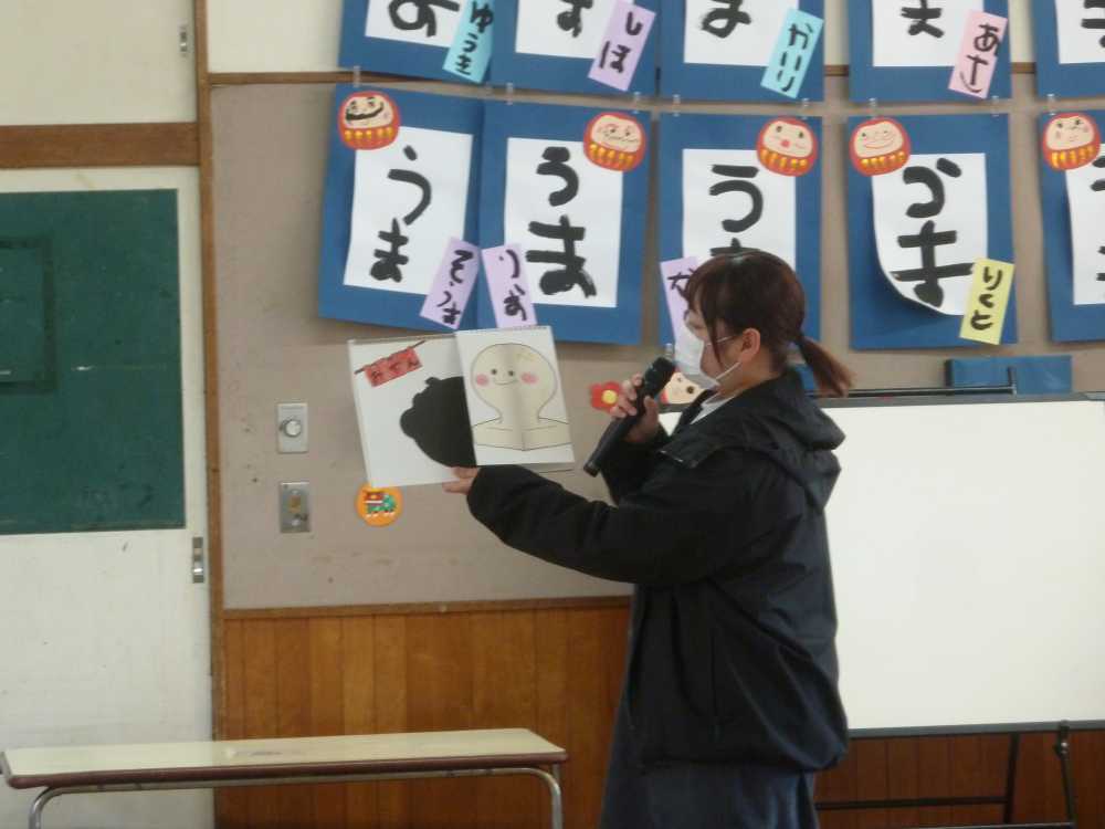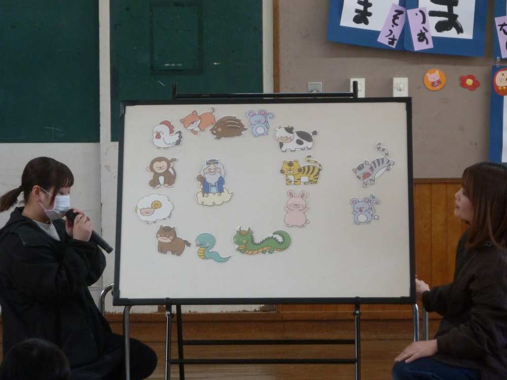 12支のお話です。どうして12支があるのかをお話を交えて子供たちにわかりやすく話してくれました。「にじ組さんとほし組さんはは何どしかな??」という保育士の問いにみんな元気に答えてくれていました。