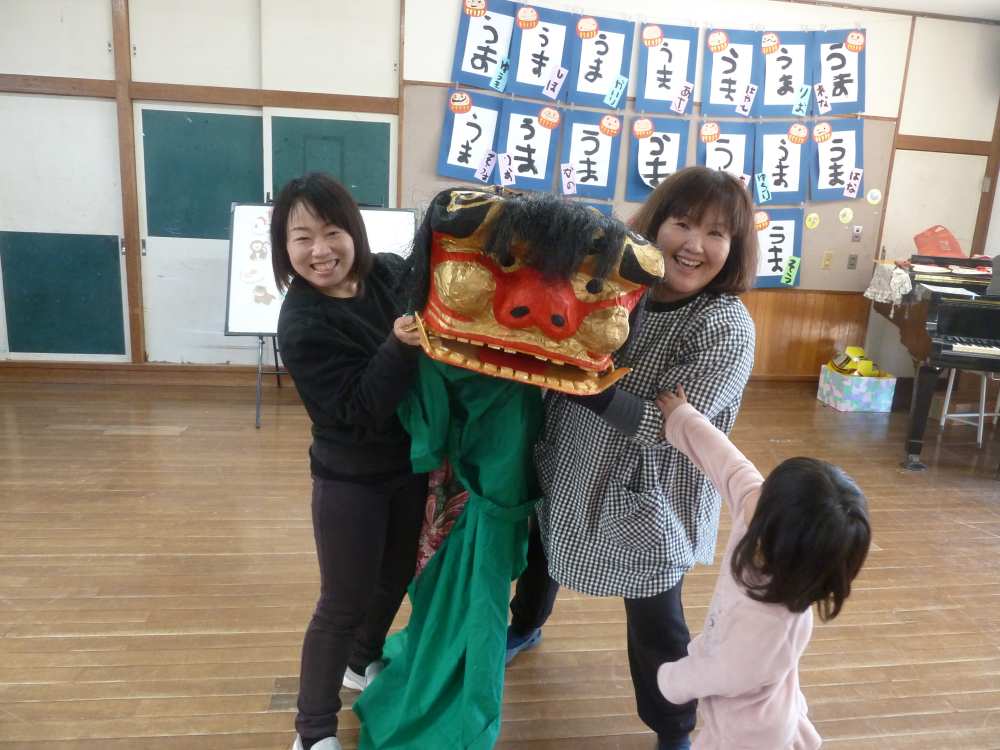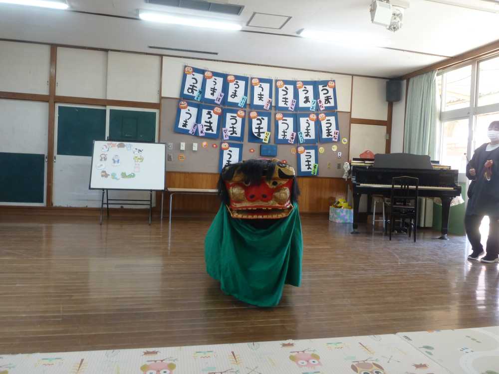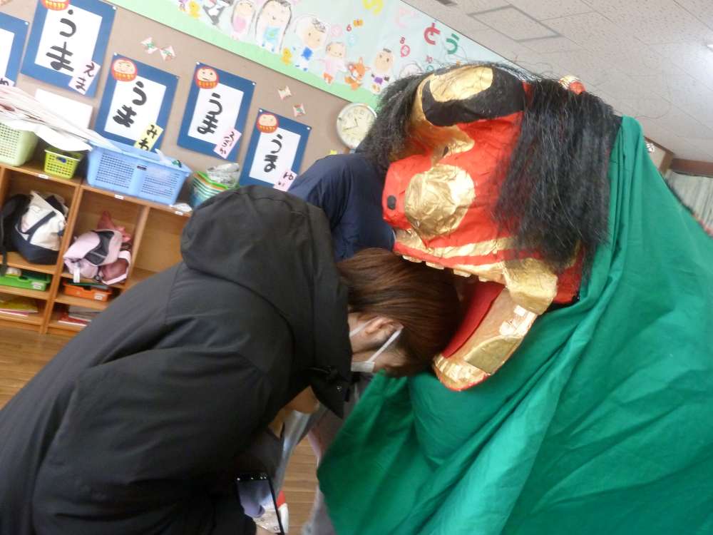 獅子舞の中にはみんなの大好きな先生が入っていましたよ。いつもの先生だ全然怖くないね。