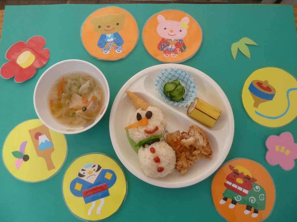 本日のメニューは雪だるまライス 魚のから揚げ 胡瓜の甘酢漬け コンソメスープ バナナ でした。雪だるまがかわいくてみんな大喜びでした。