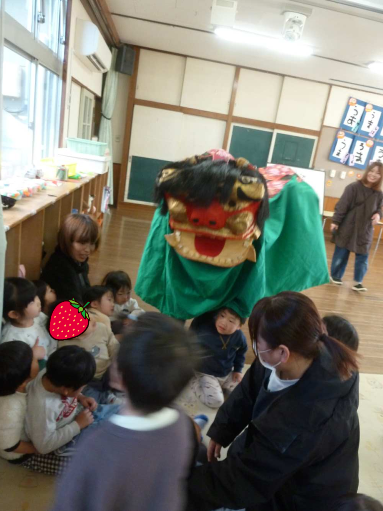 獅子舞の登場です。子どもたちは朝から少し怖そうにしていました。獅子舞さんに頭をかじってもらうといいことがあるんだよ。と話していたので泣きながらも頭をかじってもらう子もいましたよ。怖い気持ちを振り絞って頑張っていました。