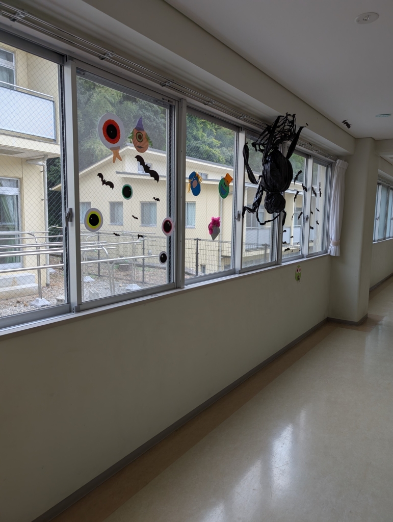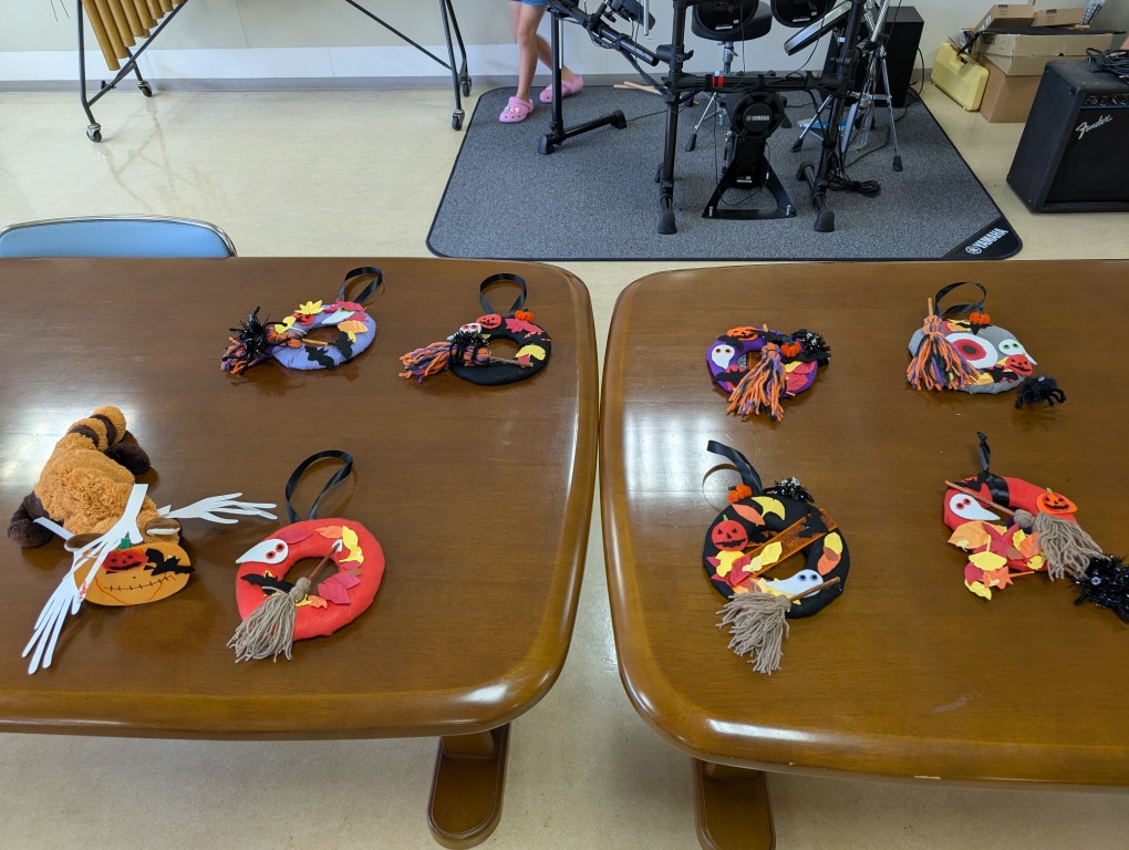 こうもりやお化けの飾りを作ってきてくださり、好きな色のリースに貼り付けました。