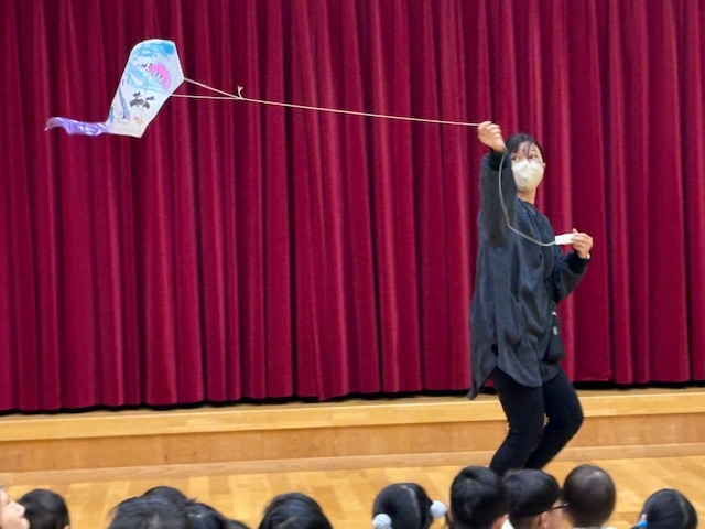 年長さんの作った凧を担任が紹介。ひろーい所で揚げるのが楽しみです。