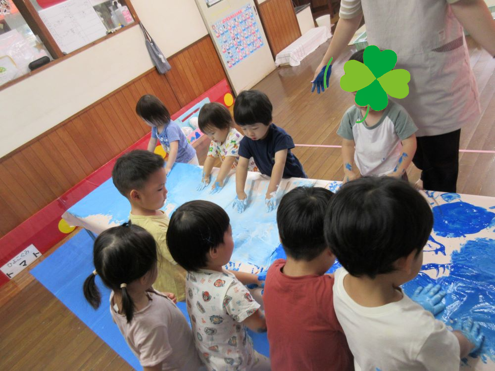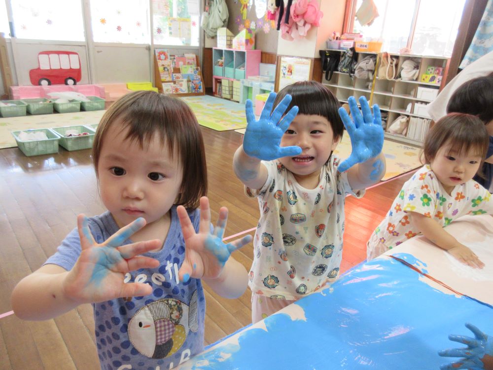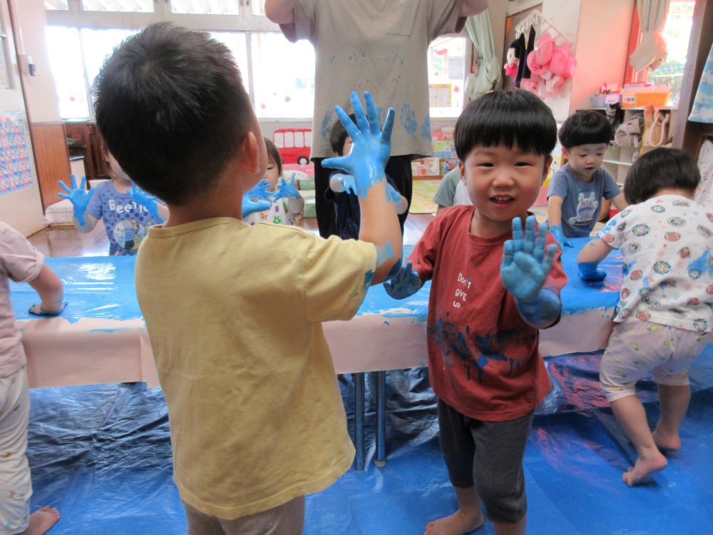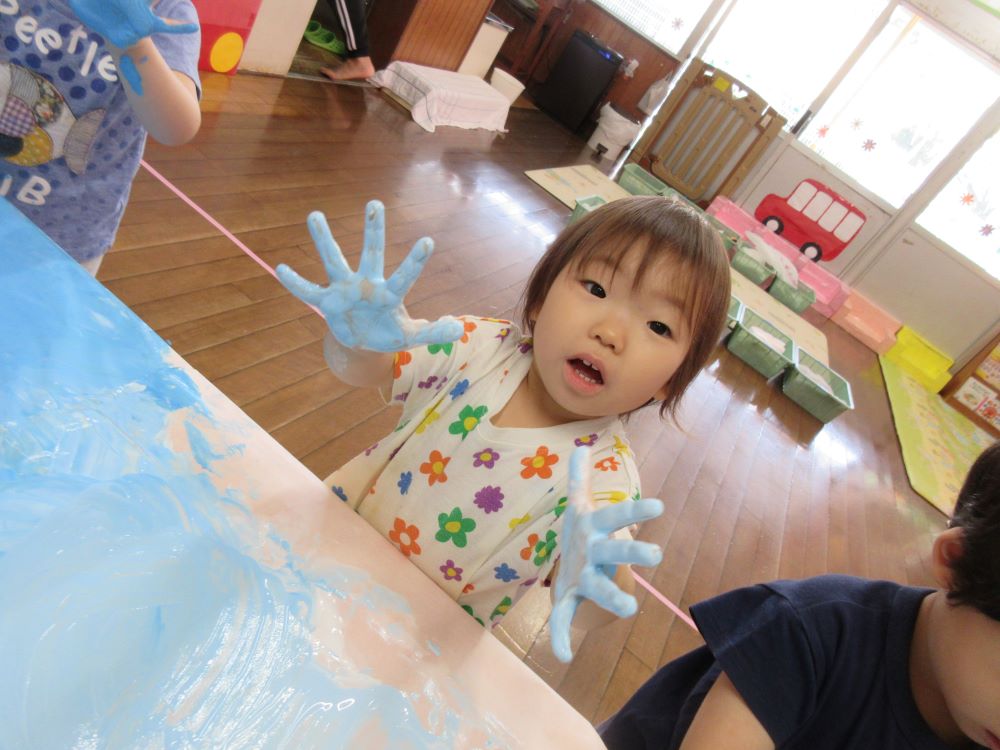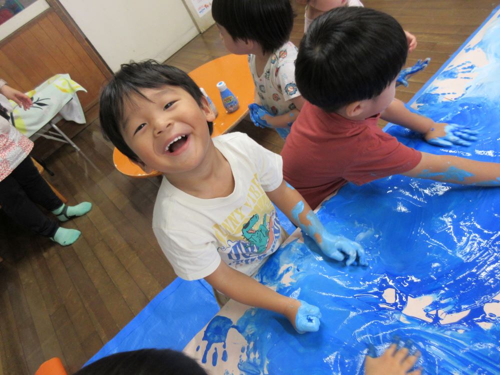 みんなえのぐに夢中です。「海のなかだよ~」と保育士がいうと子どもたちは 絵の具をぐるぐる混ぜて波にみたてたりしていました。ぐるぐる~~