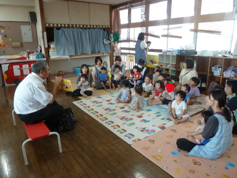こどものとも社さんによる 読み聞かせをしてもらいました。乳児組(0歳1歳2歳) 3歳児(ほし組)4歳5歳(にじ組)に分かれて絵本を読んでもらいました。また絵本については高知にゆかりのある作家さんを選んでくれていました。どんな絵本を読んでくれるか子どもたちも楽しみにしているようでした。