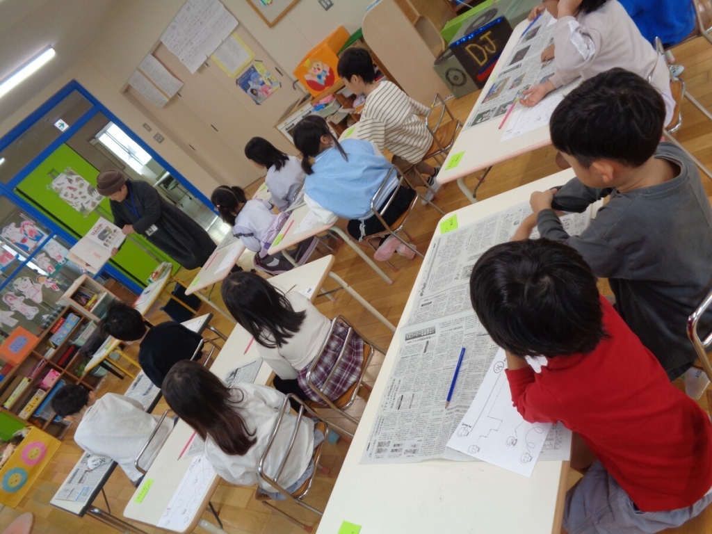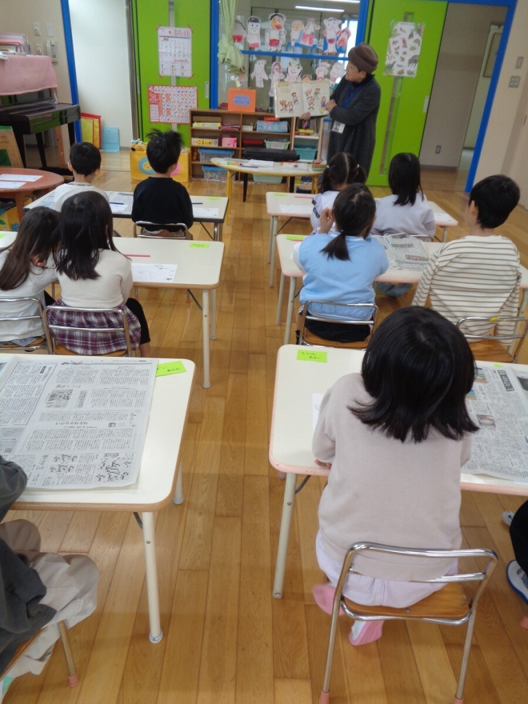 「文字が読めないとこんな新聞も読めないのよ。文字が読めるようになるといいことがいっぱい。みんなが知ってる文字があるかな?探してみてね」みんなは小さい文字や大きい文字から、自分の知ってる文字を探しました。