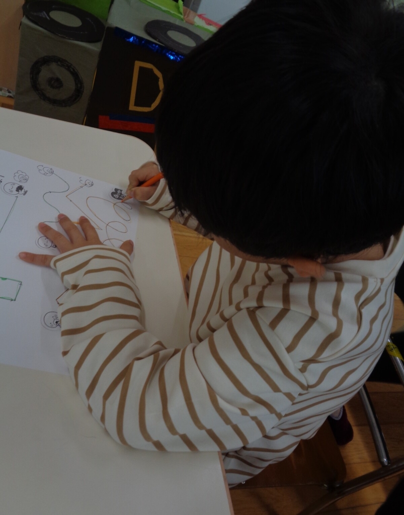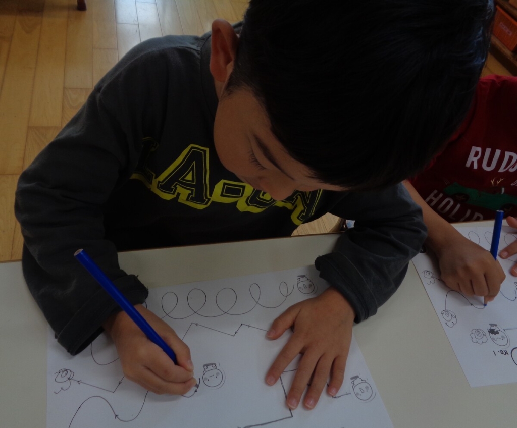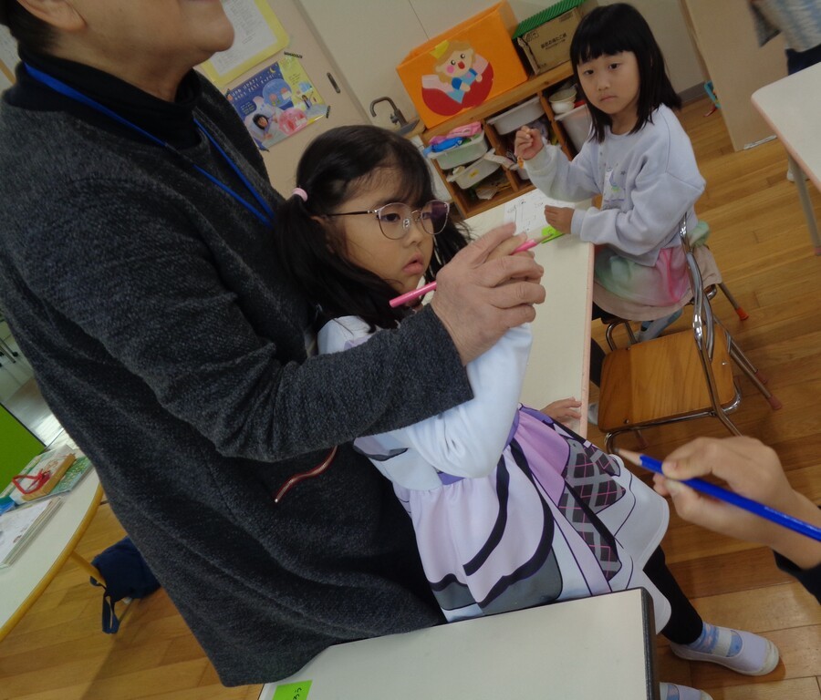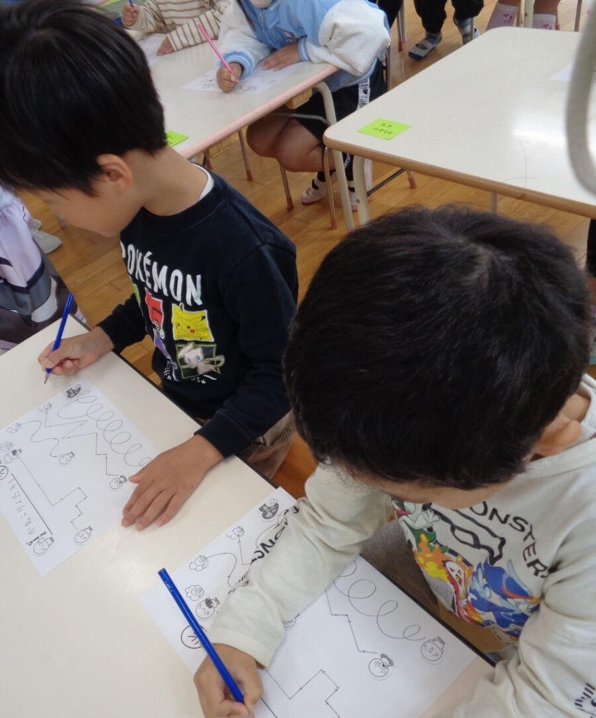 その後は、鉛筆の持ち方を教えてもらって、先生が作ってくれたプリント2枚を、みんなでやってみました。