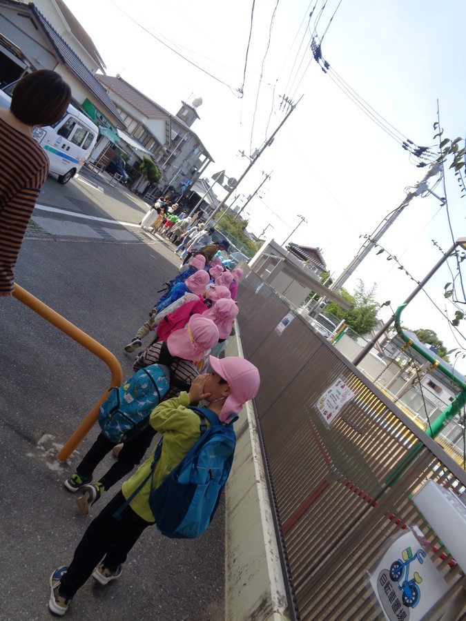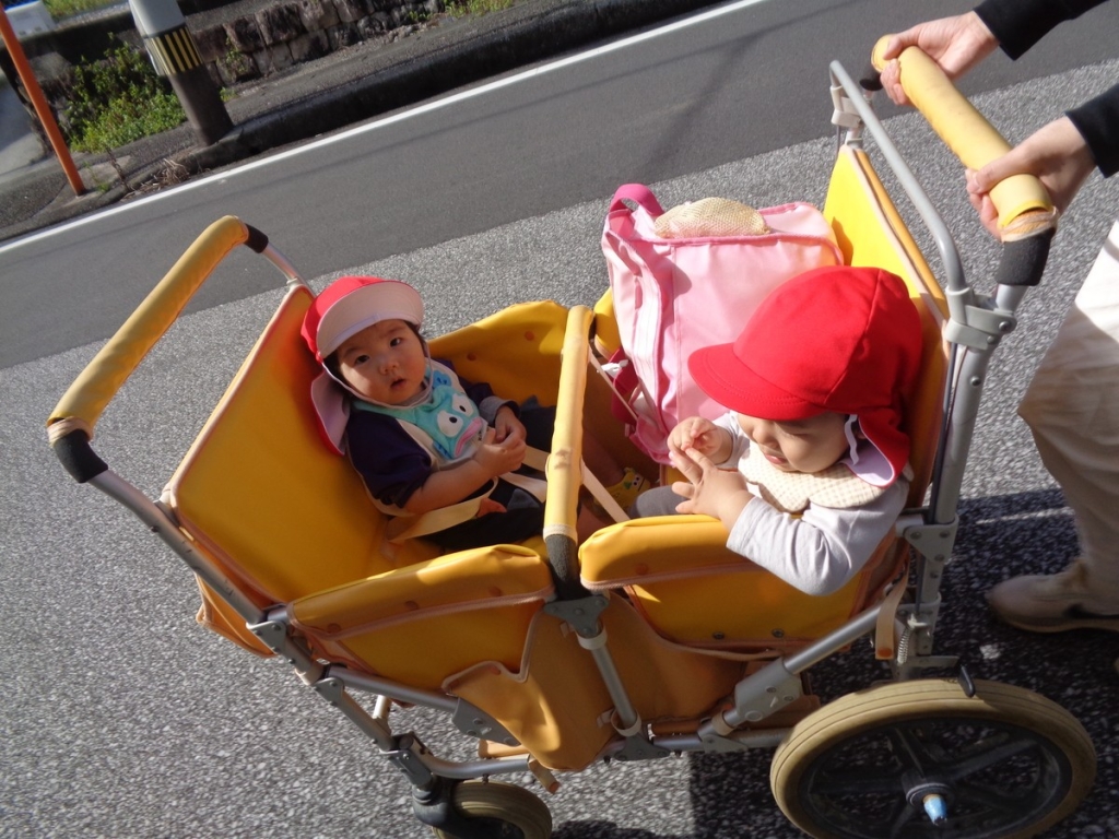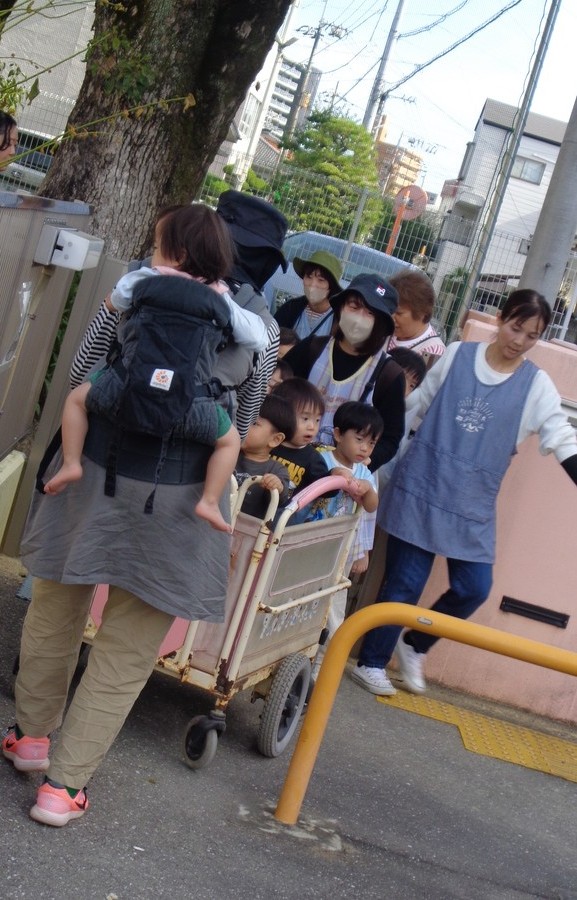 0歳児ひよこ組、1歳児りす組はカートに乗ったり、おんぶをされたりして避難です。
