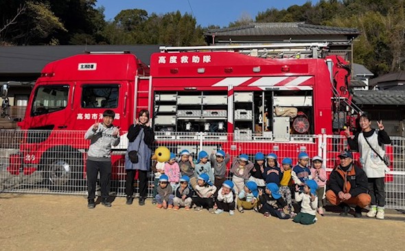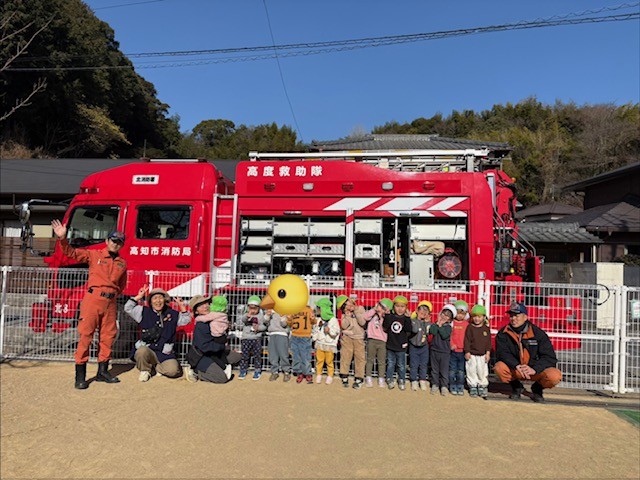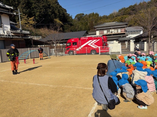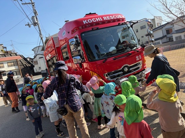 子どもたちは、いつものように園庭で体操をしていましたが、みんな素早く避難ができました!消防士さんからも「先生の話をよく聞けて、上手でした」とお褒めの言葉をもらい「お・は・し・も」の大事な言葉もみんなで振り返ったことでした。