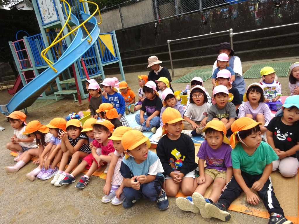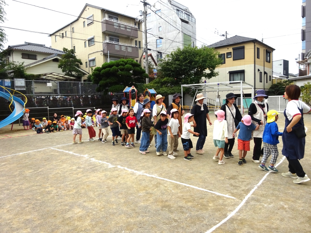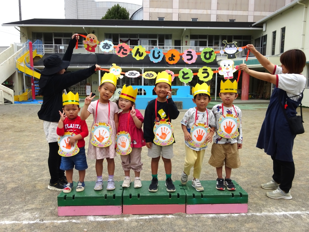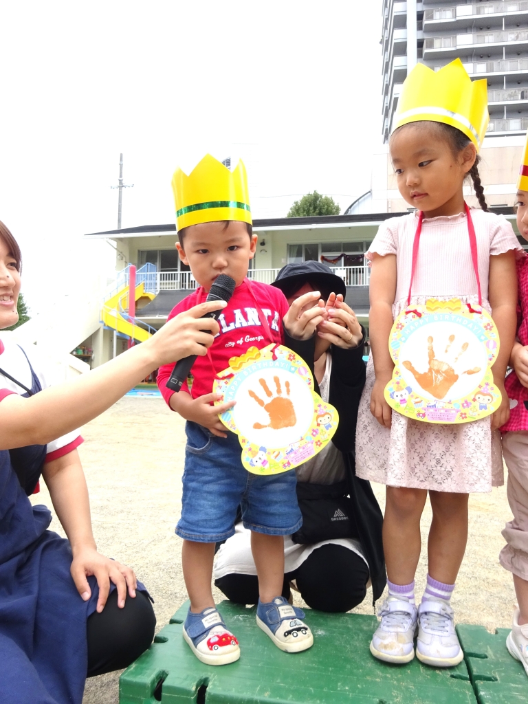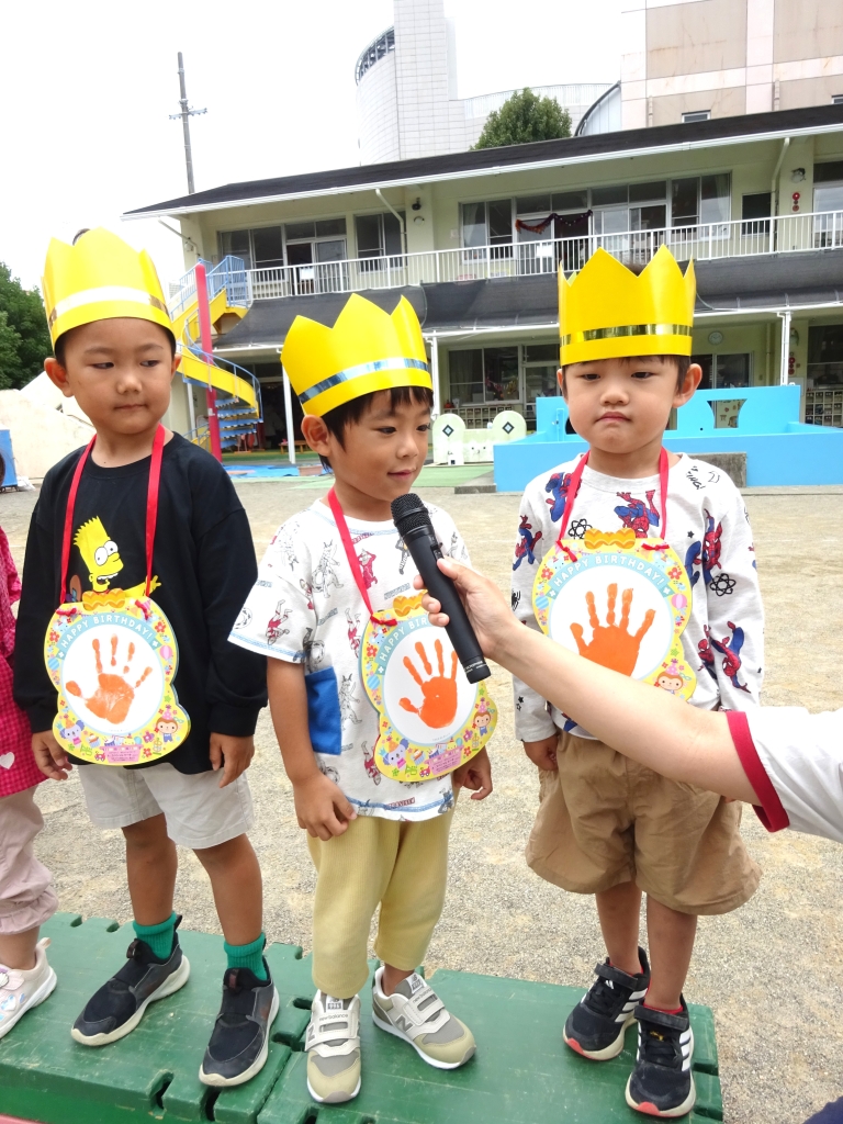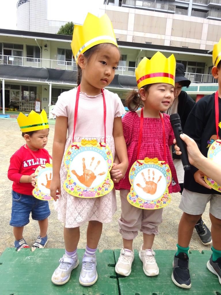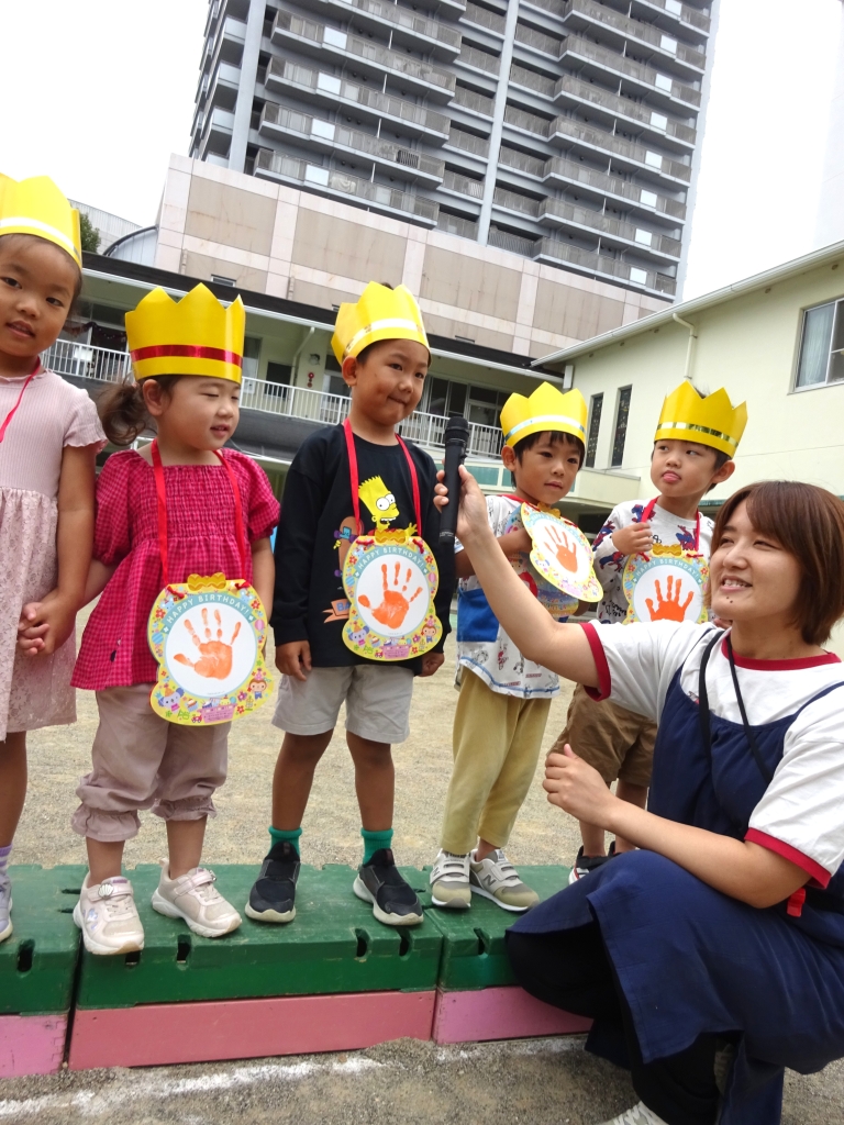 10月の誕生会は、園庭で運動会ごっこをしました。インタビューでは、「すきなたべものは?」「プリンセスの中でなにがすき?」の質問に「カレー☆」「ラプンツェル♡」などと、ちょっぴり恥ずかしながらも答えてくれました。おたんじょうびおめでとう♪♪