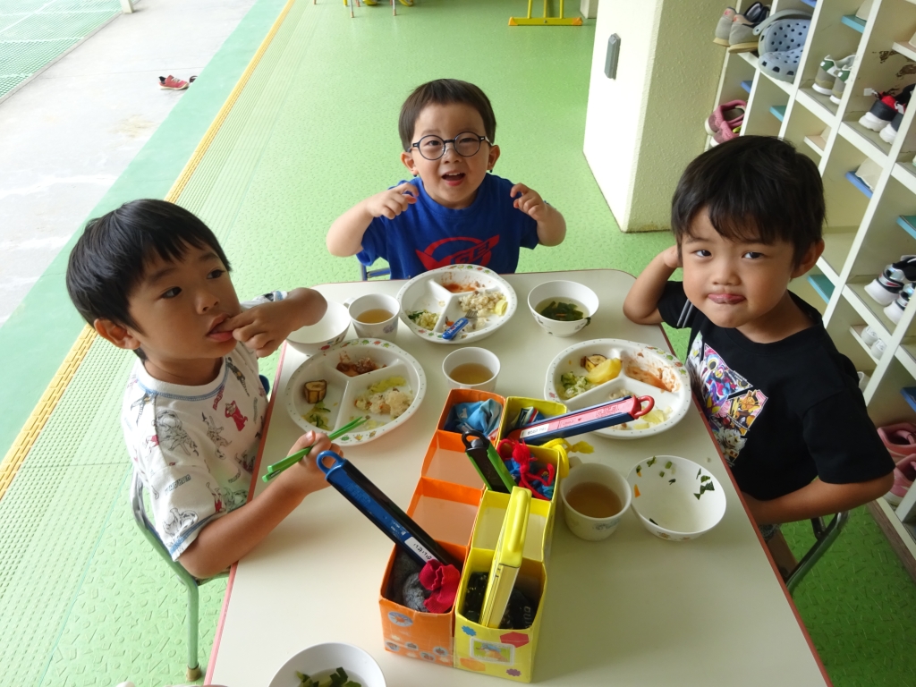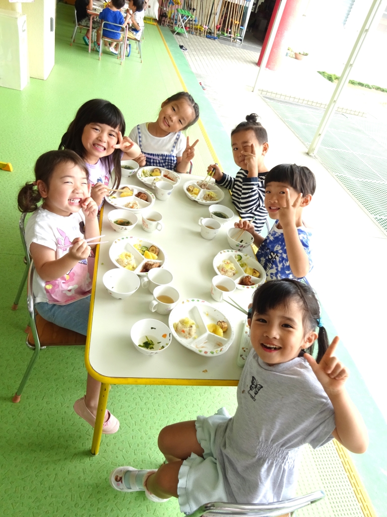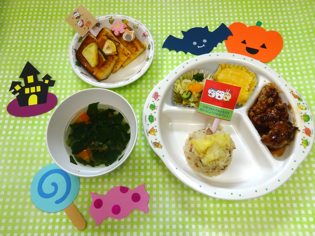 誕生会のメニューは、秋の炊き込みご飯、煮込みハンバーグ、すまし汁、みかんサラダ、パイン缶でした。みんなモリモリ食べました。おやつは、牛乳と秋のデザートです。おいしかったね♡