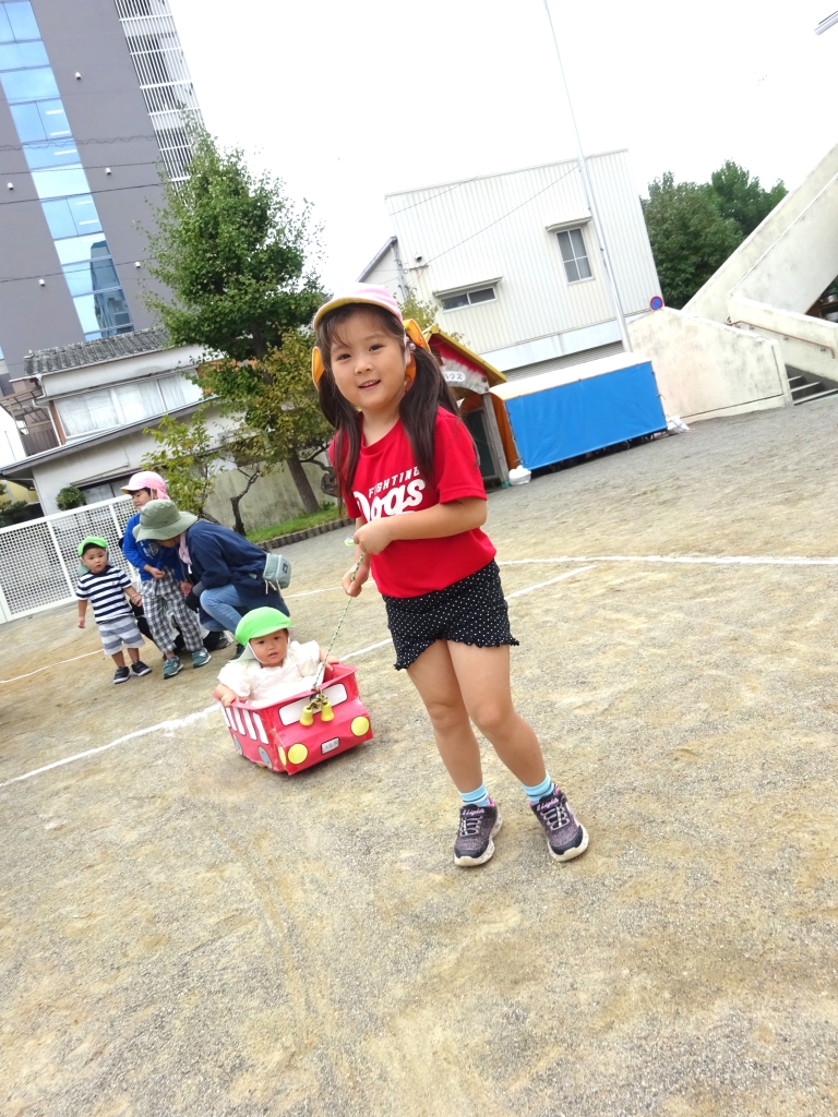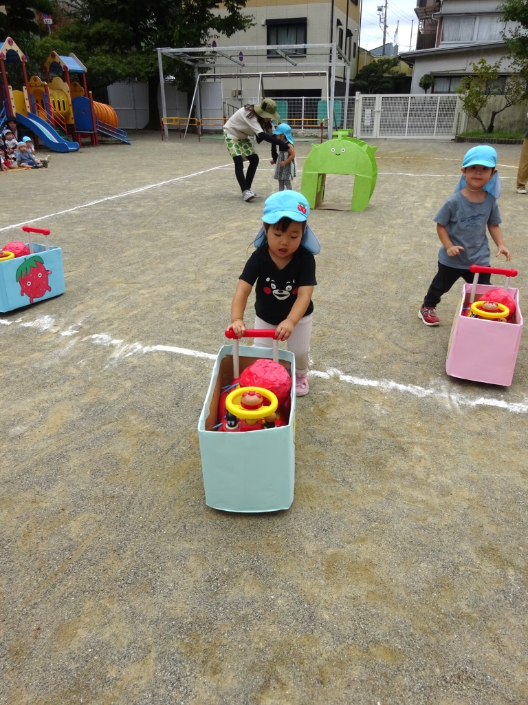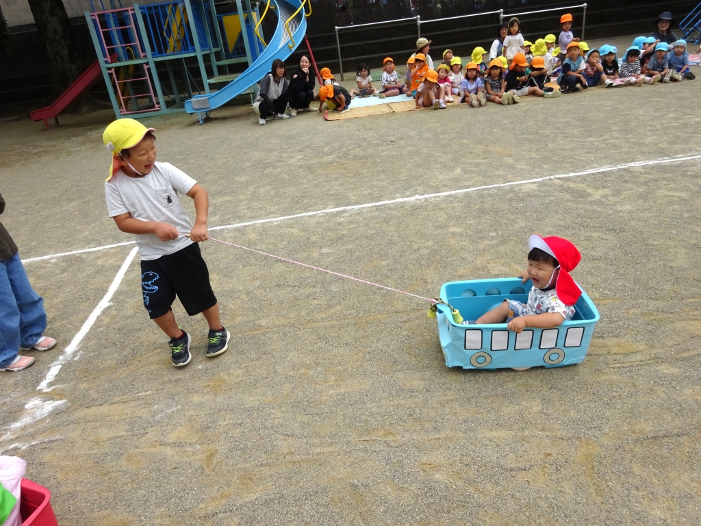 らいおん組の「スピード☆ライダー」は、りす組が車に乗りらいおんが車を引っぱります。小さいお友達が落ちないようにそ~っと引っぱってくれました♪