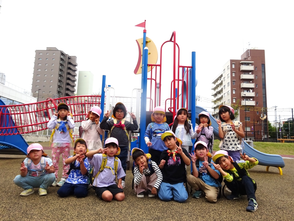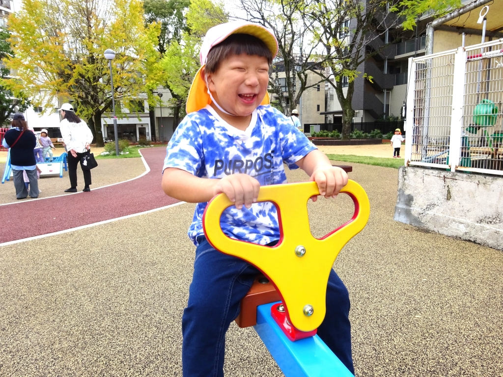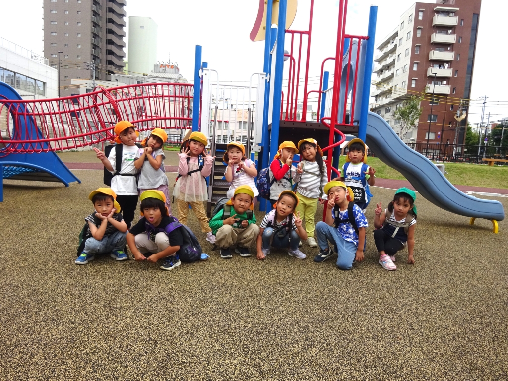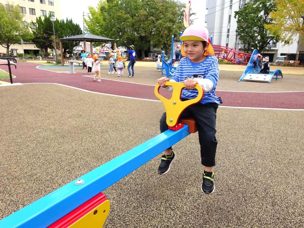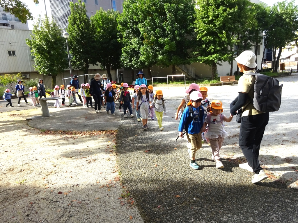 10/24(金)は、園外保育でした。きりん組、らいおん組で横堀公園まで行ってきました。新しい公園に大喜びの子ども達。自転車や車に気をつけながら公園までの道のりを歩いていきました。