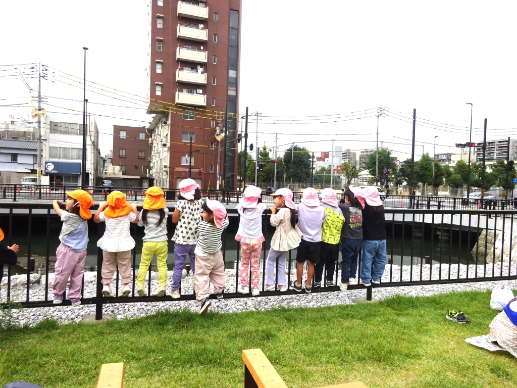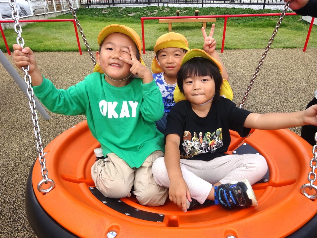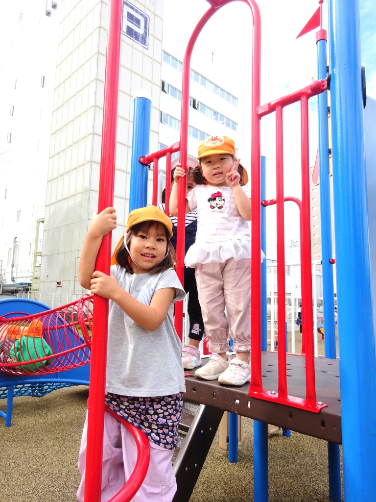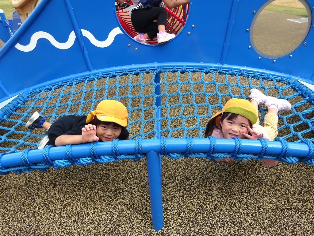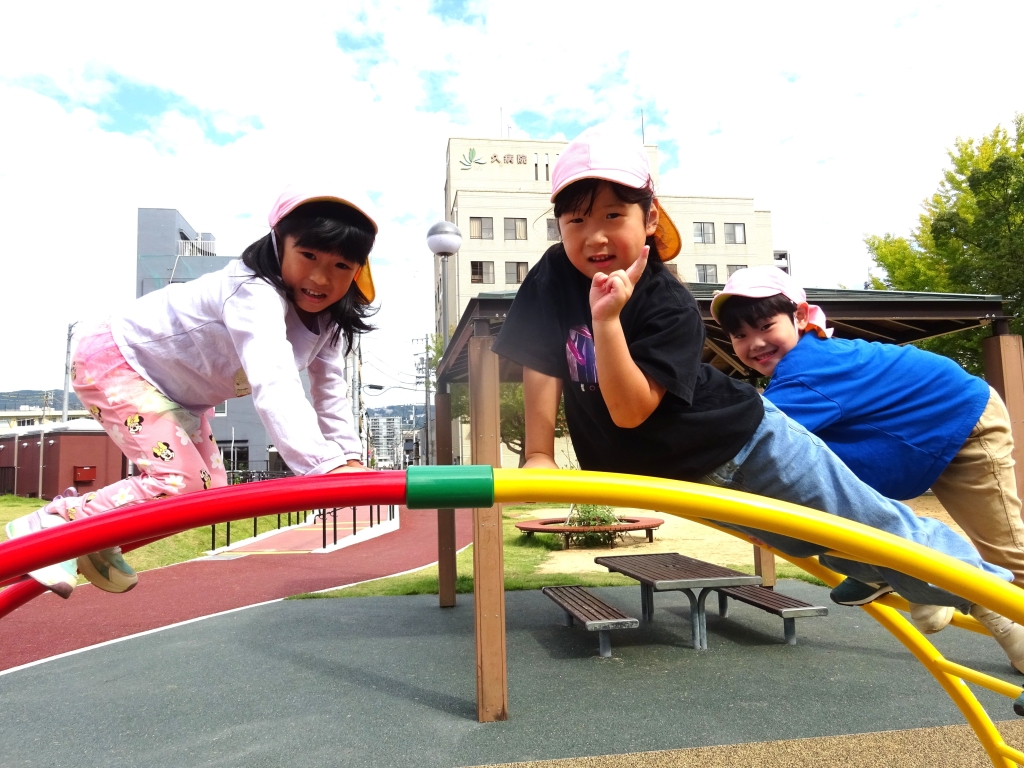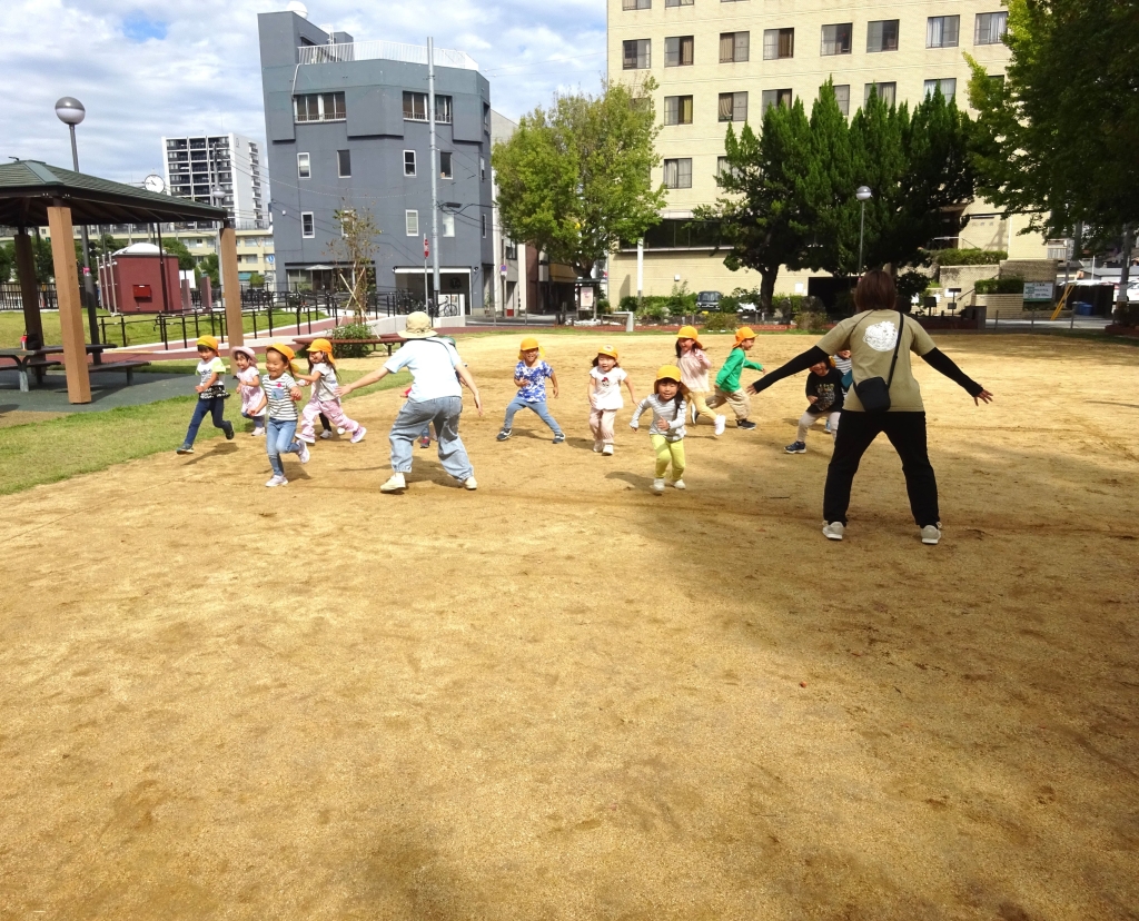 10/24(金)は、園外保育でした。きりん組、らいおん組で横堀公園まで行ってきました。新しい公園に大喜びの子ども達。自転車や車に気をつけながら公園までの道のりを歩いていきました。