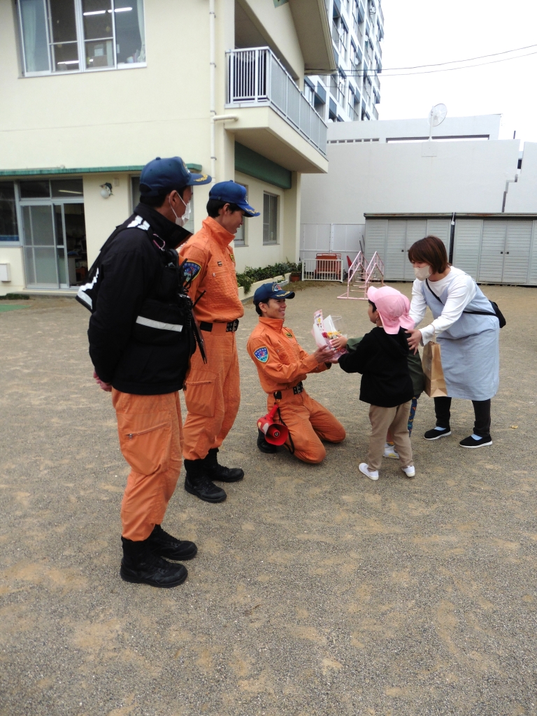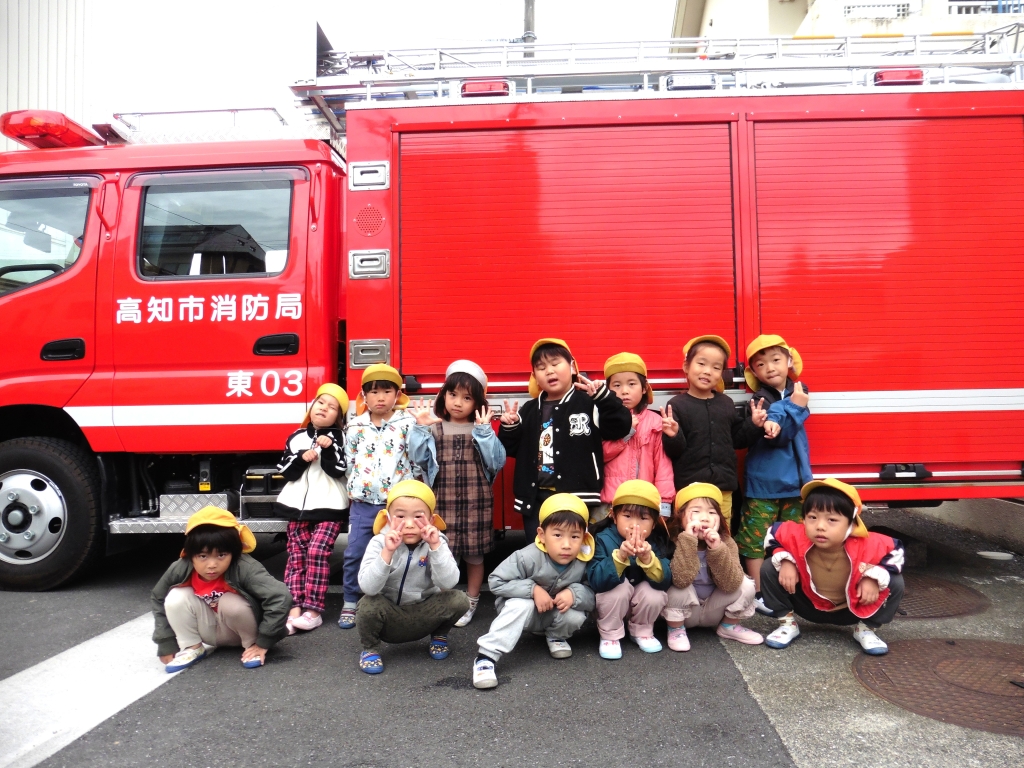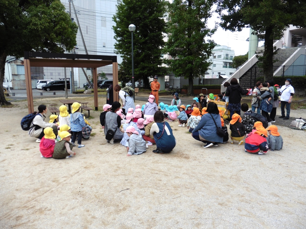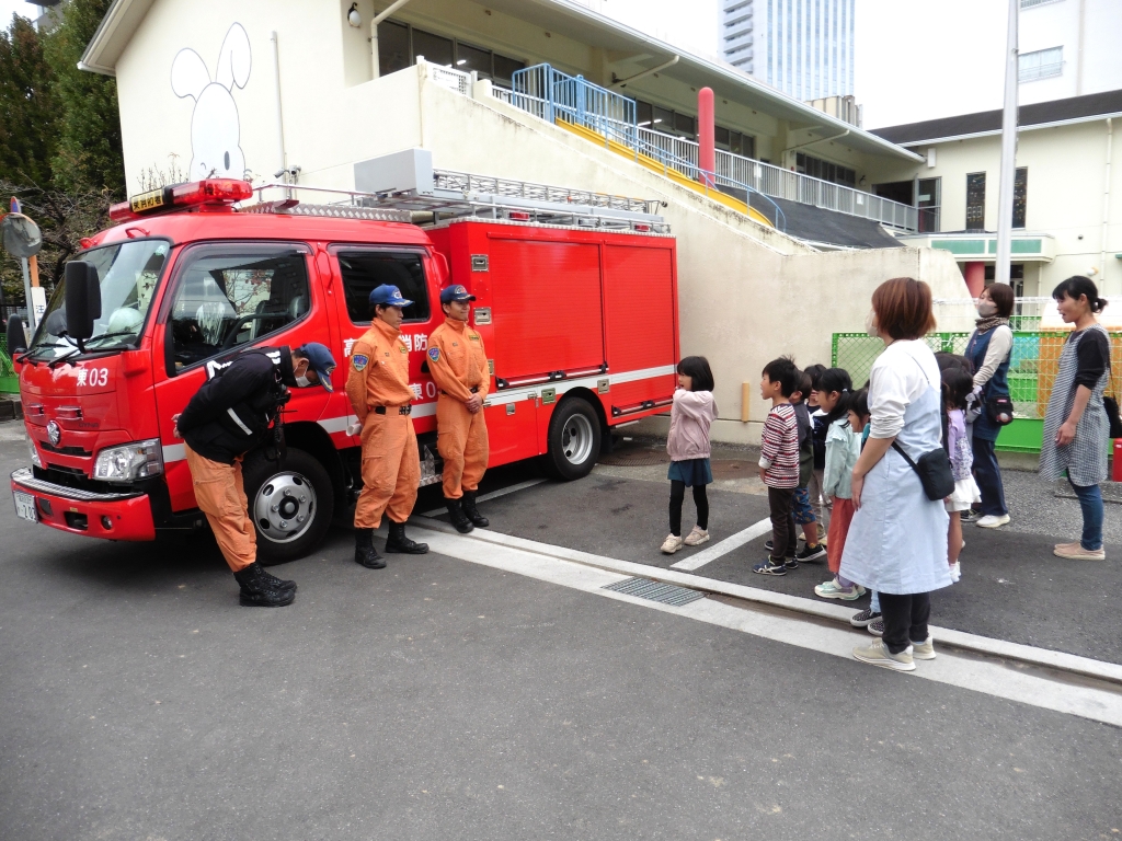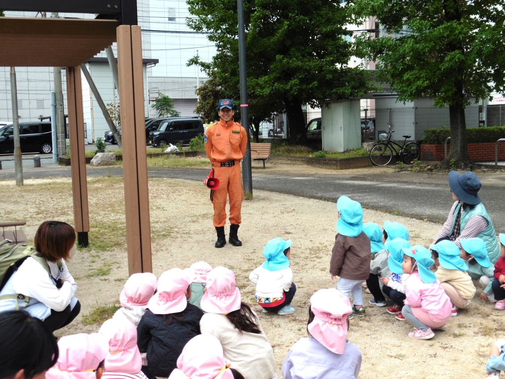 今日は、東消防署との合同の避難訓練でした。火災の設定で九反田公園まで避難しました。ベルの音や職員の声掛けで先生の側まですぐに集まり頑張って避難することができました。その後は、消防士さんのお話を聞いたり職員による消火訓練をしました。 避難をするにあたっての大事なお約束も分かりやすく話してくれました。