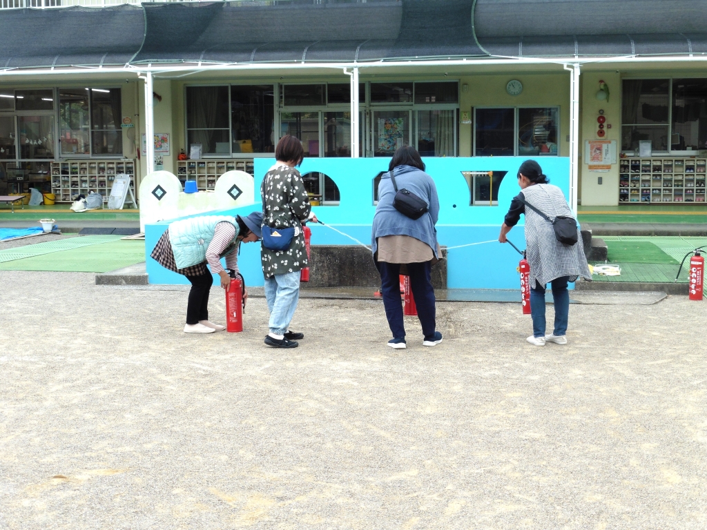 消火訓練では、「火事だー」と、大きな声で消火する所まで走ります。子ども達も応援してくれました。