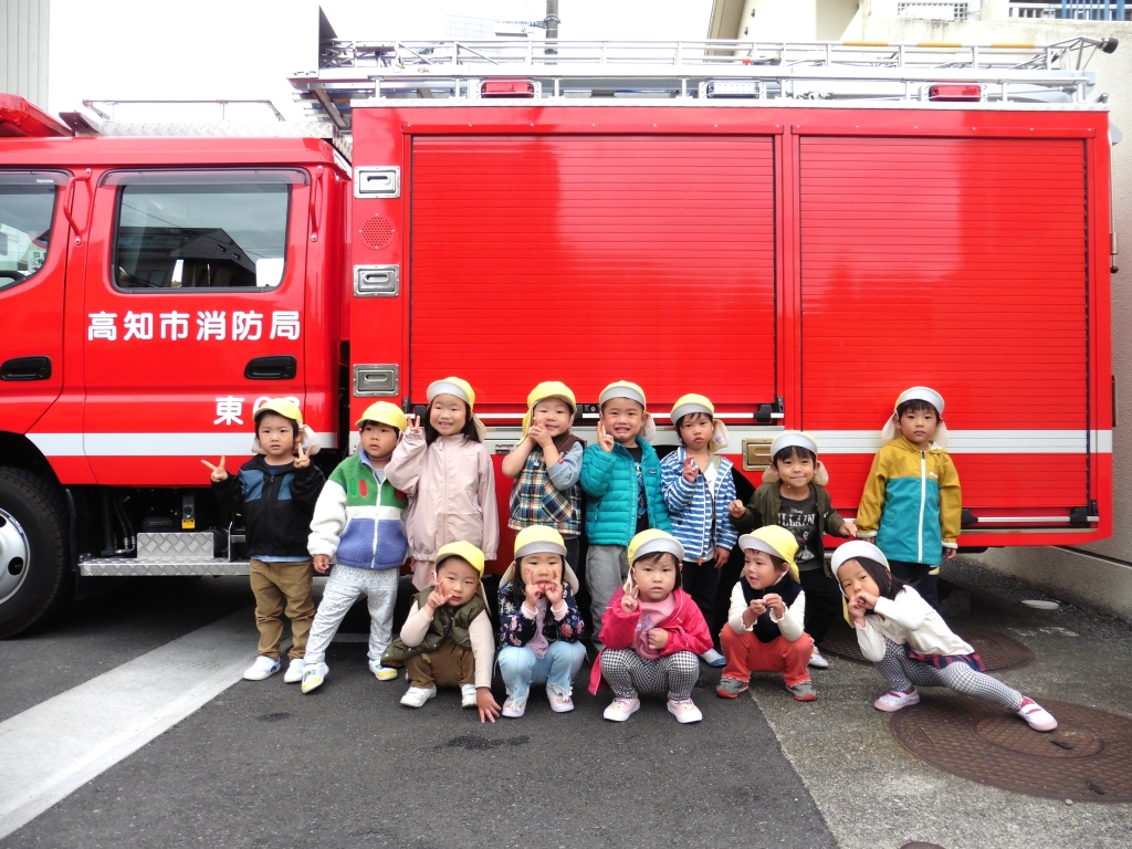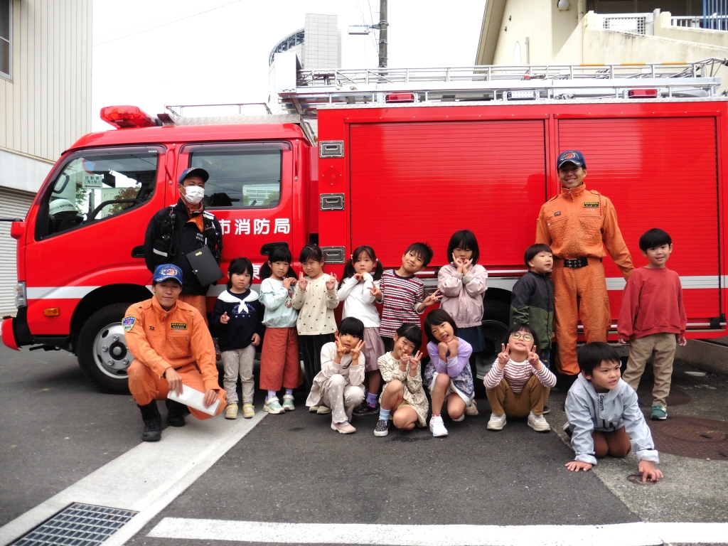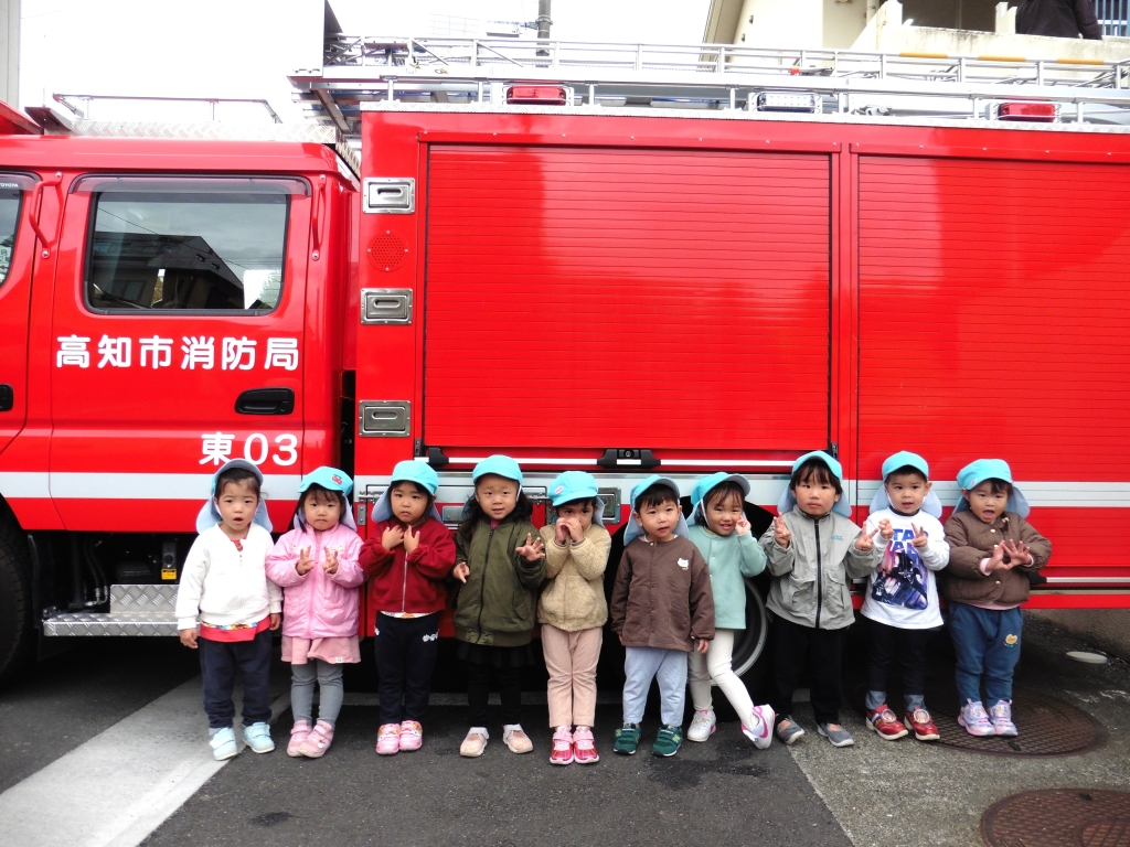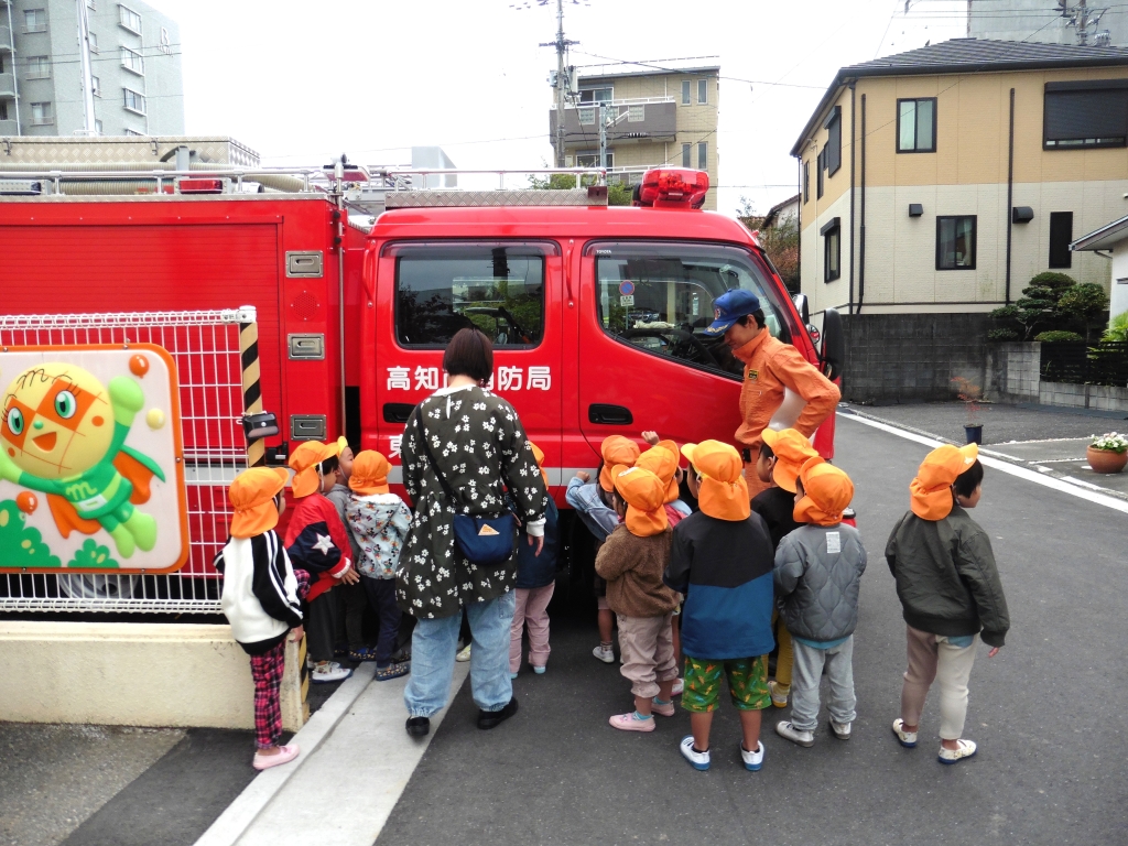 消防車を近くで見せてもらいました。「これは、なにかな?」など興味深々で見せてもらってます♪