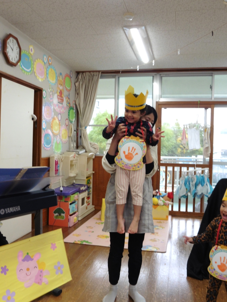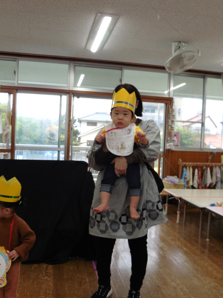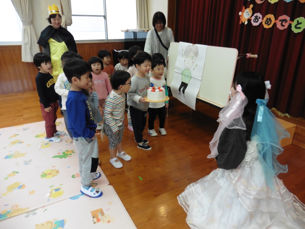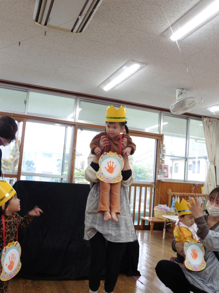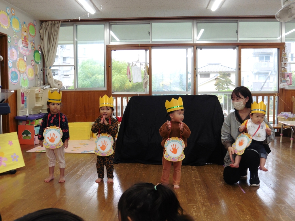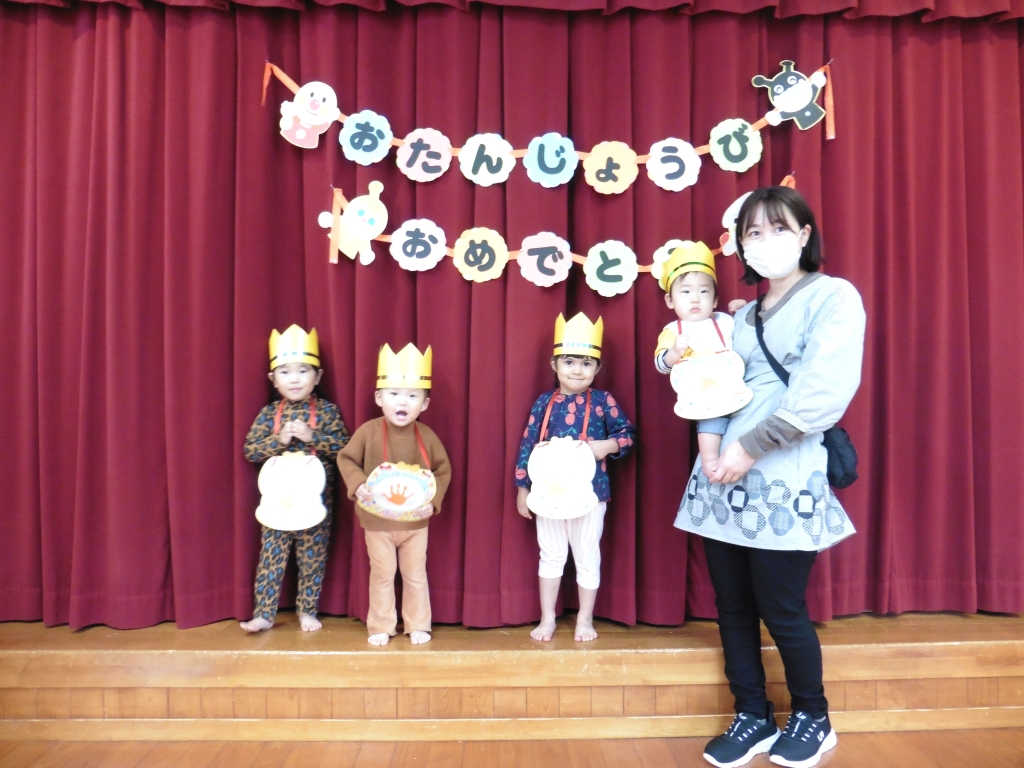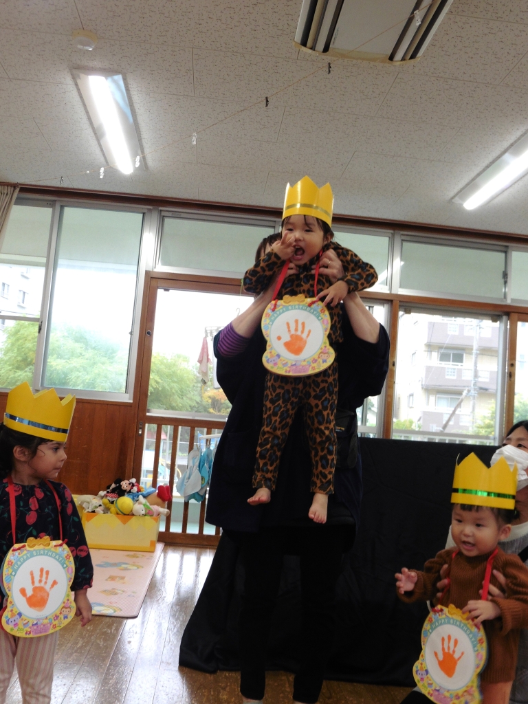 今日は、11月生まれの誕生会でした。小さいお友達ばかりでしたがインタビューでは、名前も言えたり「すきなたべものは?」の質問では、「からあげとごはん♡」や「ごはん☆」などとしっかり答えてくれました♪
