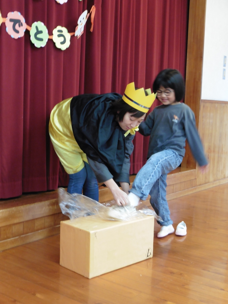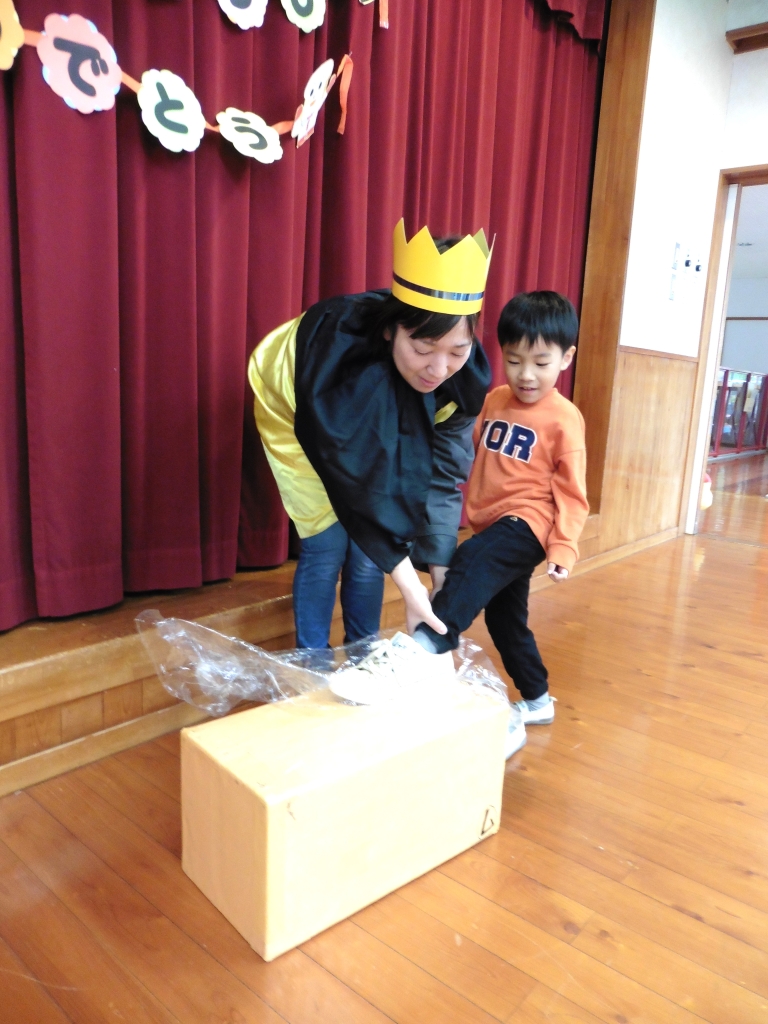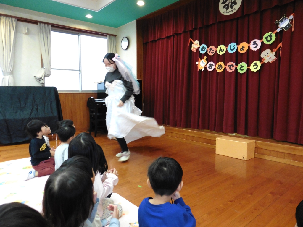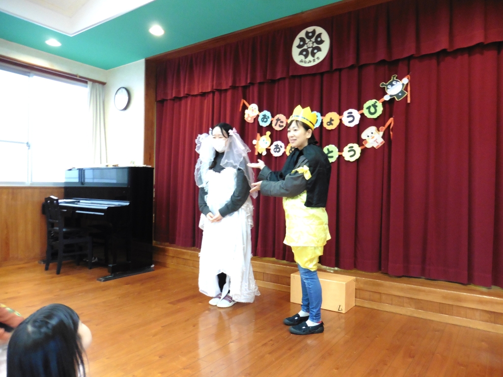 でも、一人の先生の足にピッタリ・・・。素敵な衣装に着替え登場してくれました。なんと10月に結婚したばかりの先生でみんなでお祝いをしました♡ぱんだ組の子ども達からは、ケーキと手作りネックレスをプレゼントをして、みんなで「結婚おめでとう♡」と、お祝いしました♪