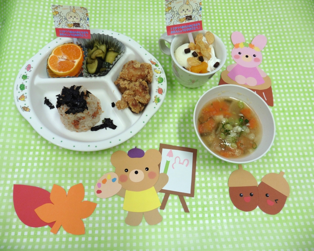 今日の給食は、もみじごはん、若鶏のから揚げ、たたき胡瓜、さつま汁、みかんでした。おやつは、牛乳とミニパフェでした♪