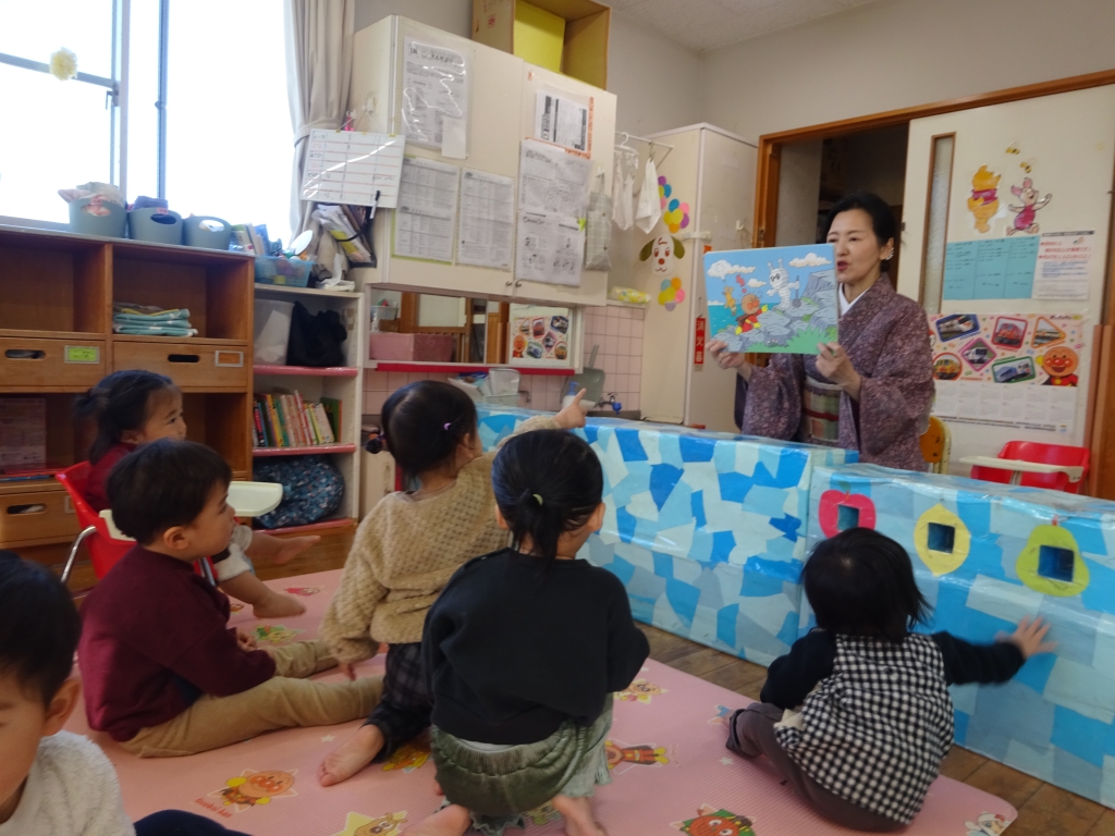 今日は、高知市人権同和・男女共同参画課の方が来てくれ子どもたちに絵本の読み聞かせをしてくれました。0.1歳児の子ども達には、アンパンマンの紙芝居を読んでくれました。