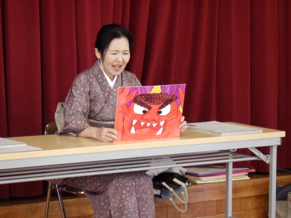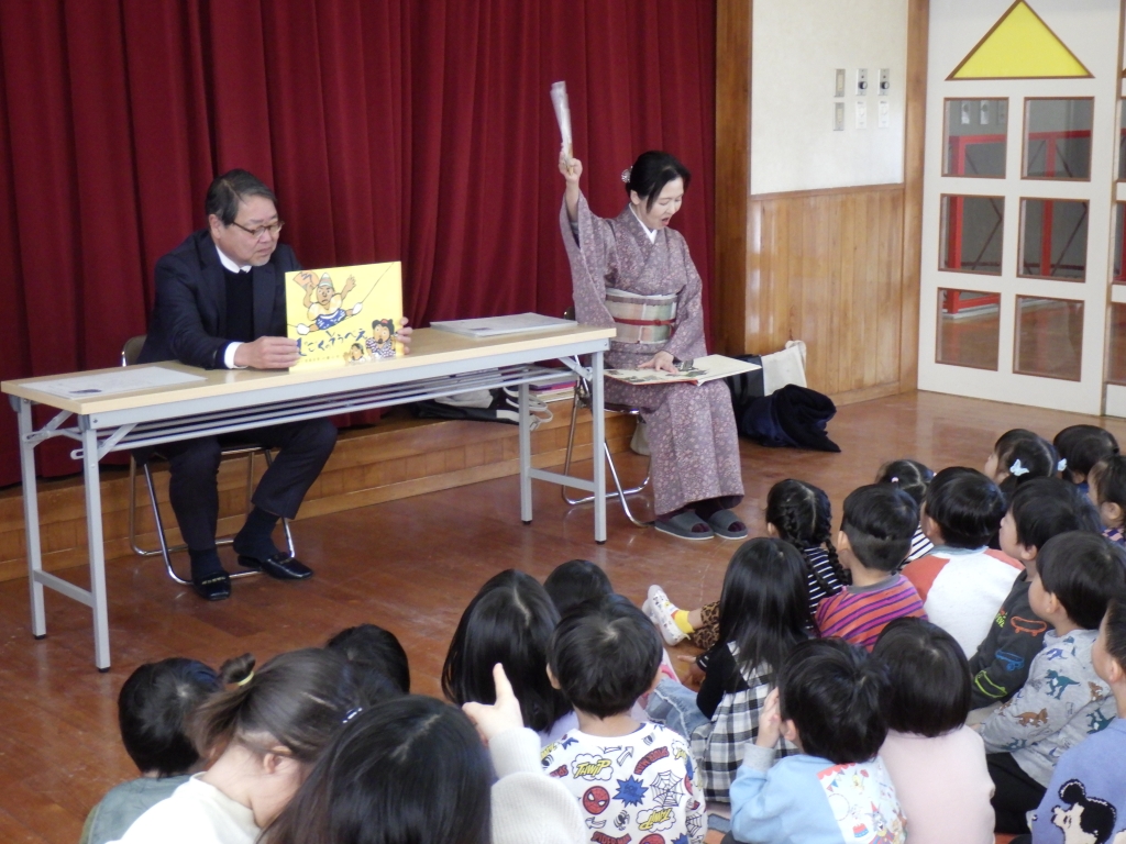 2歳児から5歳児の子ども達には、「モンゴルの白いうま」「じこくのそうべい」などの紙芝居を読んでくれました。扇子でジェスチャーを交えながら臨場感たっぷりに披露してくれました。子どもたちも笑ったり真剣な様子で見たりと、楽しい時間を過ごしました。