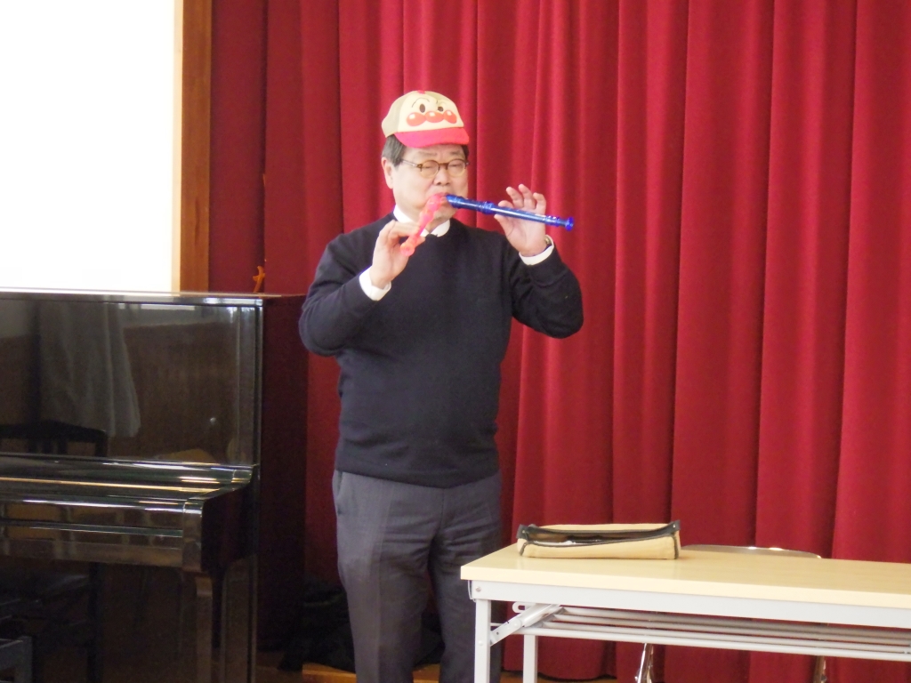 その後は、リコーダーの演奏も見せていただきました。二つのリコーダーを使っての演奏に子どもたちもびっくり!大好きなアンパンマンの曲にみんなで口づさんで盛り上がっていました♪演奏が終わると「もう一回聞きたいな♡」の子ども達の声にもう一曲披露してくれ大盛り上がりでした☆