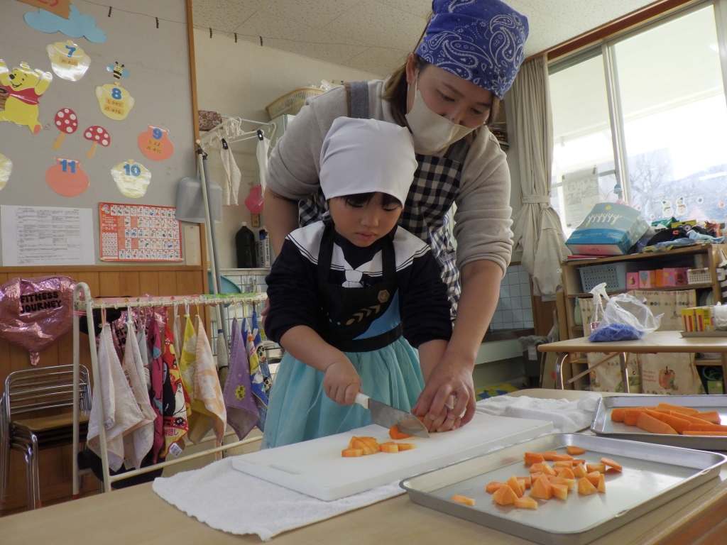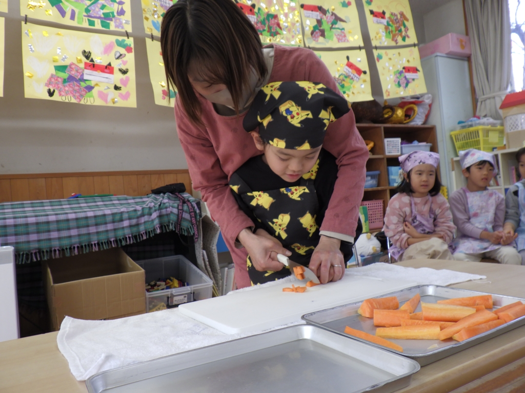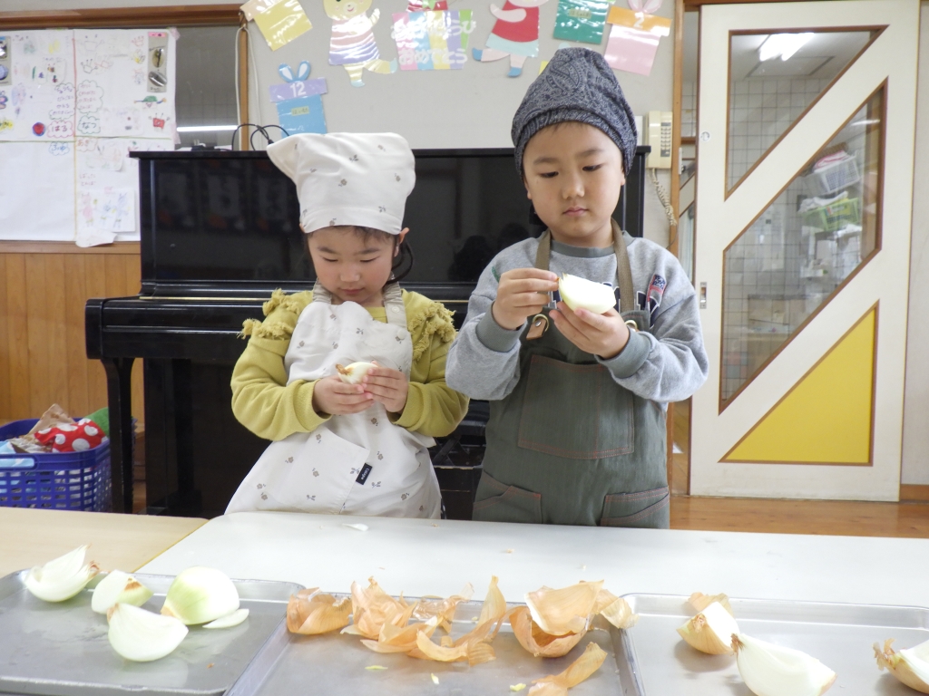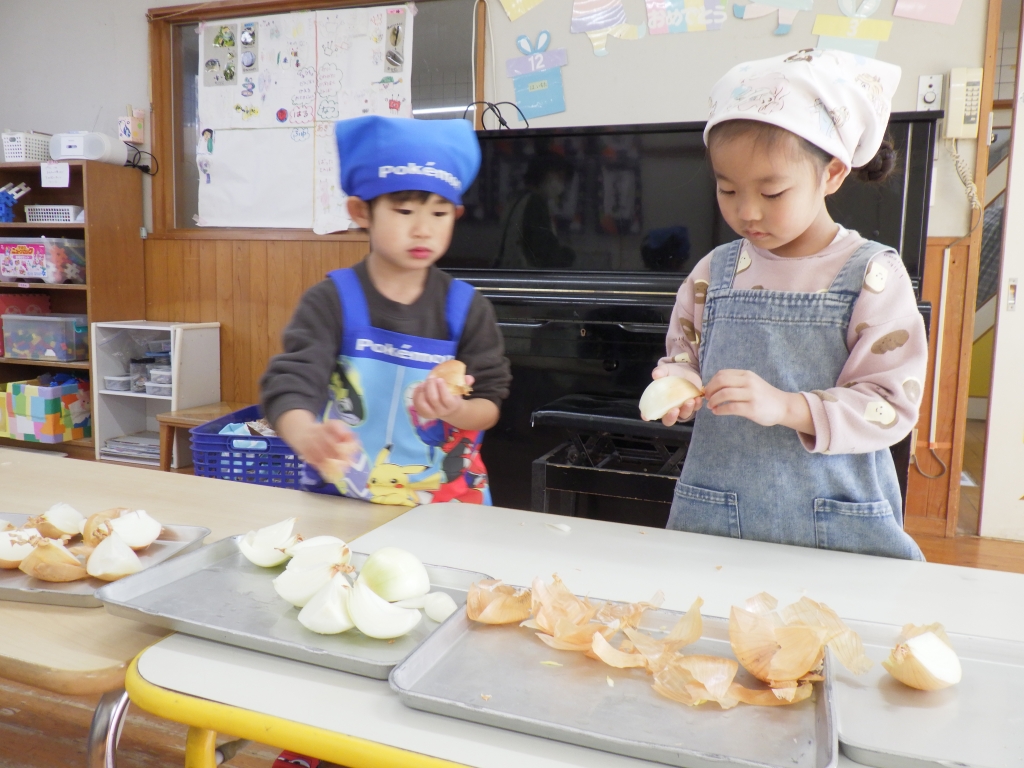 カレー作りしたよ🍛 2026.02.03 1/20にきりん組、らいおん組でカレー作りをしました。エプロンと三角巾をつけてワクワクの様子の子ども達☆きりん組は、玉ねぎの皮むきです。給食の先生の話をしっかり聞いて皮むきのスタートです。とっても真剣な様子の子ども達でした。 らいおん組は、包丁を使っての野菜切りです。 グツグツ煮込んだ後は、カレーの出来上がり。 みんなで作ったカレーおいしかったね♡お家でもお手伝いしてあげてね♪ 前の記事 次の記事 最新の投稿 冬まつり♪ ⛄雪あそび⛄ カレー作りしたよ🍛 1月誕生会&ししまい 絵本読み聞かせ カテゴリ 園からのお知らせ アーカイブ 2026年2月 2026年1月 2025年12月 2025年11月 2025年10月 2025年9月 2025年8月 2025年7月 2025年6月 2025年5月 2025年4月 2025年3月 2025年2月 2025年1月 2024年12月 2024年11月 2024年10月 2024年9月 2024年6月