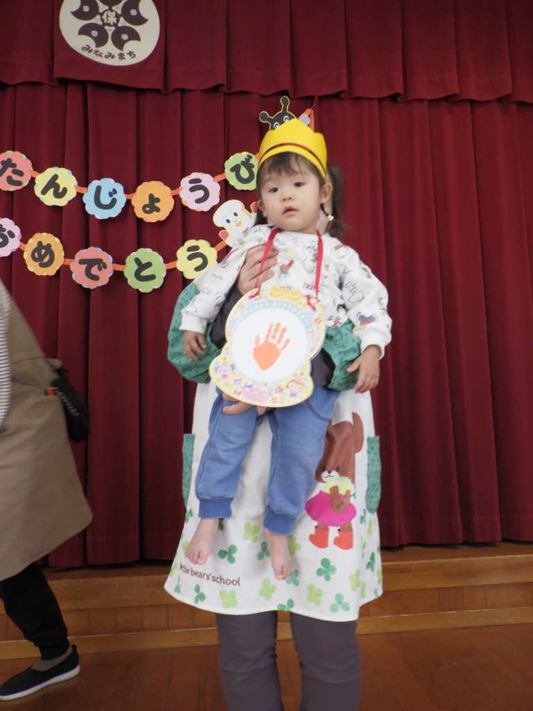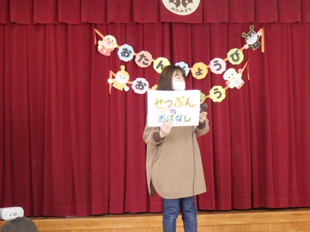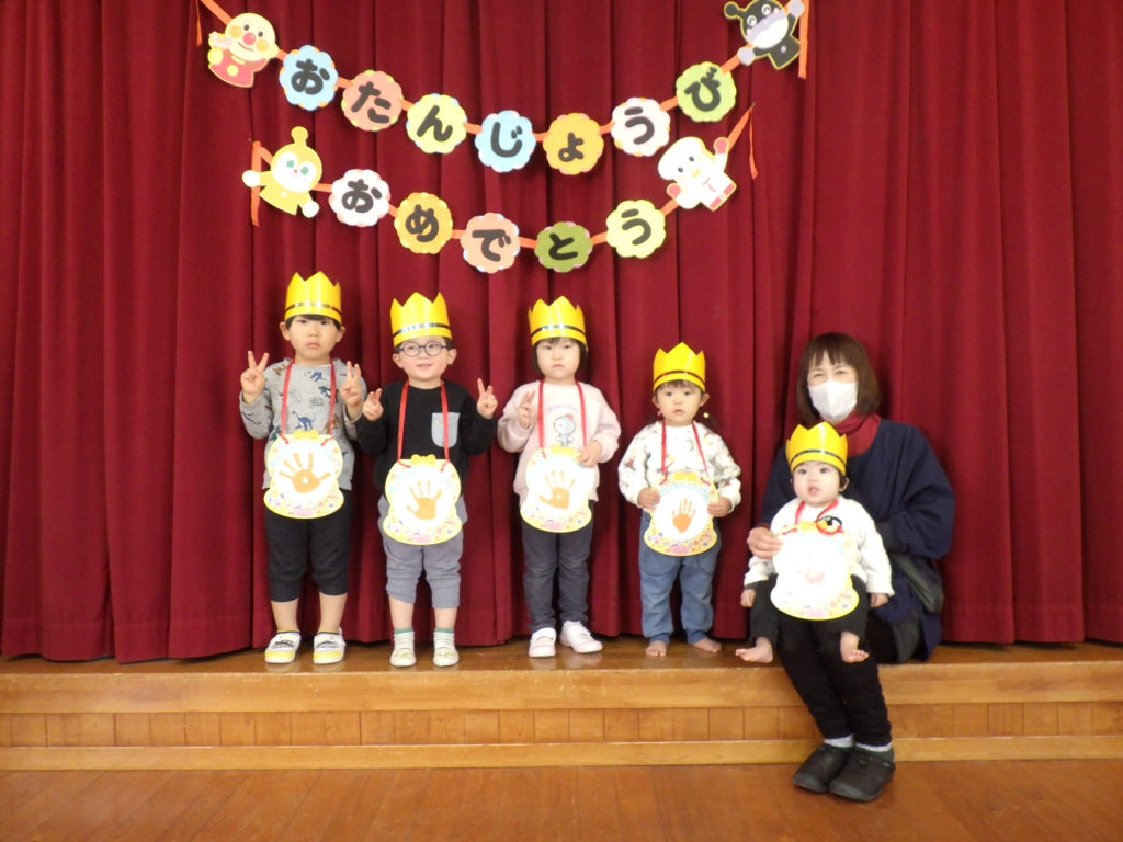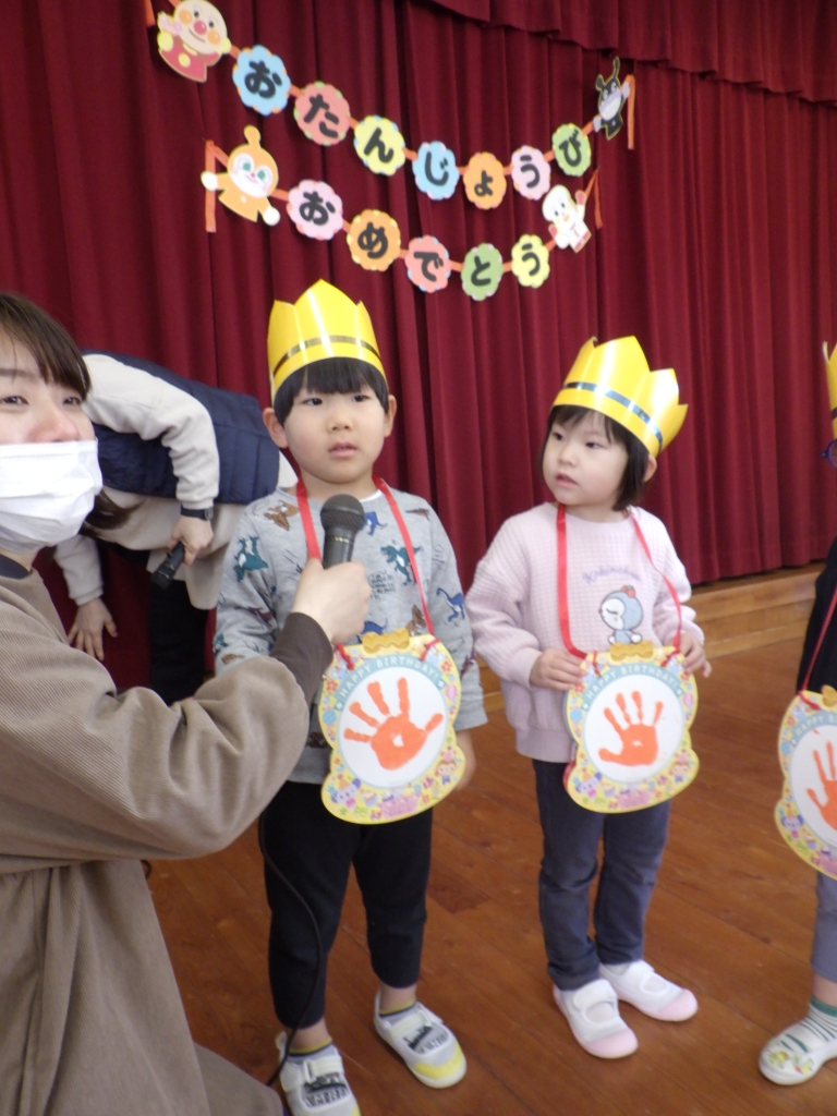 2/13(金)は、2月の誕生会でした。豆まきの歌やコンコンクシャンの歌を元気にうたいました。インタビューでは、「好きな食べ物は?」「何歳になったかな?」の質問に「りんご♡」「4歳☆」等とかわいく答えてくれました。