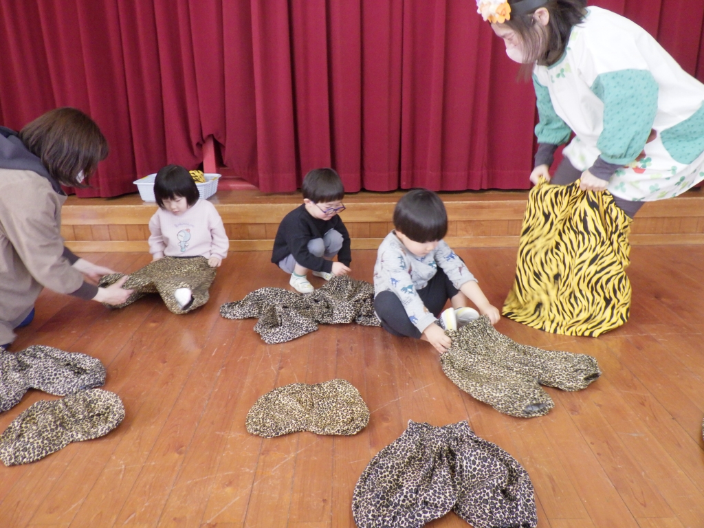 次は、「鬼のパンツ♪」の歌に合わせてどちらが早く鬼のパンツを履けるかの競争です。先生達がんばりました♪