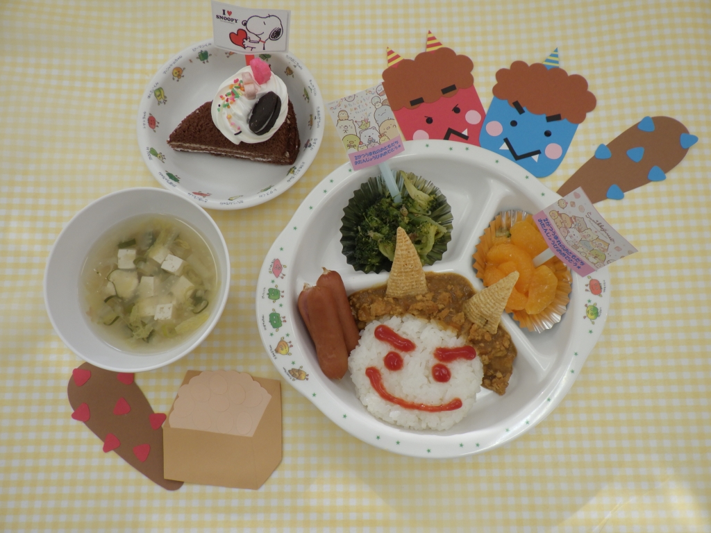 給食は、節分ドライカレー、ブロッコリーのおかか和え、すまし汁、オレンジ☆。おやつは、ココアケーキでした♪鬼のドライカレーは、「かわいい♡」と、なかなか手をつけれなかった子ども達でした☺おいしかったね♡