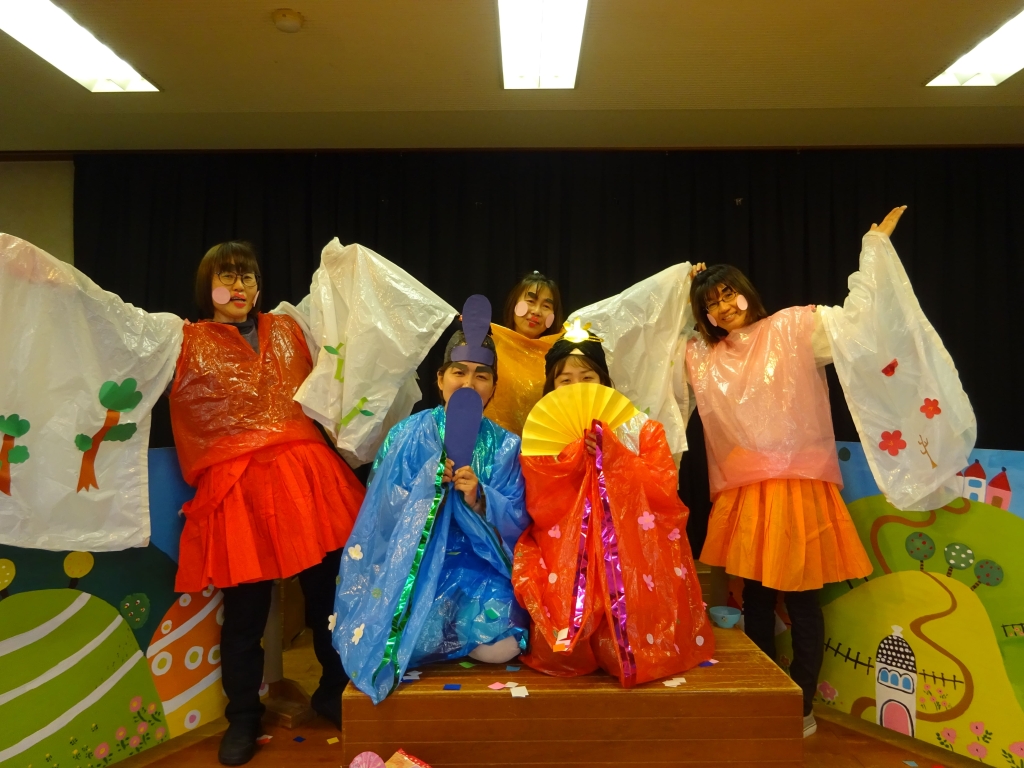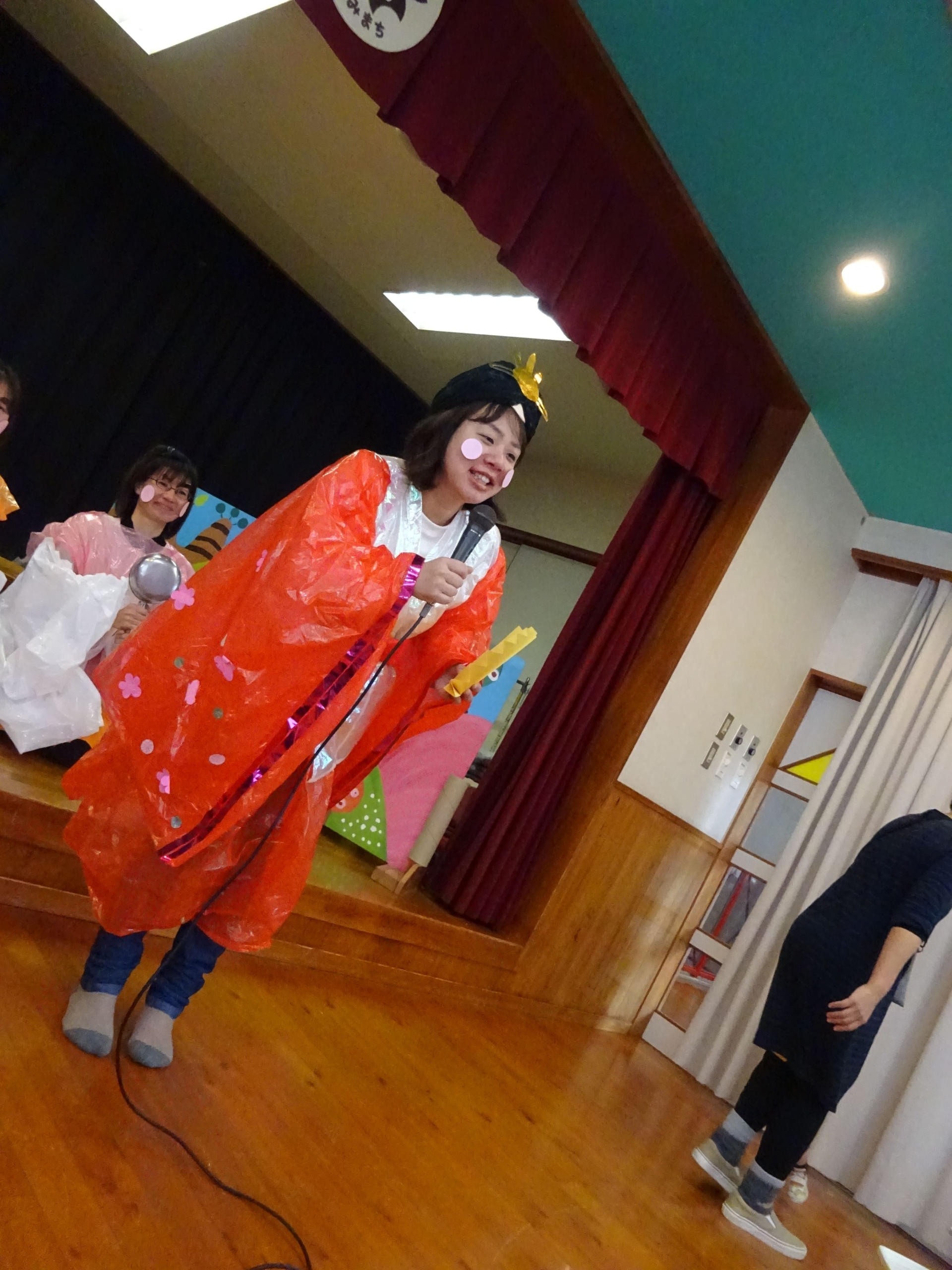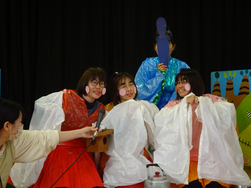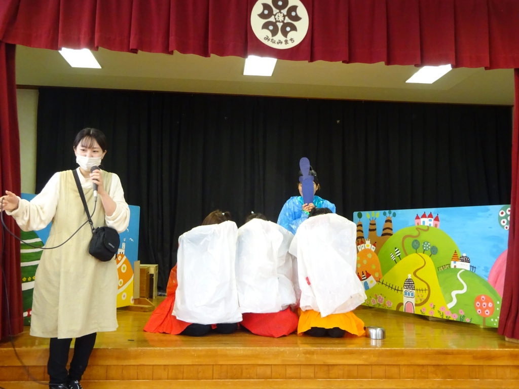 おひな様のお話の後は、なんだか舞台の上が騒がしく……何が始まるかな?子ども達もドキドキ☆カーテンが開くとそこには、お内裏様と三人官女がいました。