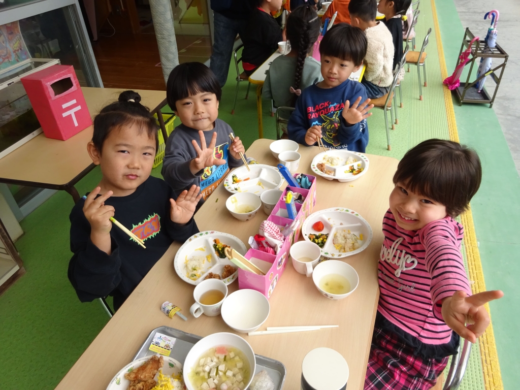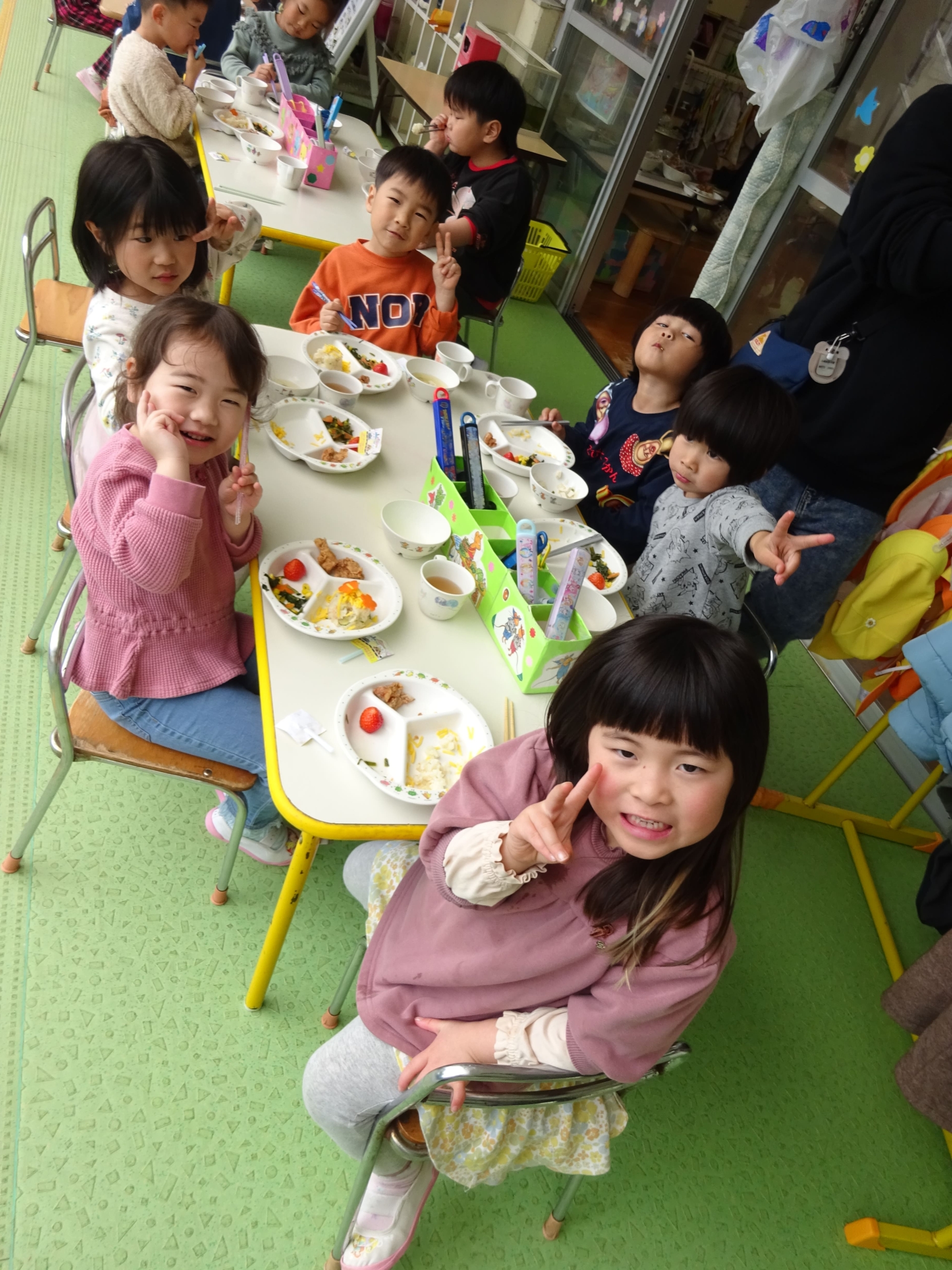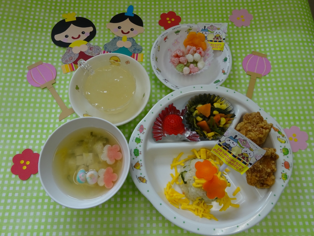 今日の給食は、花ちらし寿司、若鶏のから揚げ、ポパイサラダ、すまし汁、いちご。おやつは、牛乳とももゼリーでした☺おいしかったね♡