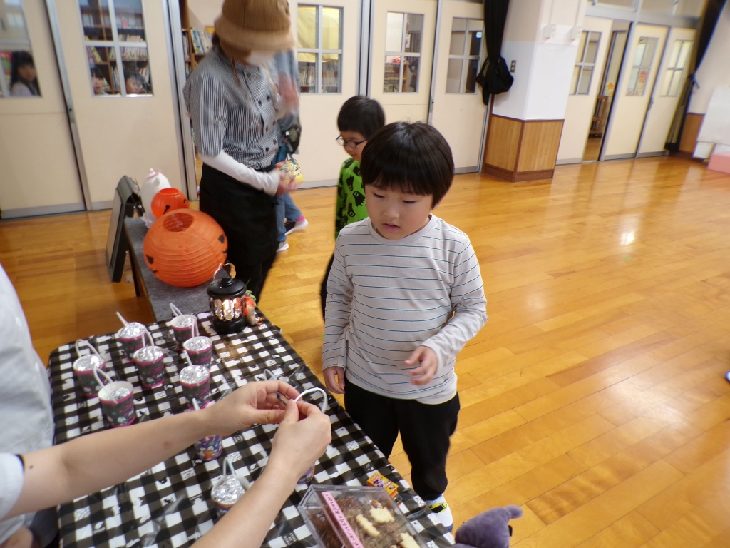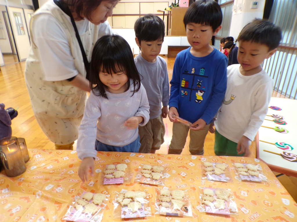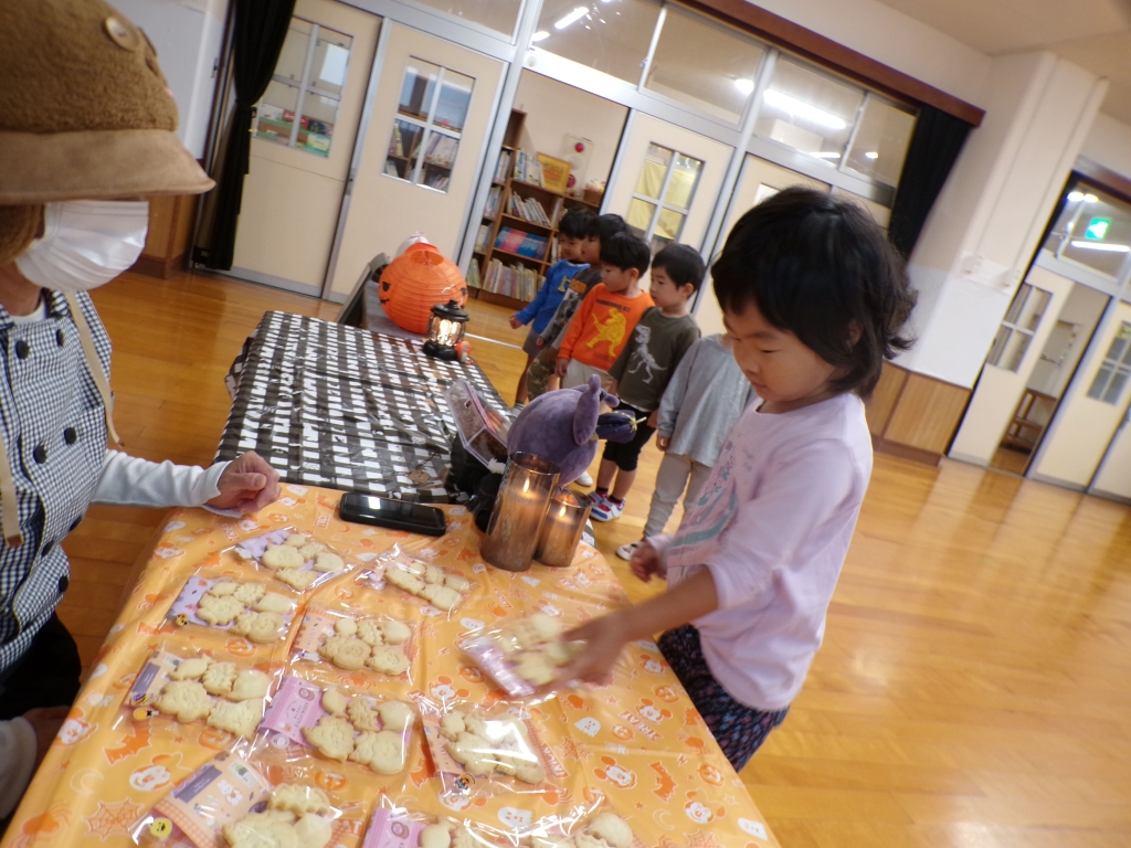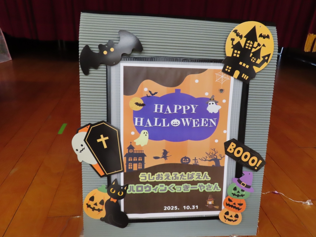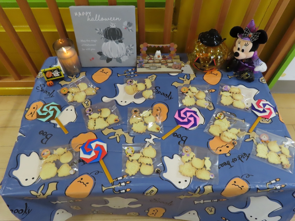 ℍappy ℍalloween🎃2025.10.31 うしおえふたばえんハロウィンくっきーやさんがopen♪   給食先生も変装しています👻       かぼちゃやコウモリ🦇、おばけ👻にキャンディ🍬などの形のクッキーが今日のおやつです😊 みんなでおいしく食べました🍪