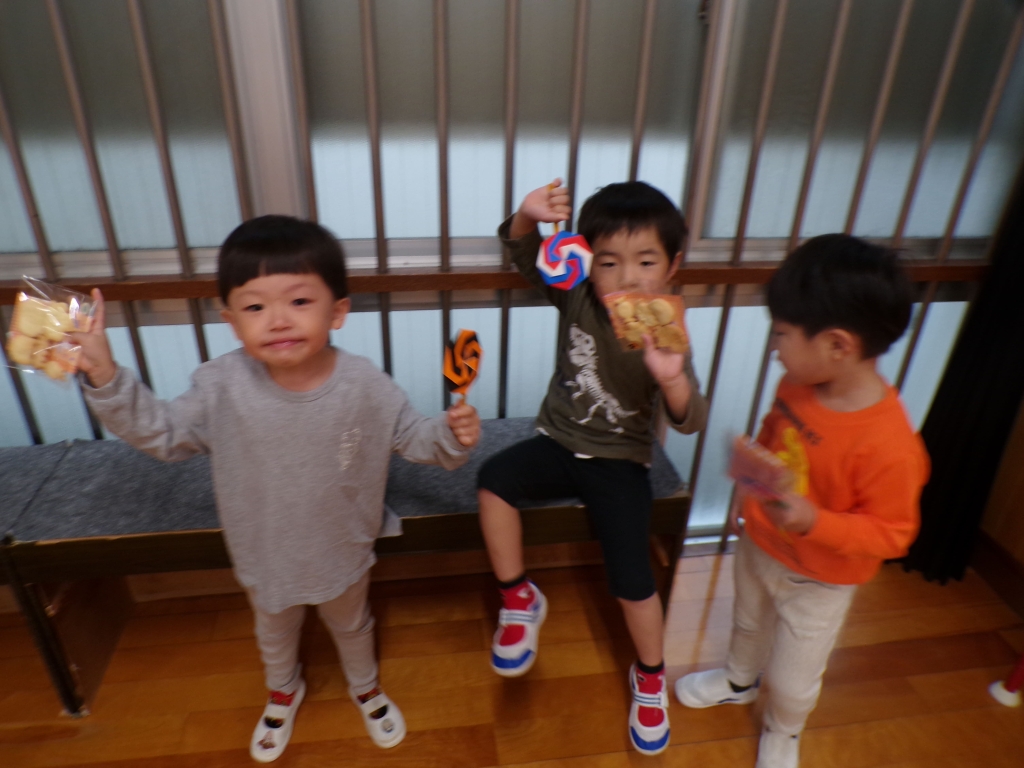 10月のお誕生会☆彡2025.10.23 今日は、10月生まれのお友だちのお誕生会でした。 みんなで『ドレミの歌』と『どんぐり』を元気に歌ってお誕生会の始まりです!   先生からの「好きな食べ物は?」「好きな色は?」の質問に照れながらも可愛く答えていました。       10月生まれのお友だち、お誕生日おめでとう☆☆ その後は、運動会で踊ったリズムを全員で踊りました♪    お兄ちゃんお姉ちゃんの踊りを真似して、乳児組のお友だちも可愛く踊っていましたよ♡    自分のクラスのリズムだけでなく、他のクラスのリズムもノリノリで元気いっぱい踊っていました♬ 踊った後に、高知大学体操部のお兄さんが来てくれ、色々な技を披露してくれました。    倒立やバク転、バク宙など、普段見ることのできないような可憐な技を次々に披露してくれ、「うわー!!」「すごーい✨」と目を輝かせて見ていた子ども達でした。  お誕生月の子ども達が、飛行機(バランス)を教えてもらい、上手に披露してくれました。  今月のお誕生会メニュー:秋の炊き込みご飯、魚のフライ、すまし汁、みかんサラダ、パイン缶     おやつ:ハロウィンのミニケーキ みんな美味しそうに食べていました♡