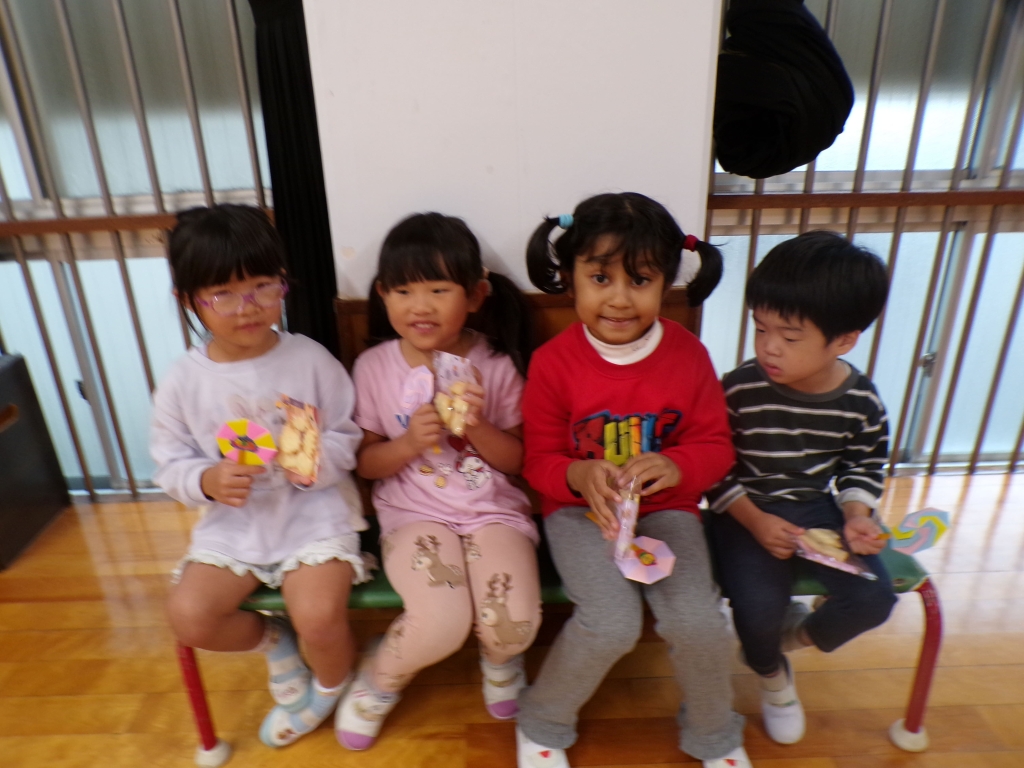 9月のお誕生会☆彡2025.09.18 今日は、9月生まれのお友だちのお誕生会をしました。 「好きな食べ物は?」のインタビューでは、「ぶどう🍇」「オムライス」と答えていました。年齢の小さいお友だちも自分のお名前を言ったりと可愛く答えていました♡     9月生まれのお友だち、お誕生日おめでとう☆ 次は、筒を使ったマジックショー。 最初は、コーヒー牛乳だったはずの中身が・・・あらあらあら・・・ 「牛乳に早変わり~!」次は「りんごジュースになったよ~🍎」  「なんで~?」「ふしぎ~」と、子ども達は、大喜びでした。 次は、ひげダンスショーの始まりです☆ いつもとは雰囲気の違う先生たちにびっくりしてましたが、次々に繰り広げられるパフォーマンスに子ども達からは拍手と笑い声が聞かれていました。    成功するたび、「おおー!」「すごーい!」と拍手が起こってました♪  「おばけのばけたクン」のクリアファイルシアターも喜んで見ていました。  ラスベガスから来たマユケルが、色々な特技を見せてくれましたよ。  ユッティーは、お手玉を披露してくれました。  カーリーは、竹馬を上手に乗りこなしていました。   最後は、そら組のお友だちが鉄棒に挑戦!かっこよく、逆上がりと前回りを見せてくれました。  お誕生会メニュー:うさちゃんライス・ハンバーグ・たたききゅうり・すまし汁・パイン  おやつ:ミニケーキ(お月様とうさぎ、お月見団子をイメージしています🌕)    みんな美味しそうに食べていました♡