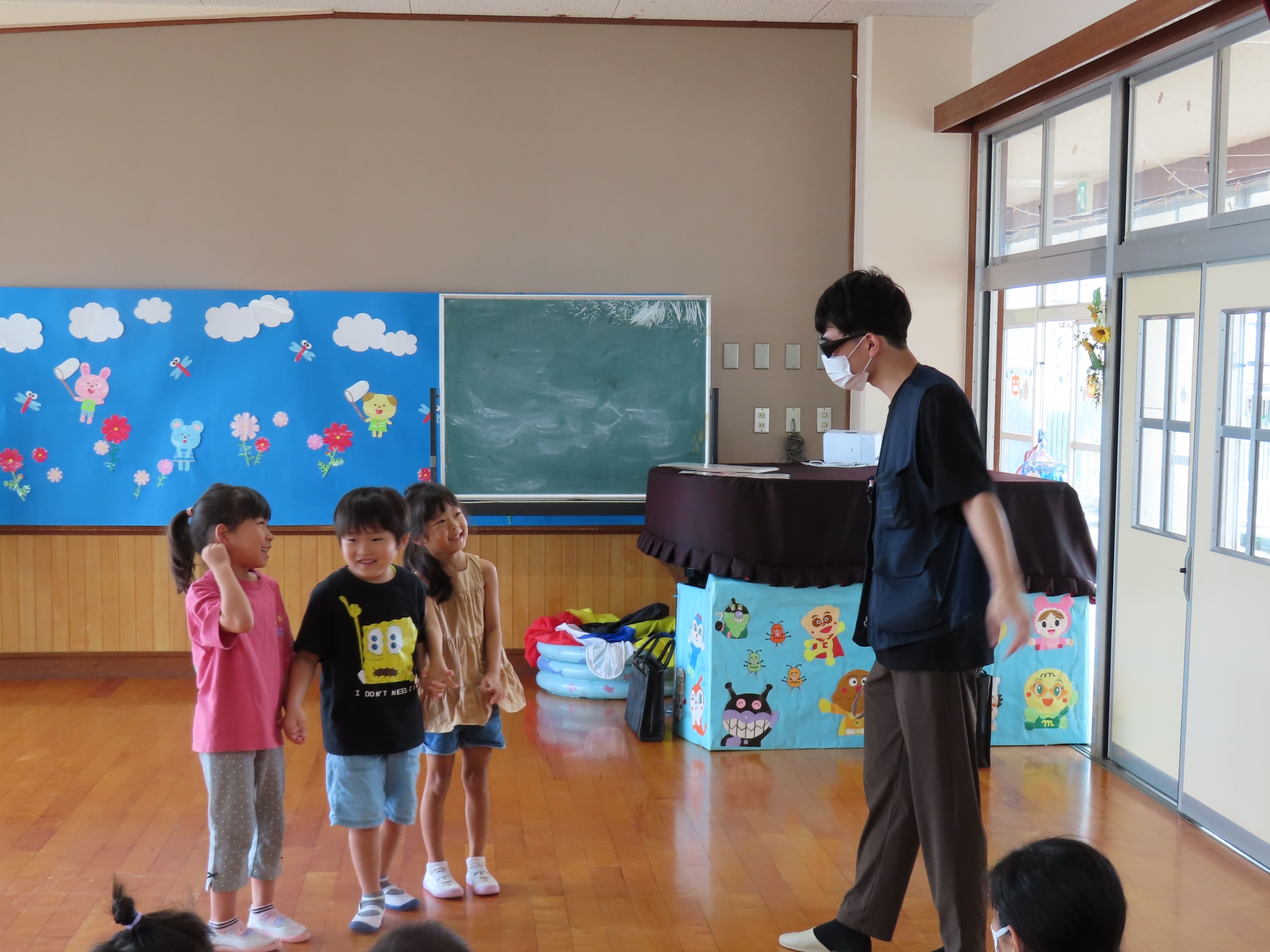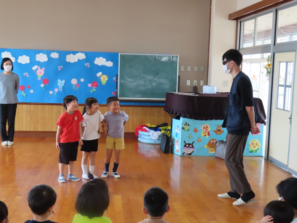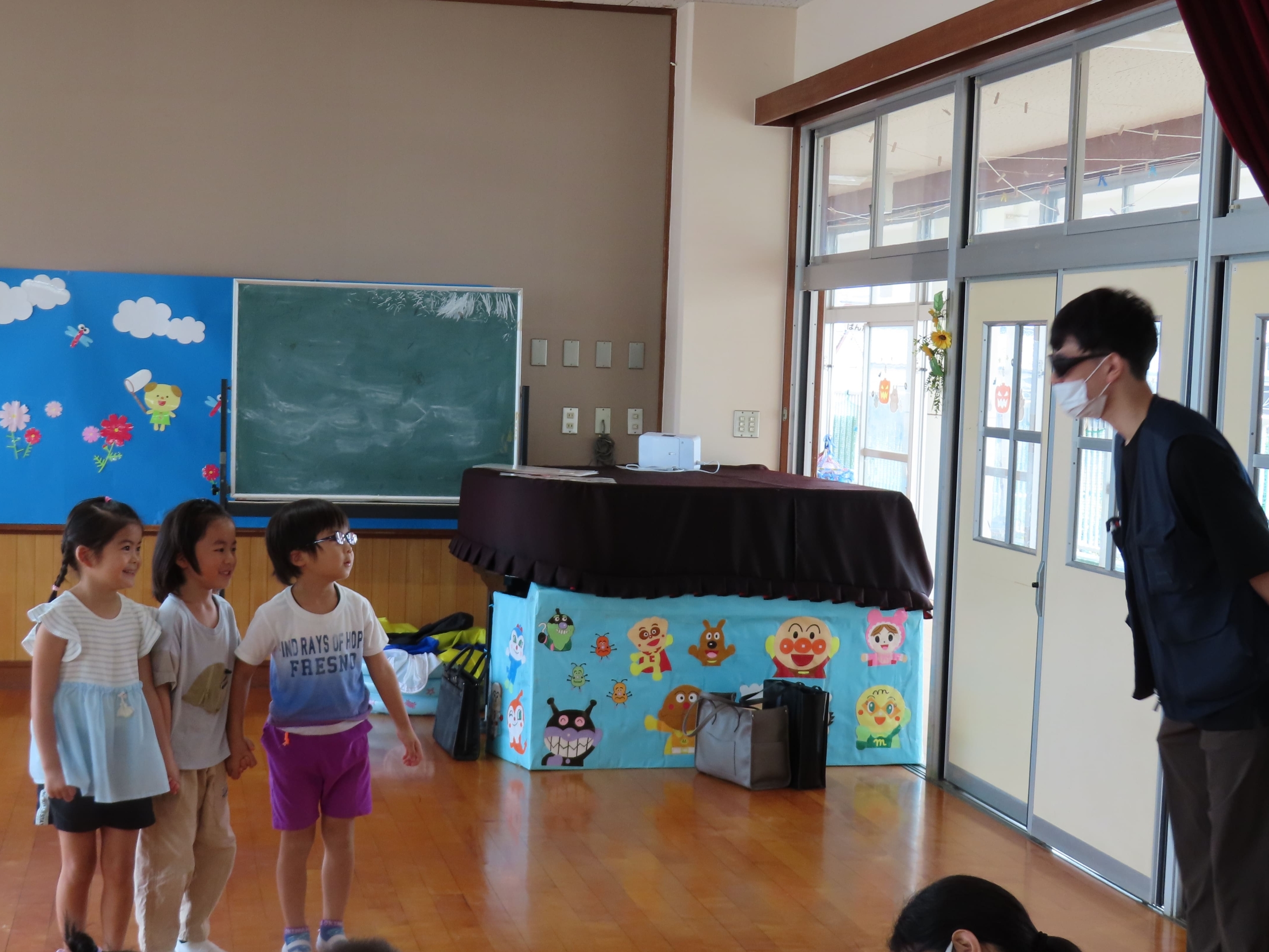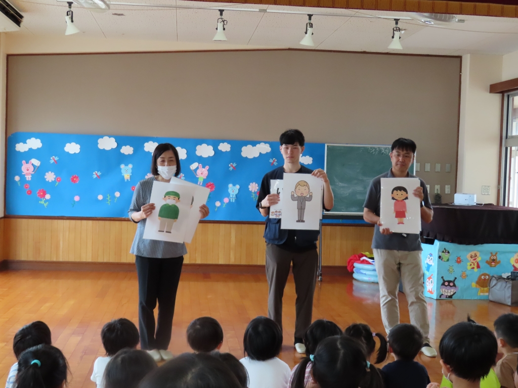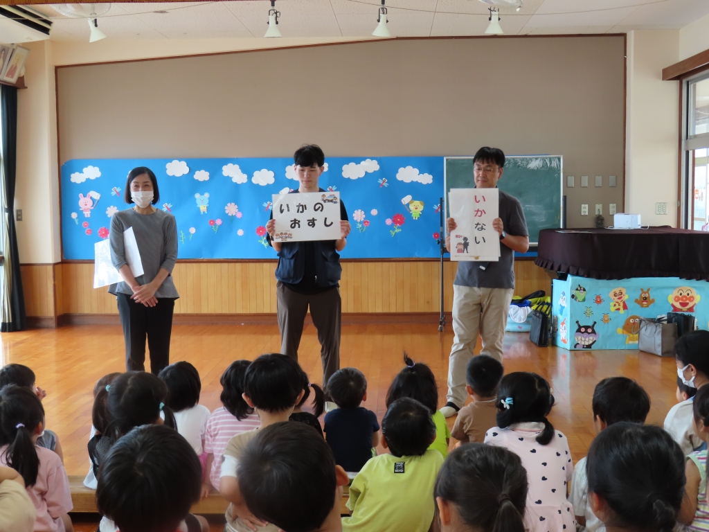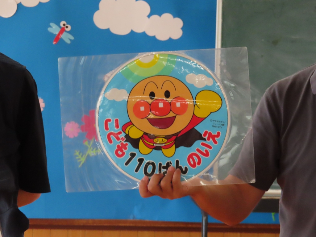「知らない人や不審者に声をかけられたら、アンパンマン『こども110ばんのいえ』のステッカーが貼ってある場所やスーパー、コンビニ、病院へ逃げたらいいよ」と教わり、子ども達は真剣に話を聞いていました。