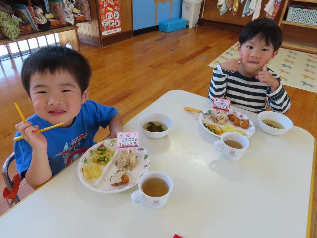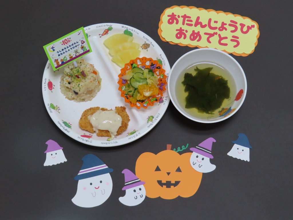 今月のお誕生会メニュー:秋の炊き込みご飯、魚のフライ、すまし汁、みかんサラダ、パイン缶