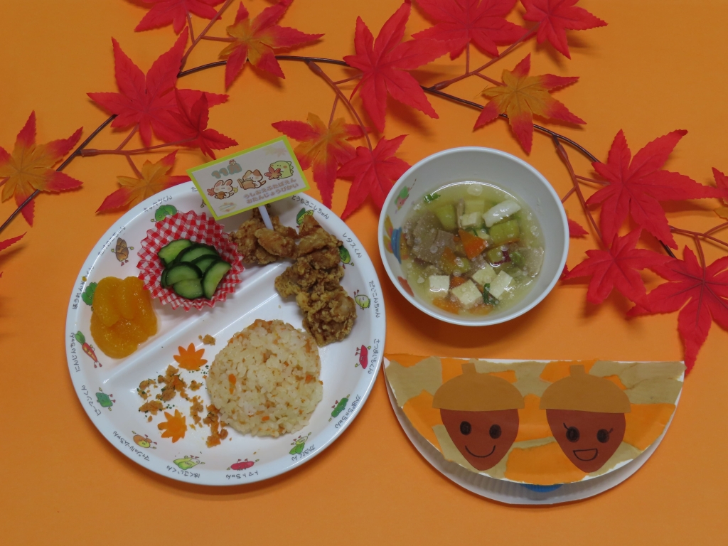 もみじごはん、若鶏唐揚げ、たたききゅうり、さつま汁、みかん缶♬