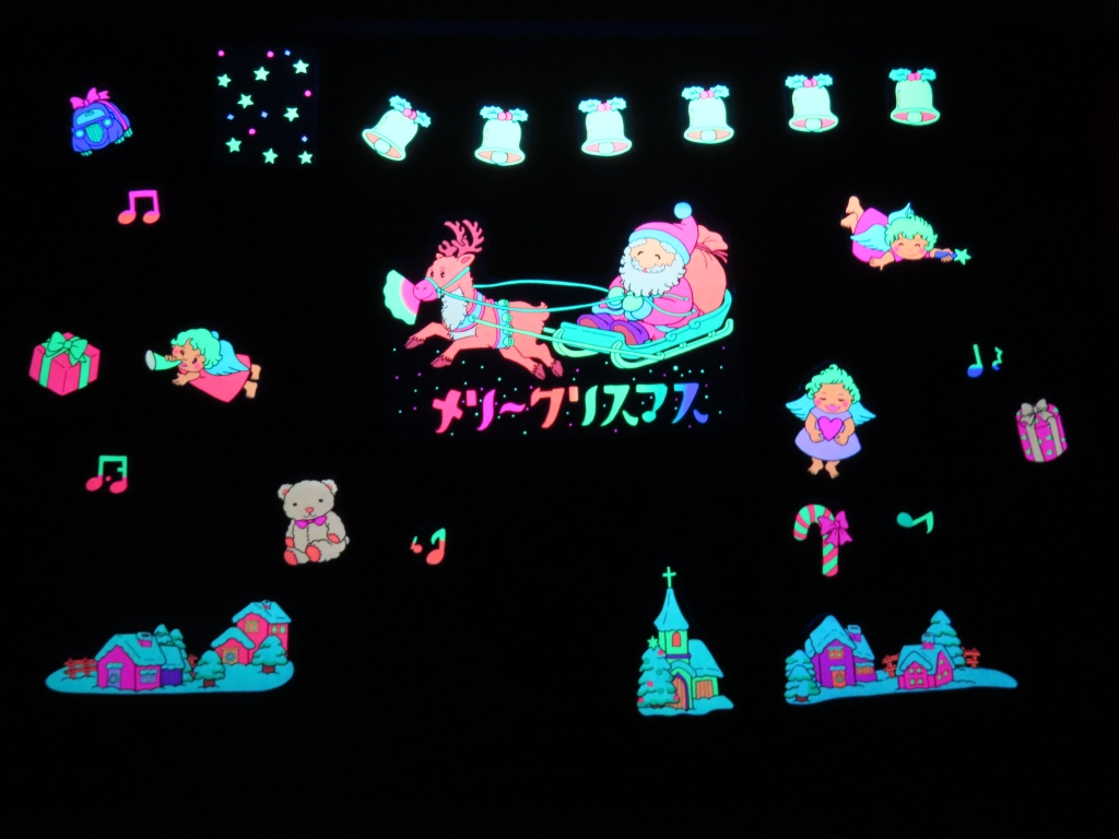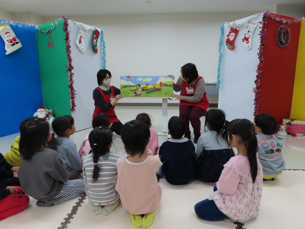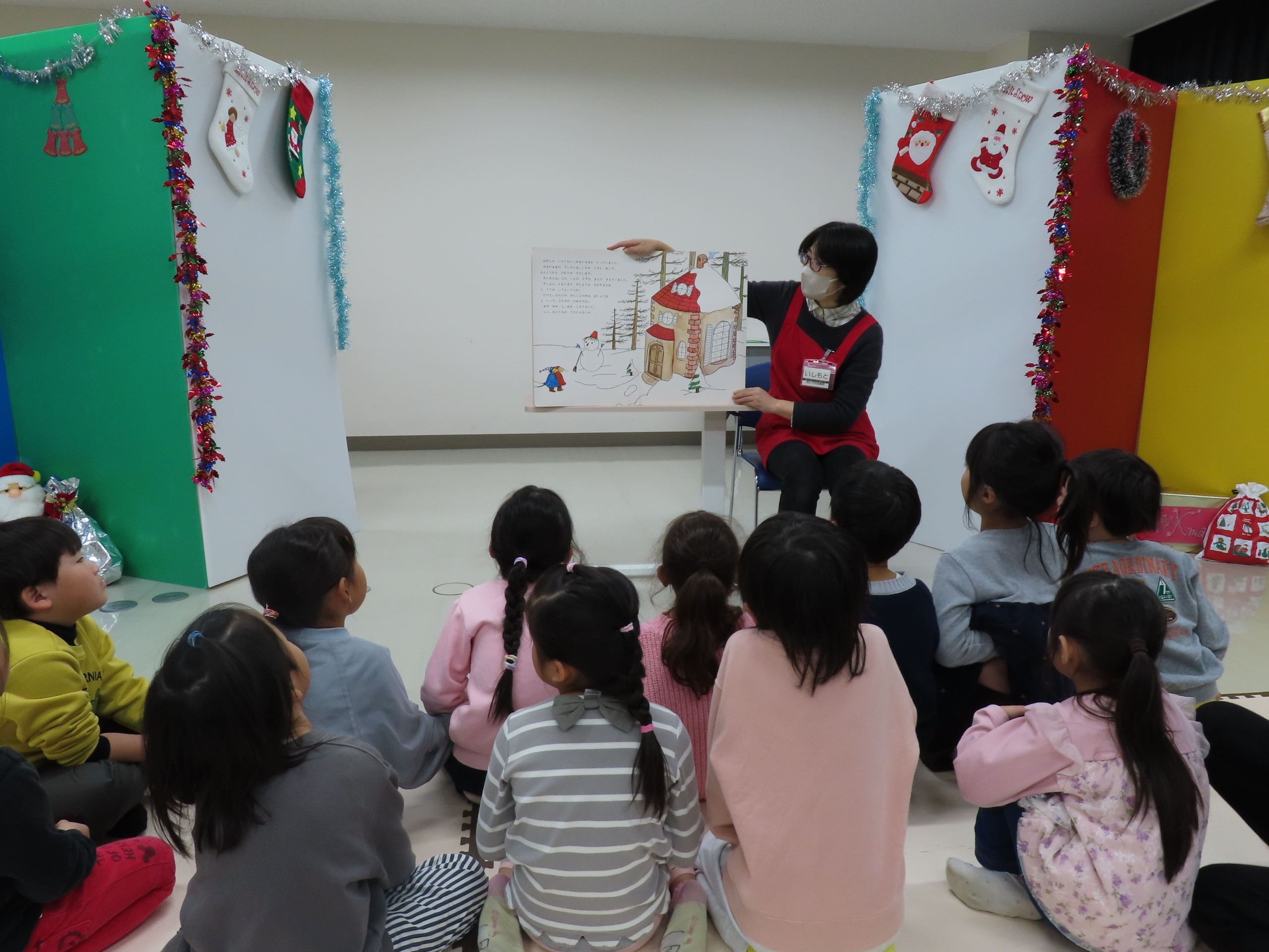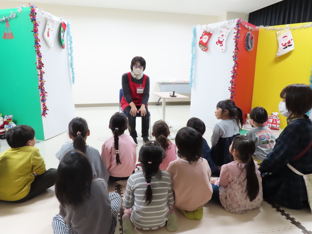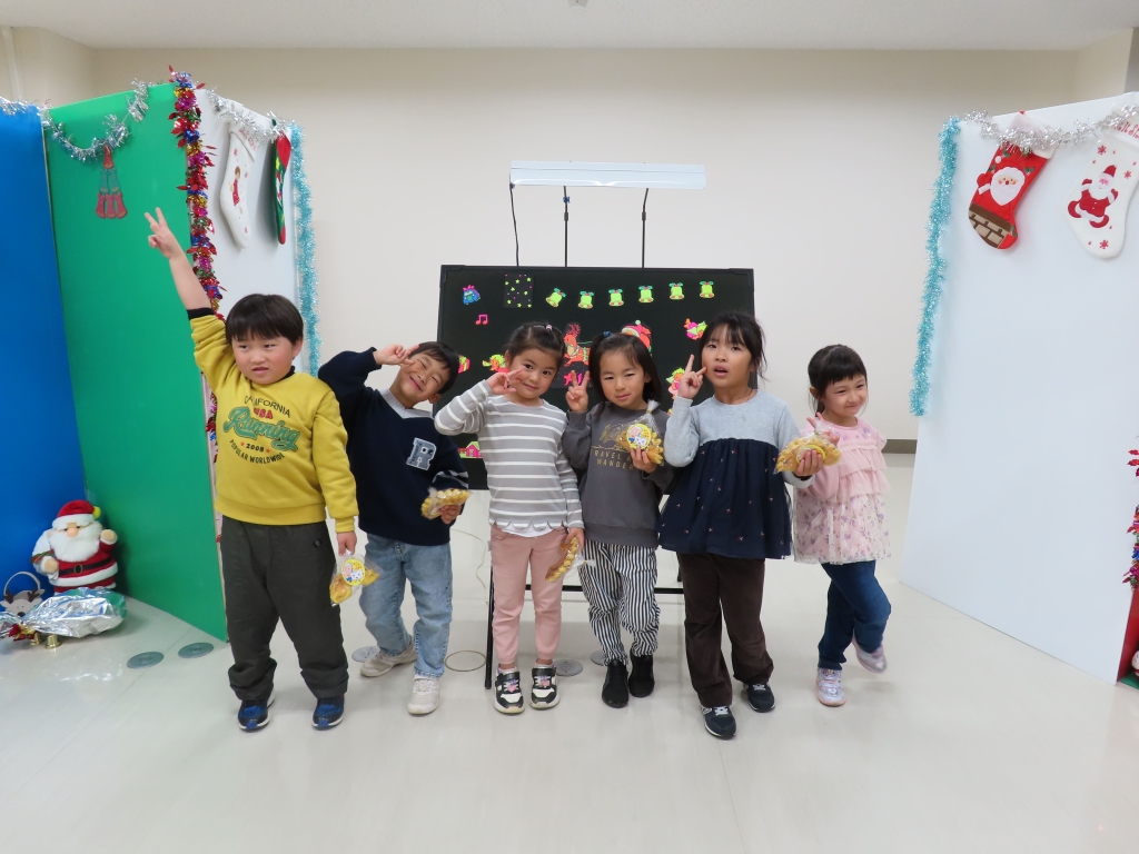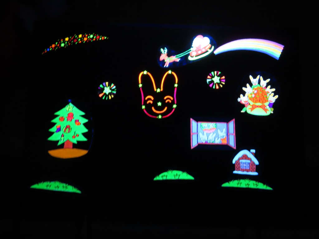 『うさぎのはらのクリスマス』の曲に合わせたブラックシアターや、クリスマスメドレーの合わせたブラックシアターに子ども達からは、「きれーい♡」「どうやって出しゆうが?」「マジックみたい~!すごーい!!」と大歓声が上がっていました。