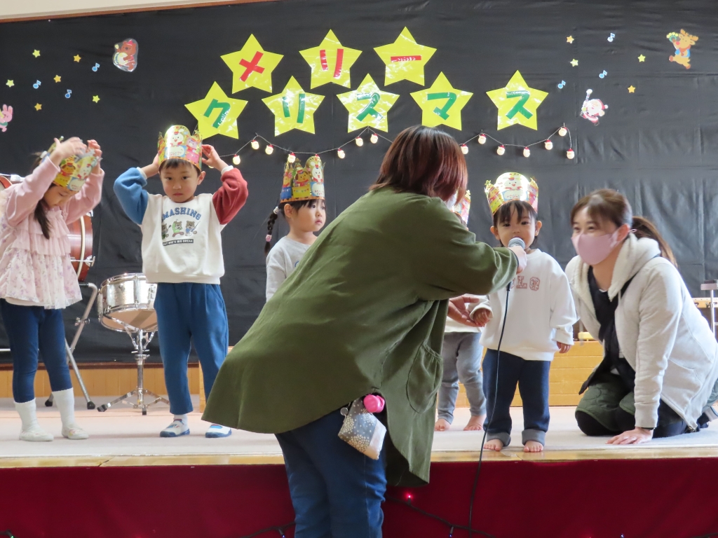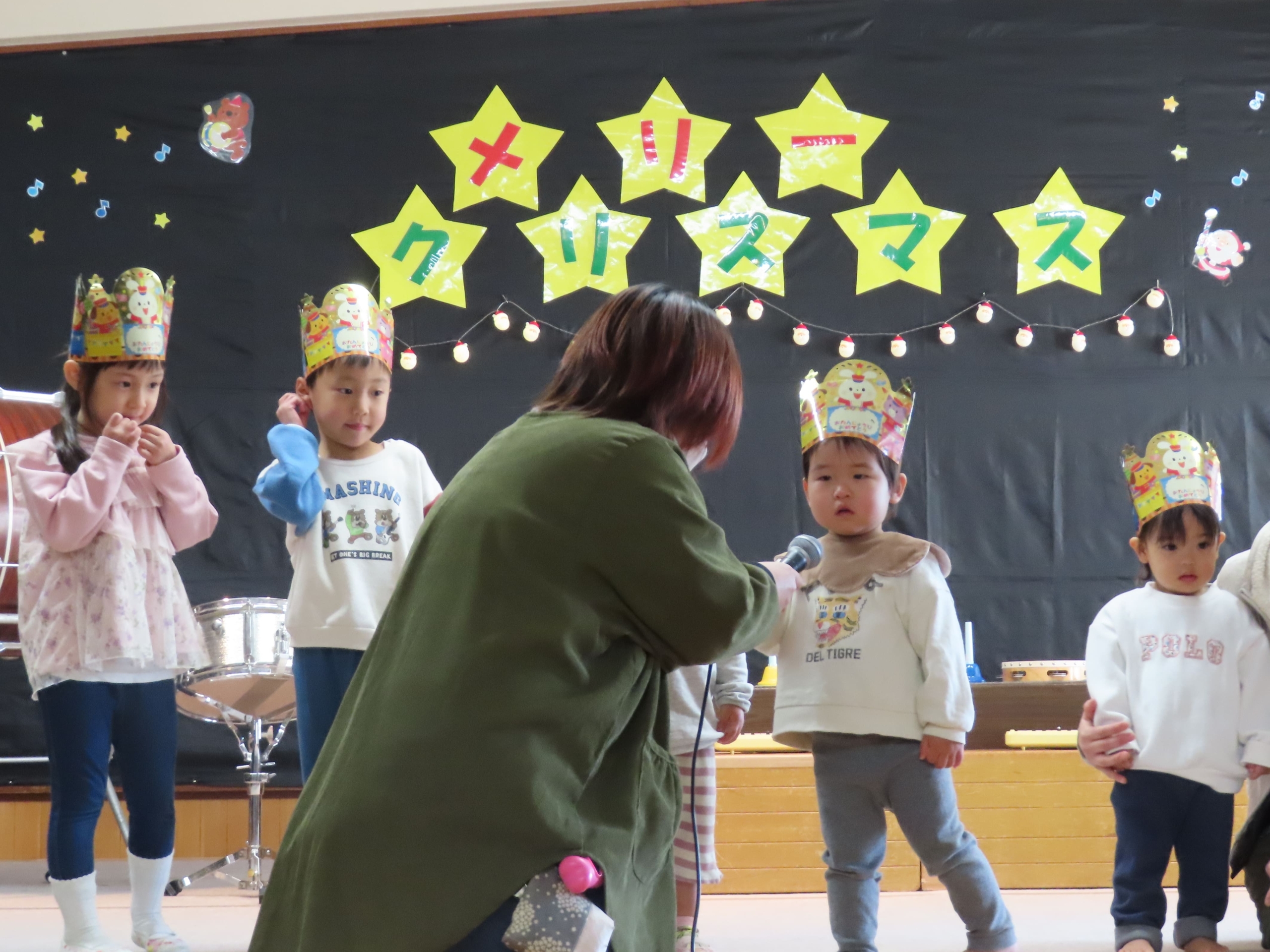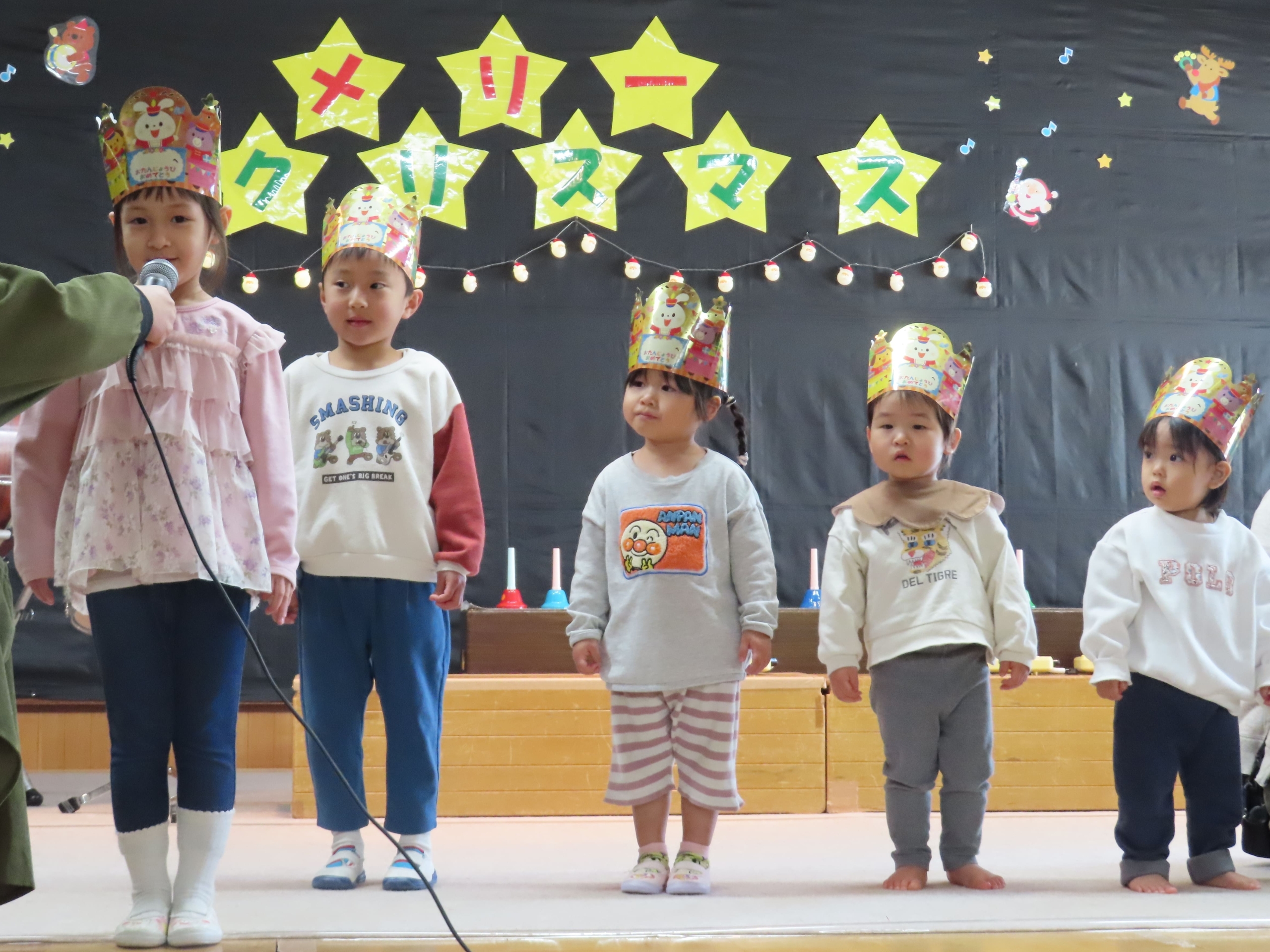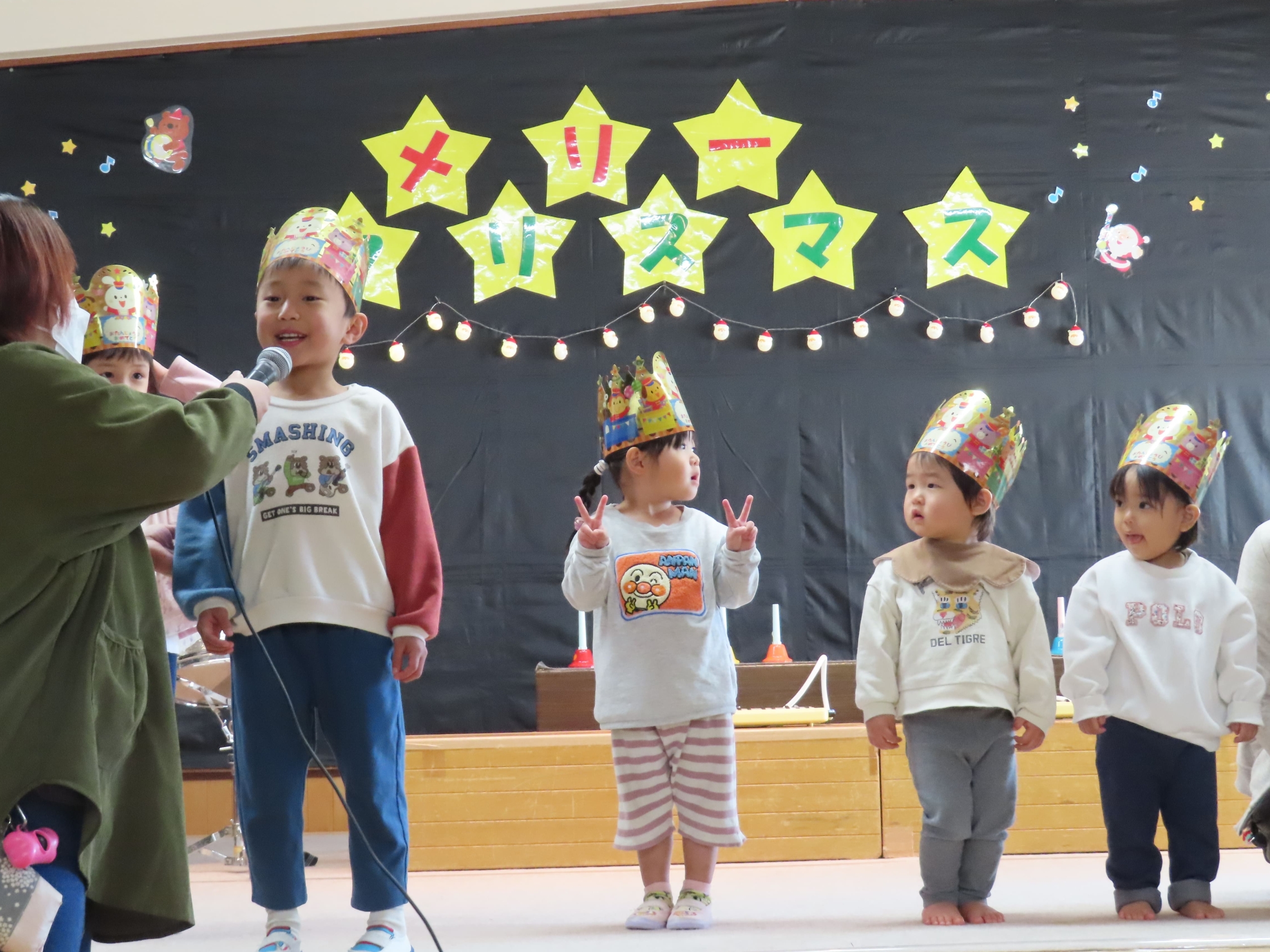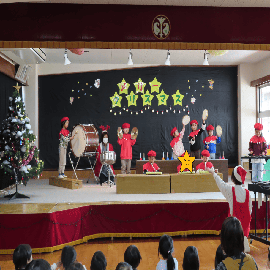 さくら組とそら組の子ども達が『あわてんぼうのサンタクロース』を歌い、その後には、そら組が発表会で披露した『ミッキーマウスマーチ』を演奏しました。