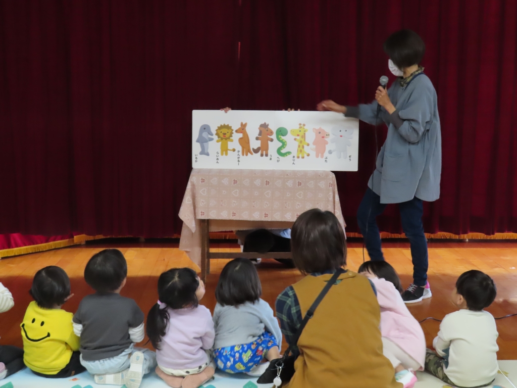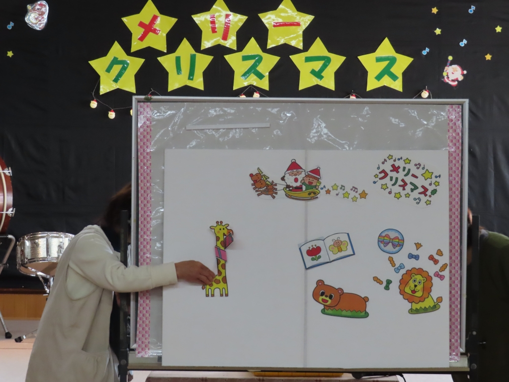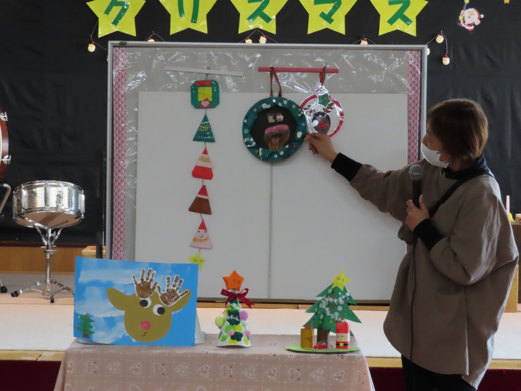 大型絵本やペープサートを見たり、各クラスのクリスマス制作を見せ合って楽しみました。