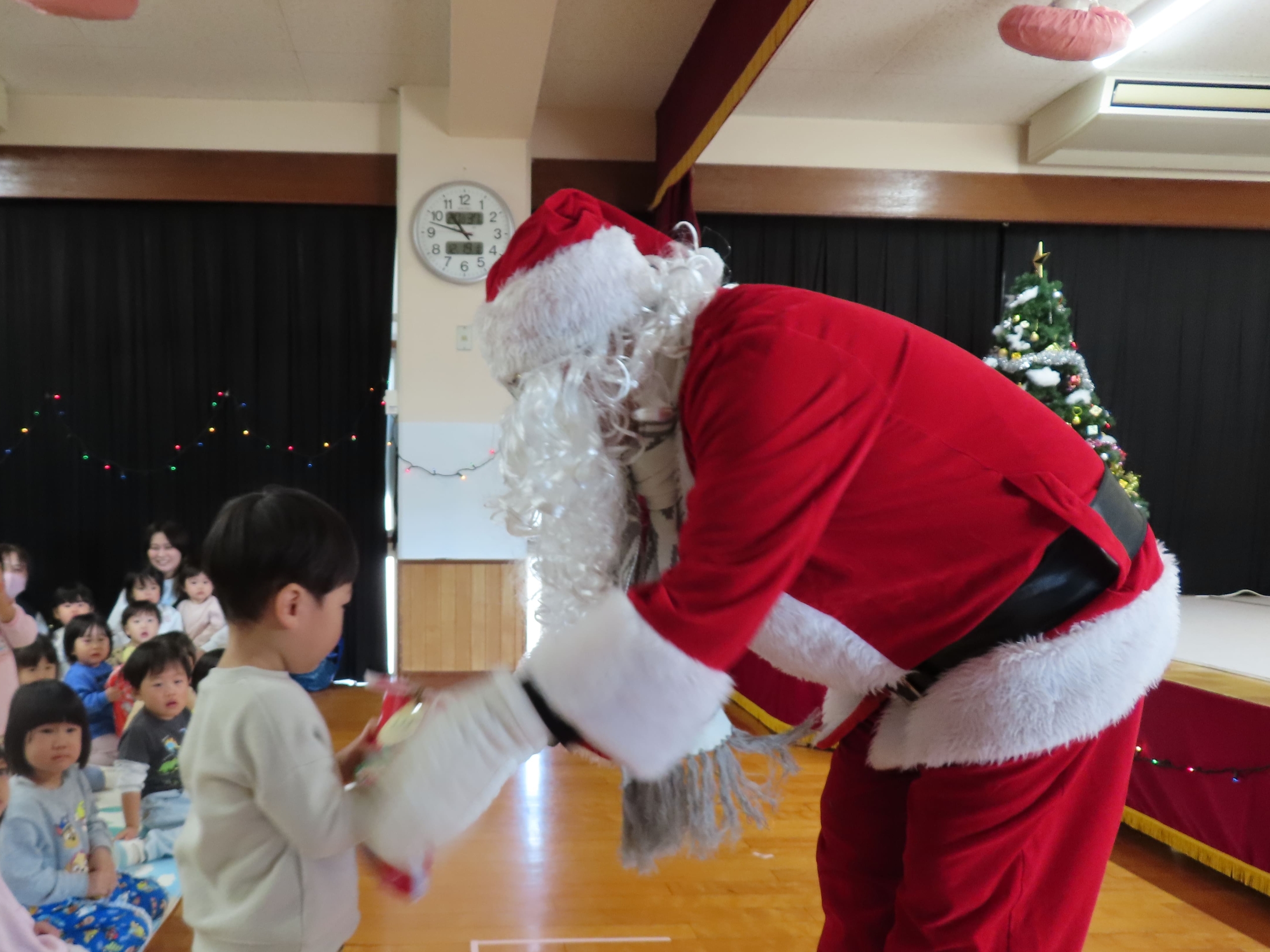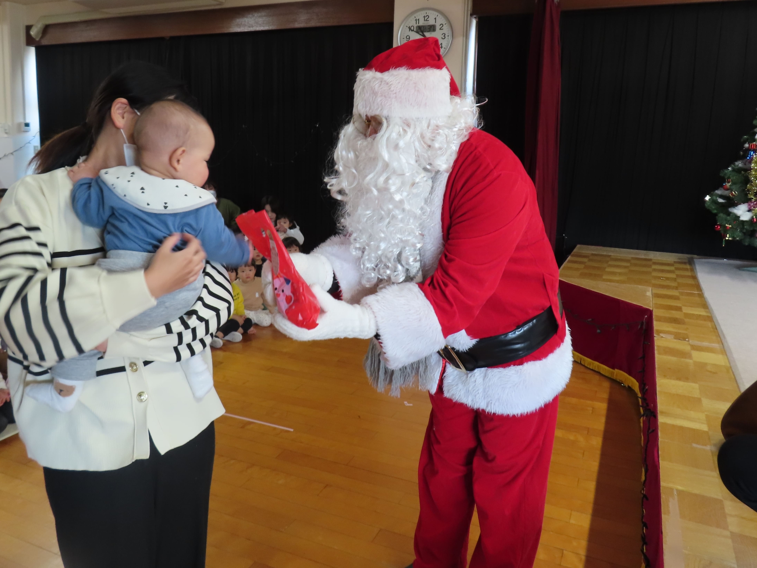 見慣れないサンタさんを前に乳児組の子ども達は、固まったり、驚いて泣き出したりもしましたが、みんなプレゼントをもらうと嬉しそうでした☆