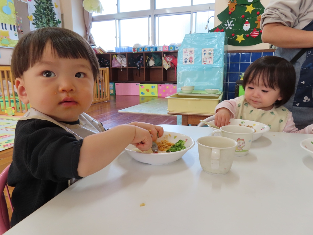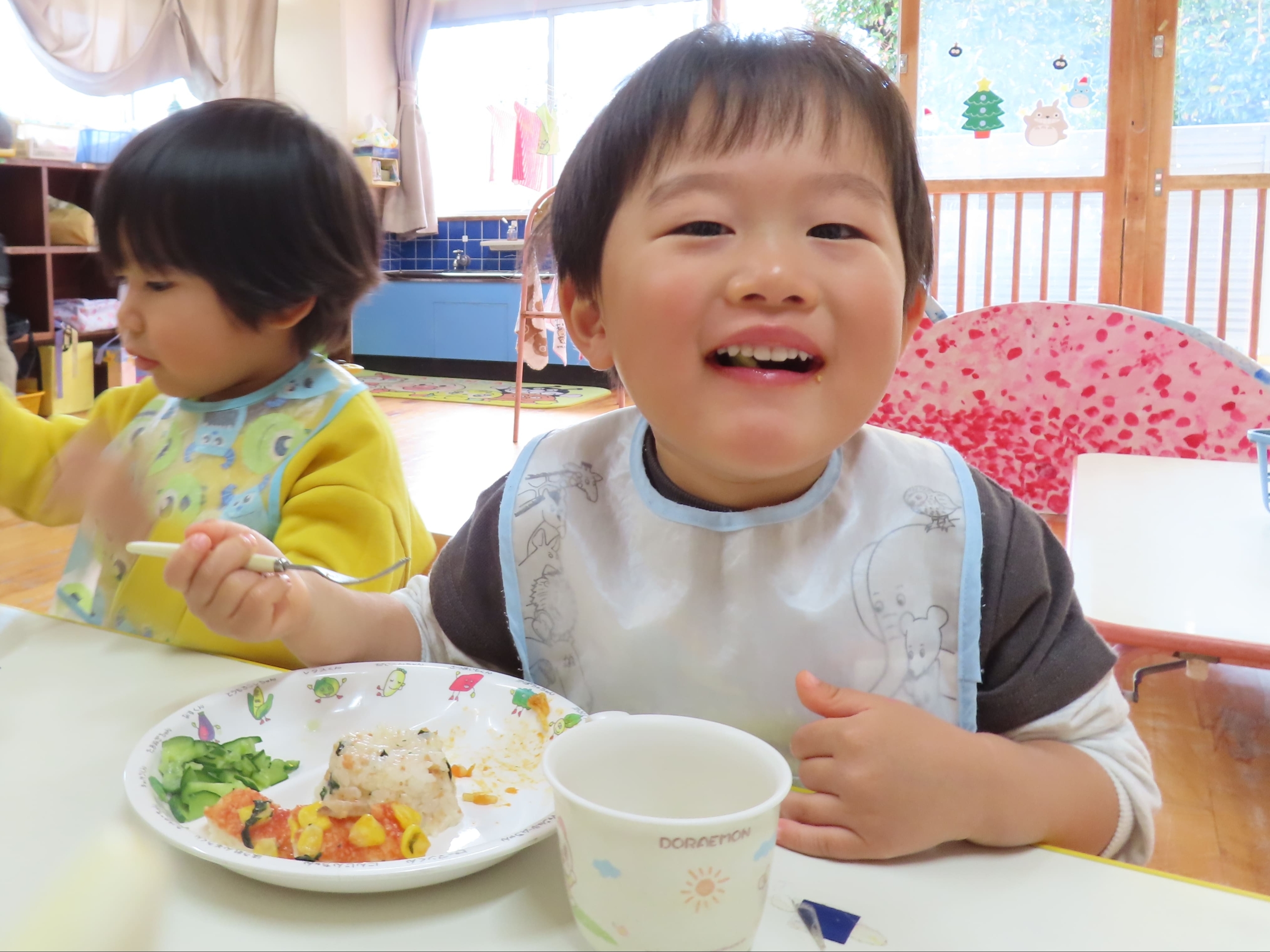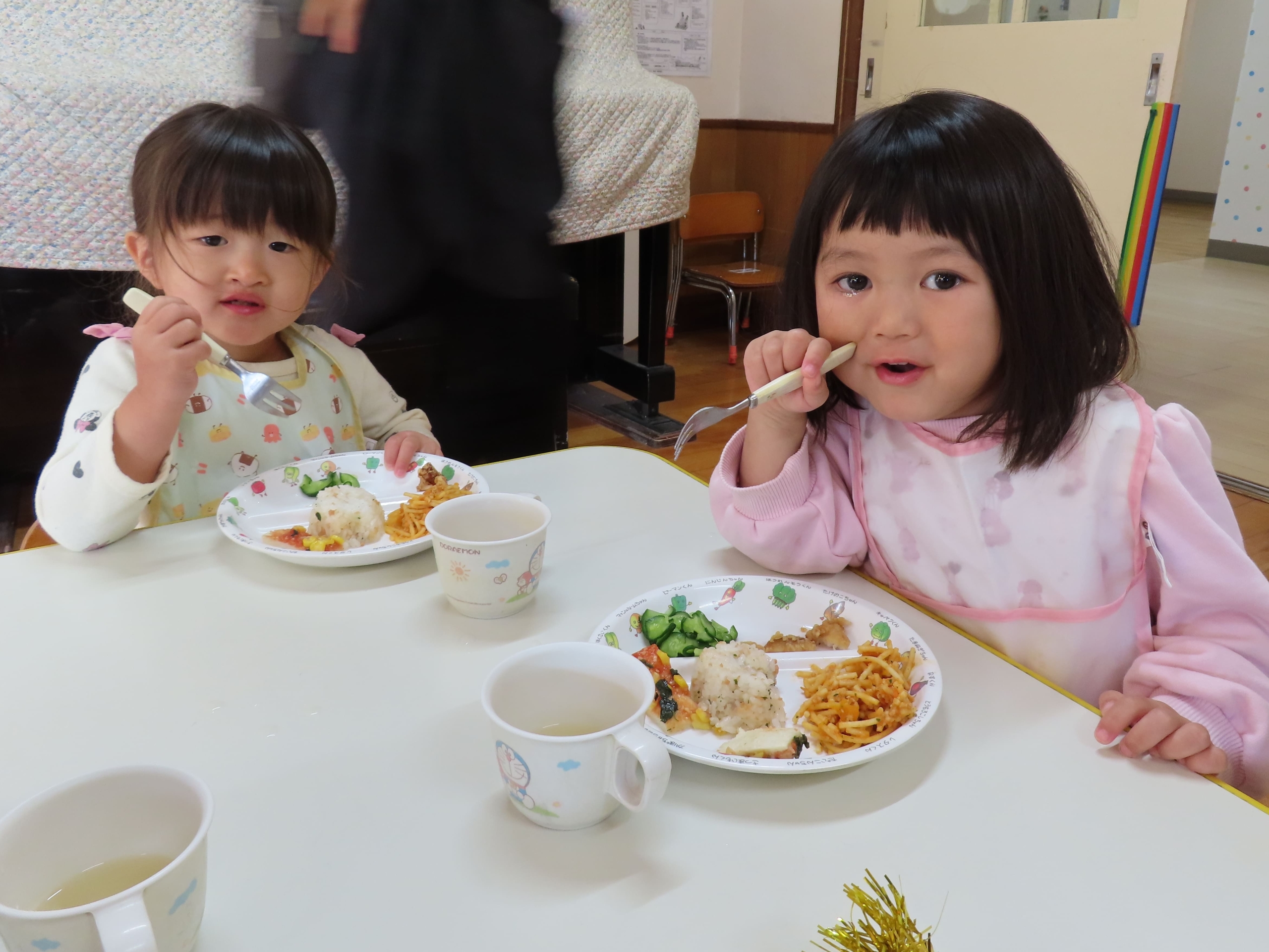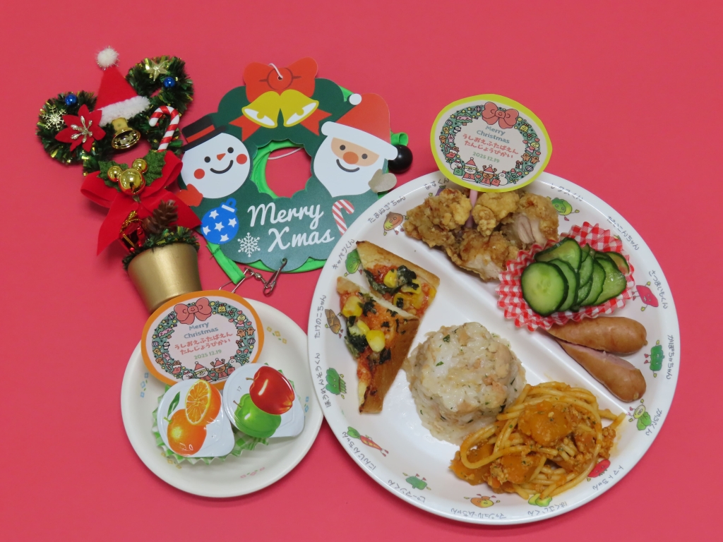 今日は、クリスマスパーティーメニューでした。豪華なごちそうに、「おいしい」「おかわりほしい!」と大喜びで食べていました。
