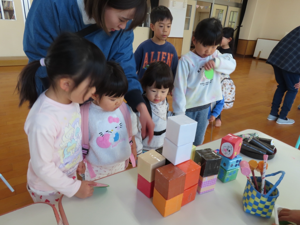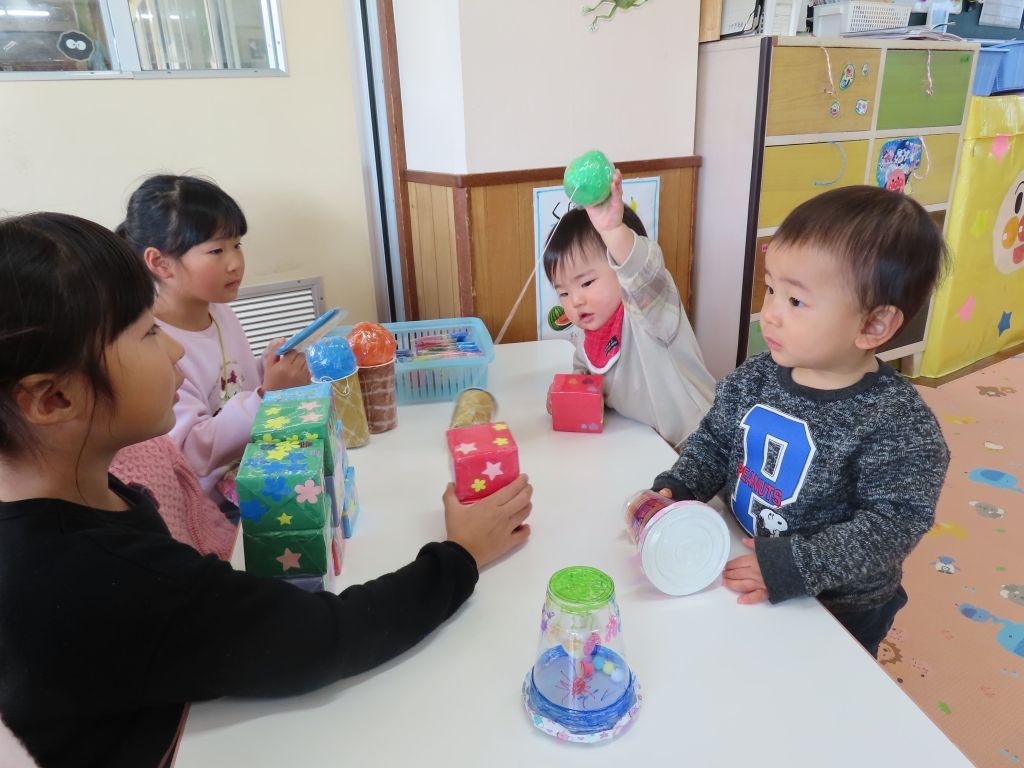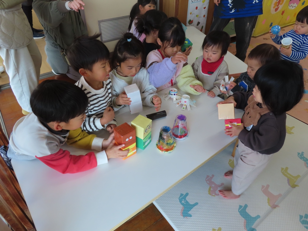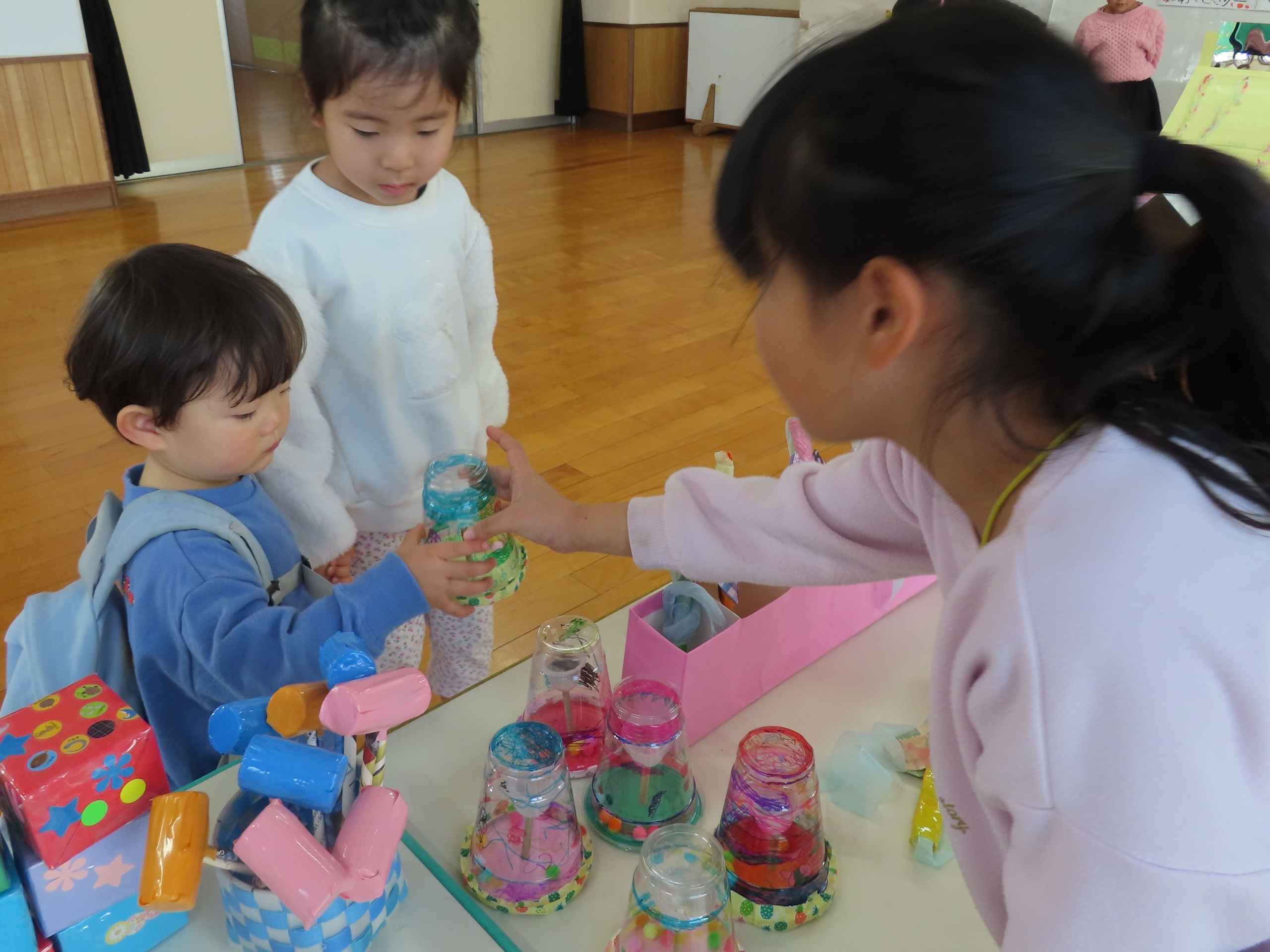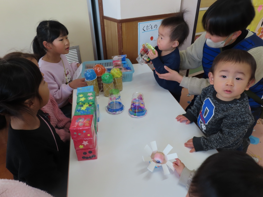 「こうやってあそぶがで!」「これ、おもしろいよ♡」と優しく教えてくれながら売り子さんをしていたそら組さん。つぼみ組の子ども達も、たくさんの手作りおもちゃに興味津々。さっそく手に取り、遊んでいました。