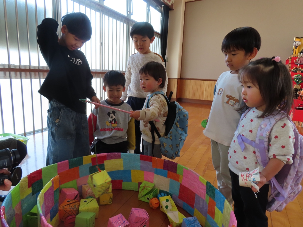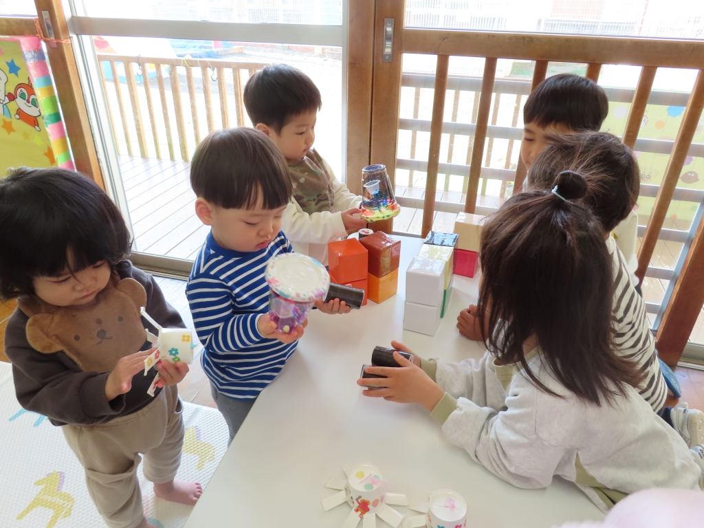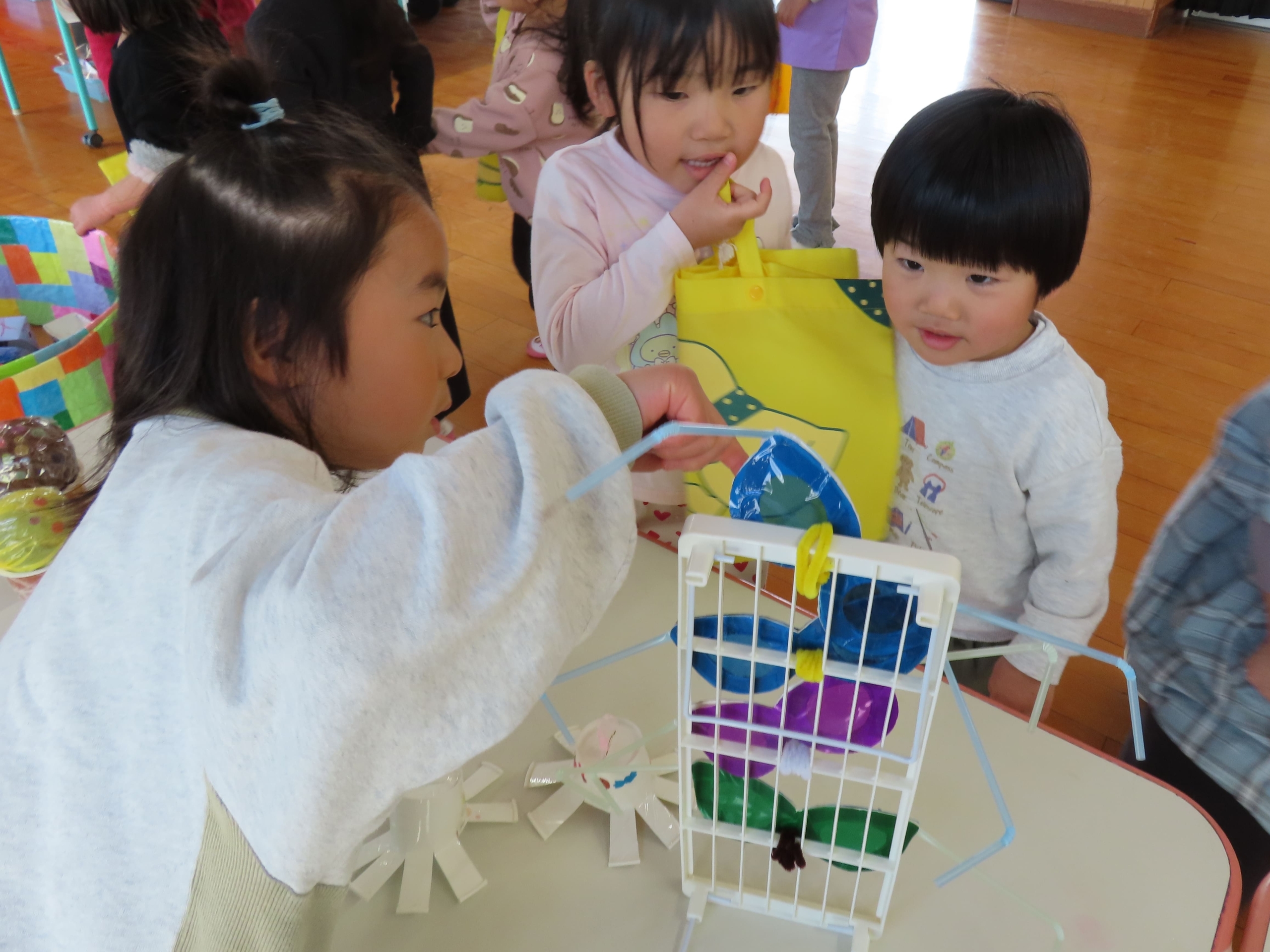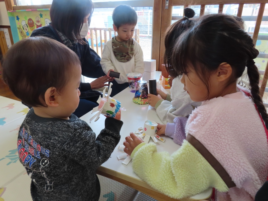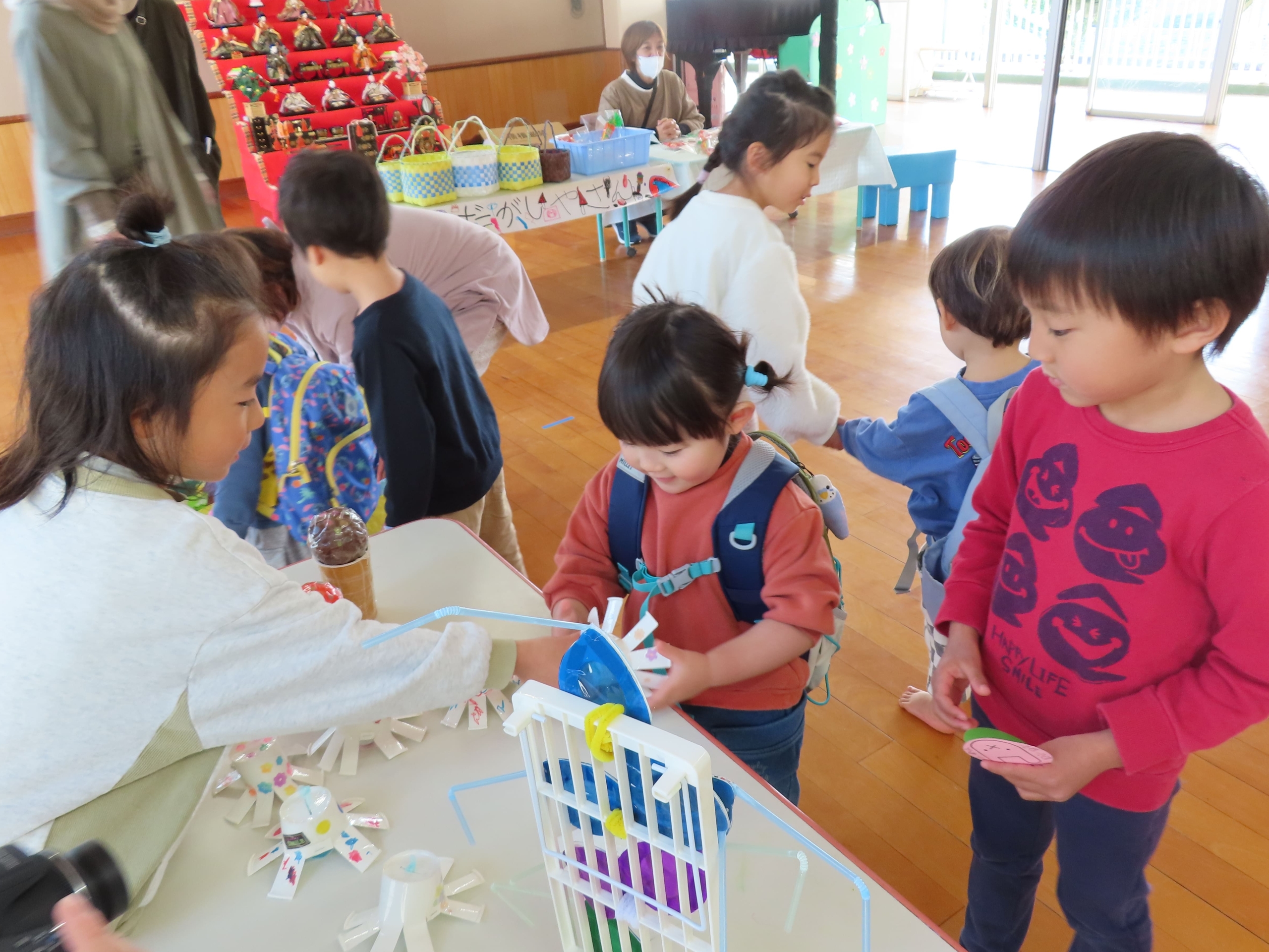 「こうやってあそぶがで!」「これ、おもしろいよ♡」と優しく教えてくれながら売り子さんをしていたそら組さん。つぼみ組の子ども達も、たくさんの手作りおもちゃに興味津々。さっそく手に取り、遊んでいました。