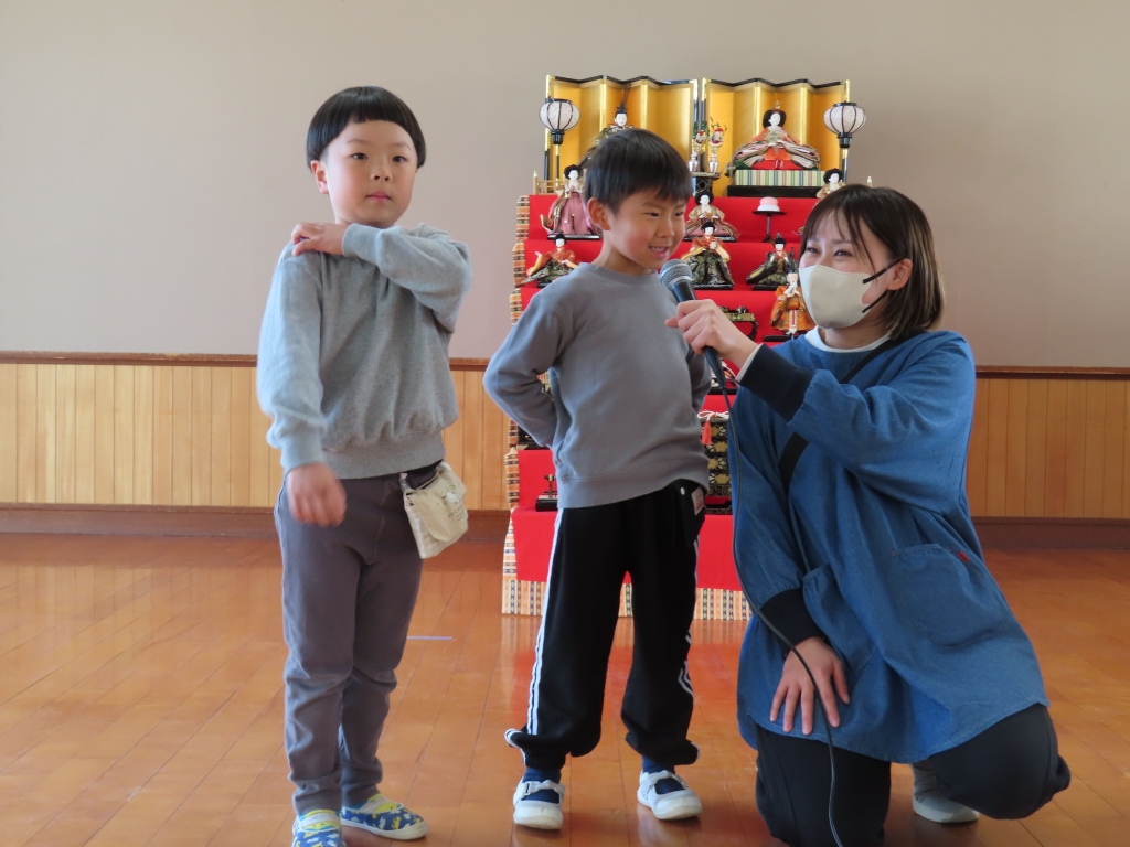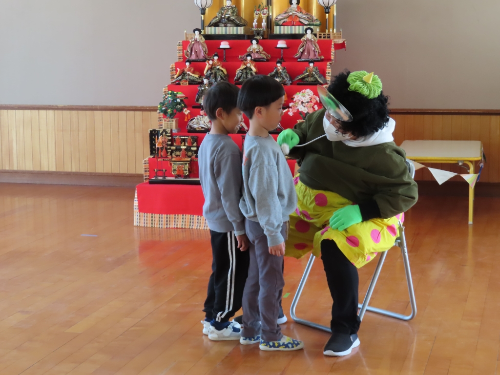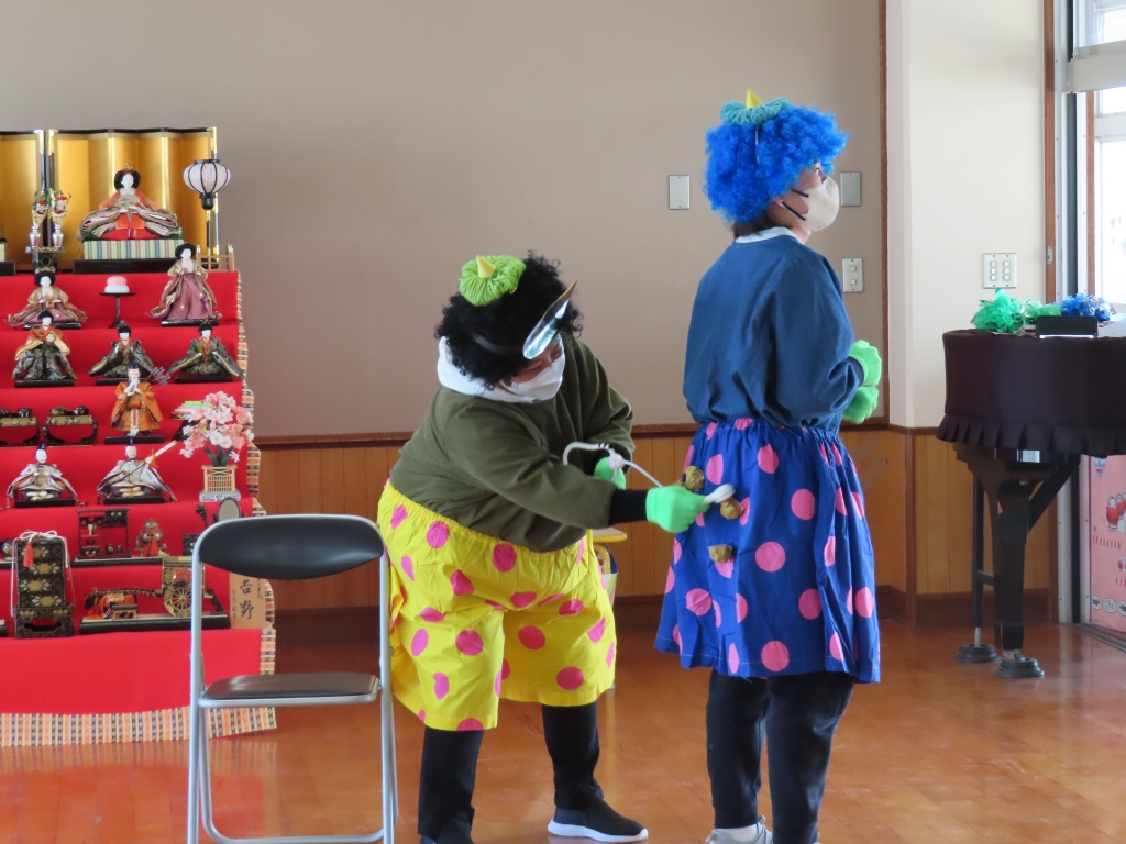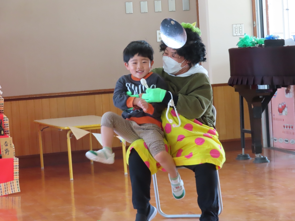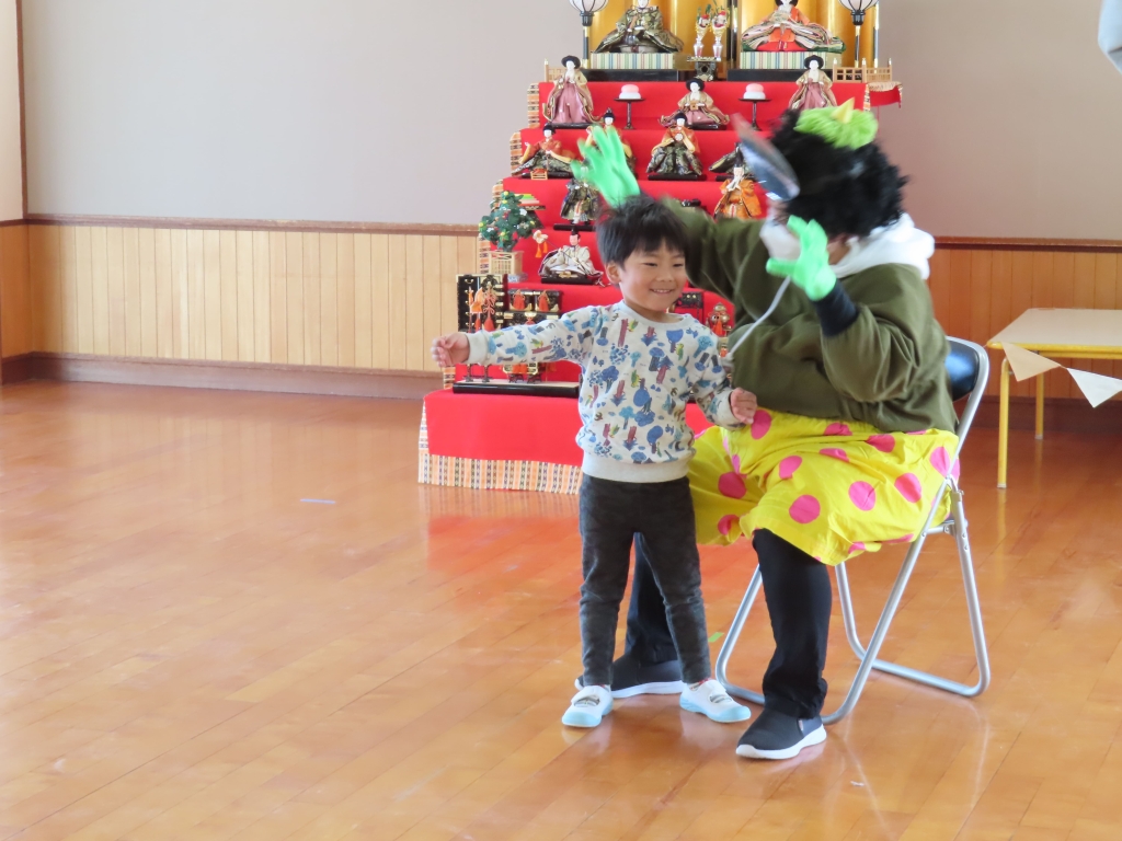 少しびっくりするお友だちもいましたが、「痛い所を治してくれる優しい鬼のお医者さんだよ~」と言うと、安心したようで、歌に合わせて治していく面白い鬼さんを見て、大笑いしていた子ども達でした。