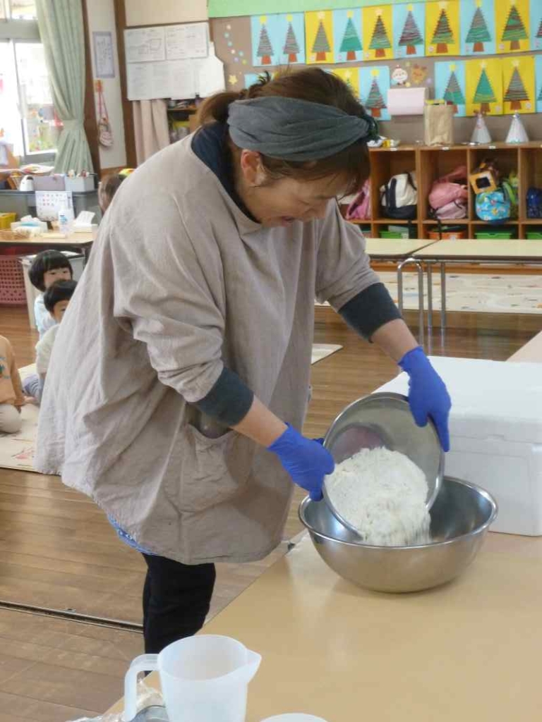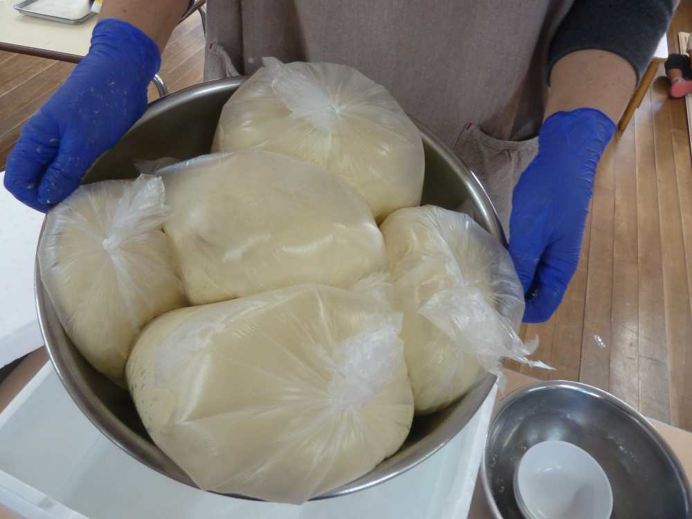 材料を混ぜて発酵させるとプクプクと大きくなっています。子どもたちに触ってもらうと「フワフワで気持ちいいな~」と言っていました。
