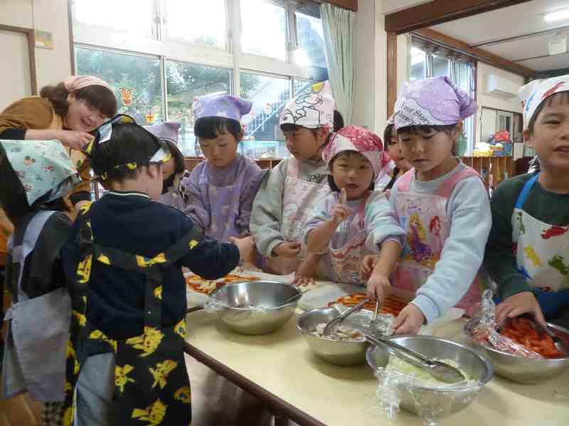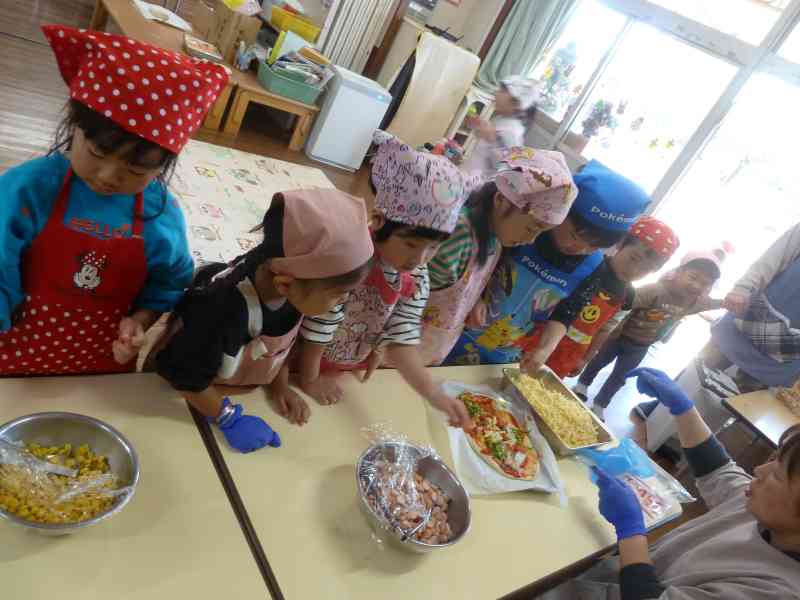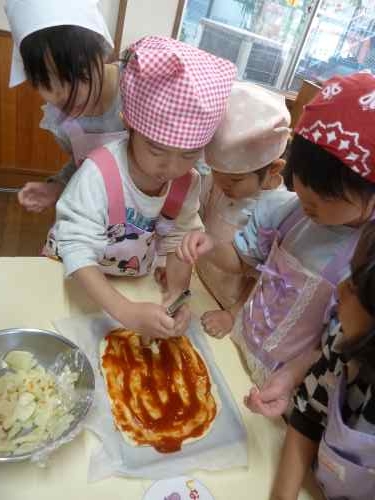 にじ組さんほし組さん混合のグループに分かれて生地をのばして好きな具材をのせていきます。どんなピザができるかな??みんな具材を選ぶのも楽しそうです。