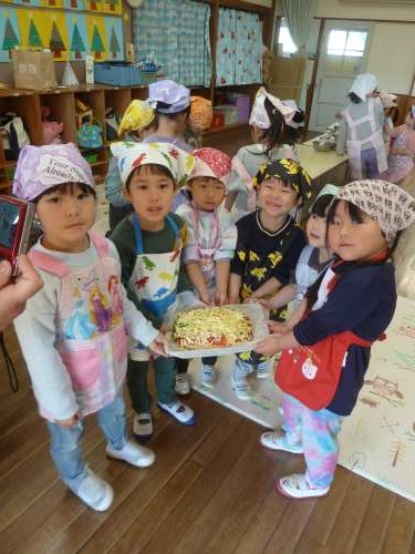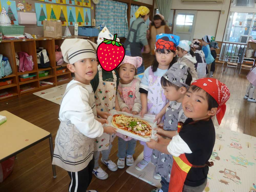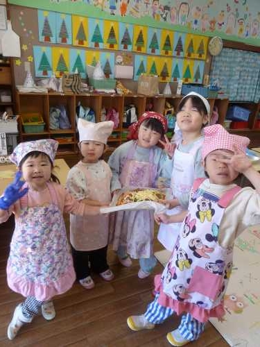 12月18日(木)にピザパーティーをしました。エプロンと三角巾をつけてスタンバイOKです。