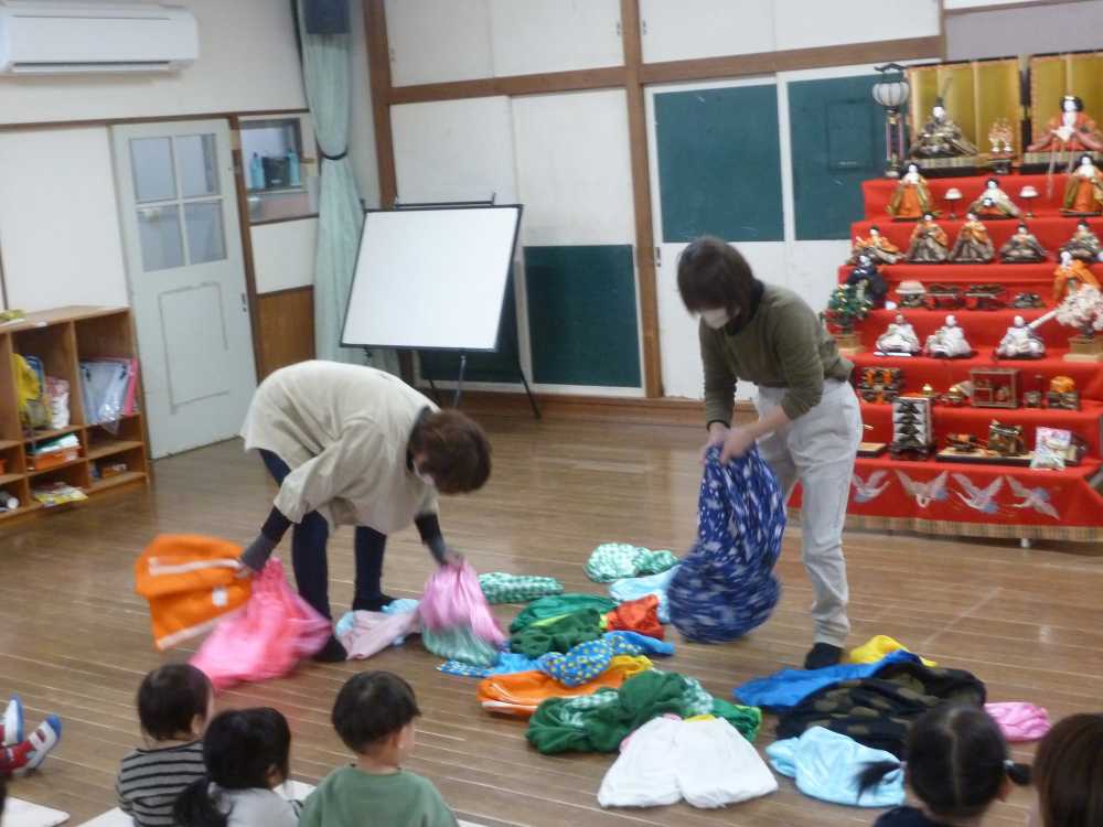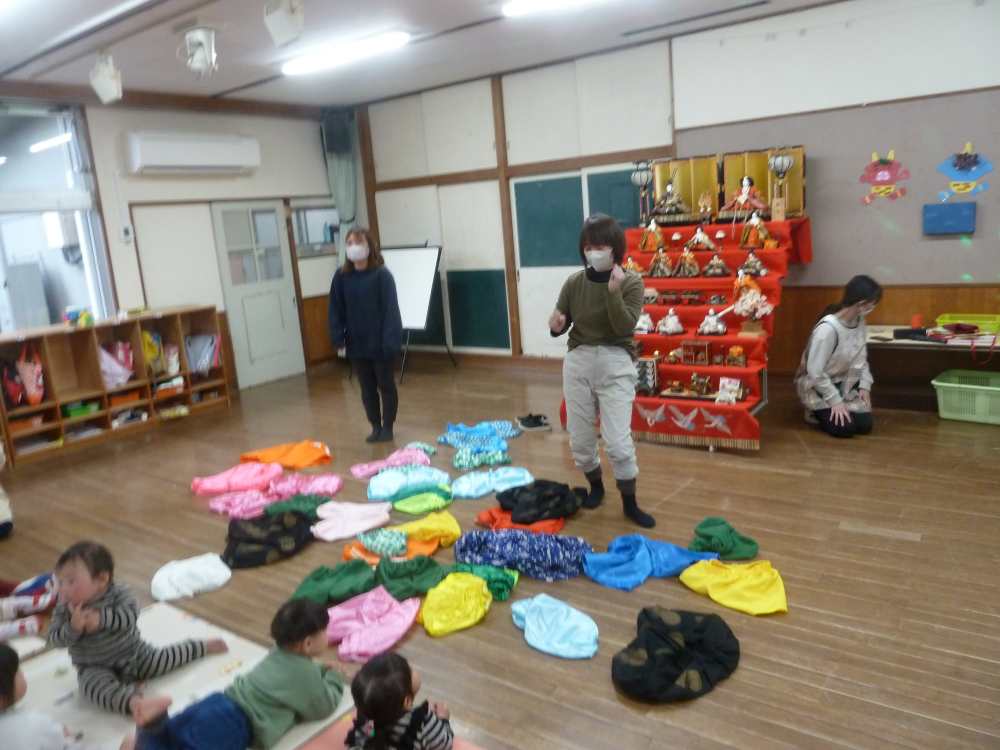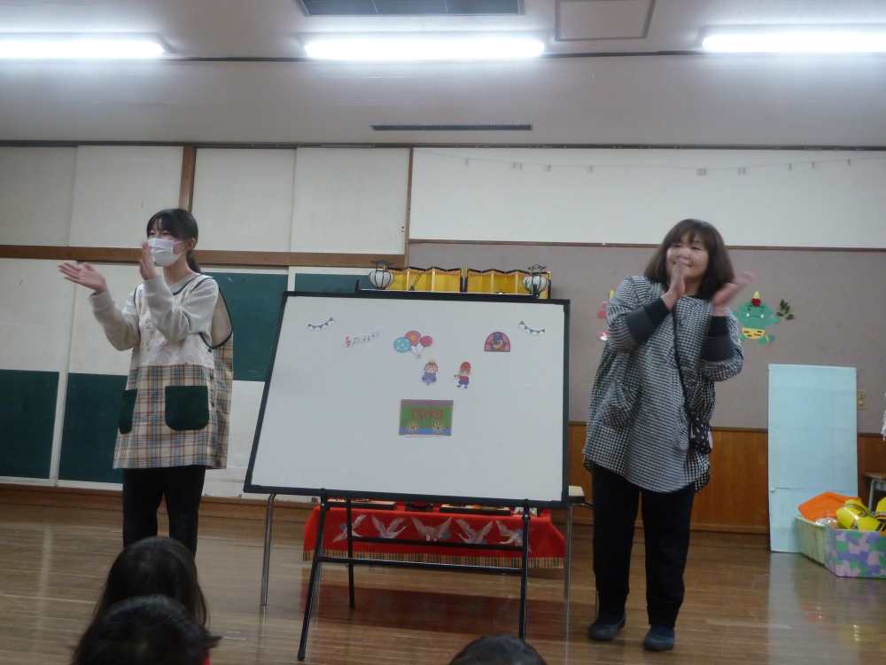 おもちゃのチャチャチャに合わせてパネルシアターが始まりました。みんな曲に合わせてニコニコで踊っていましたよ。